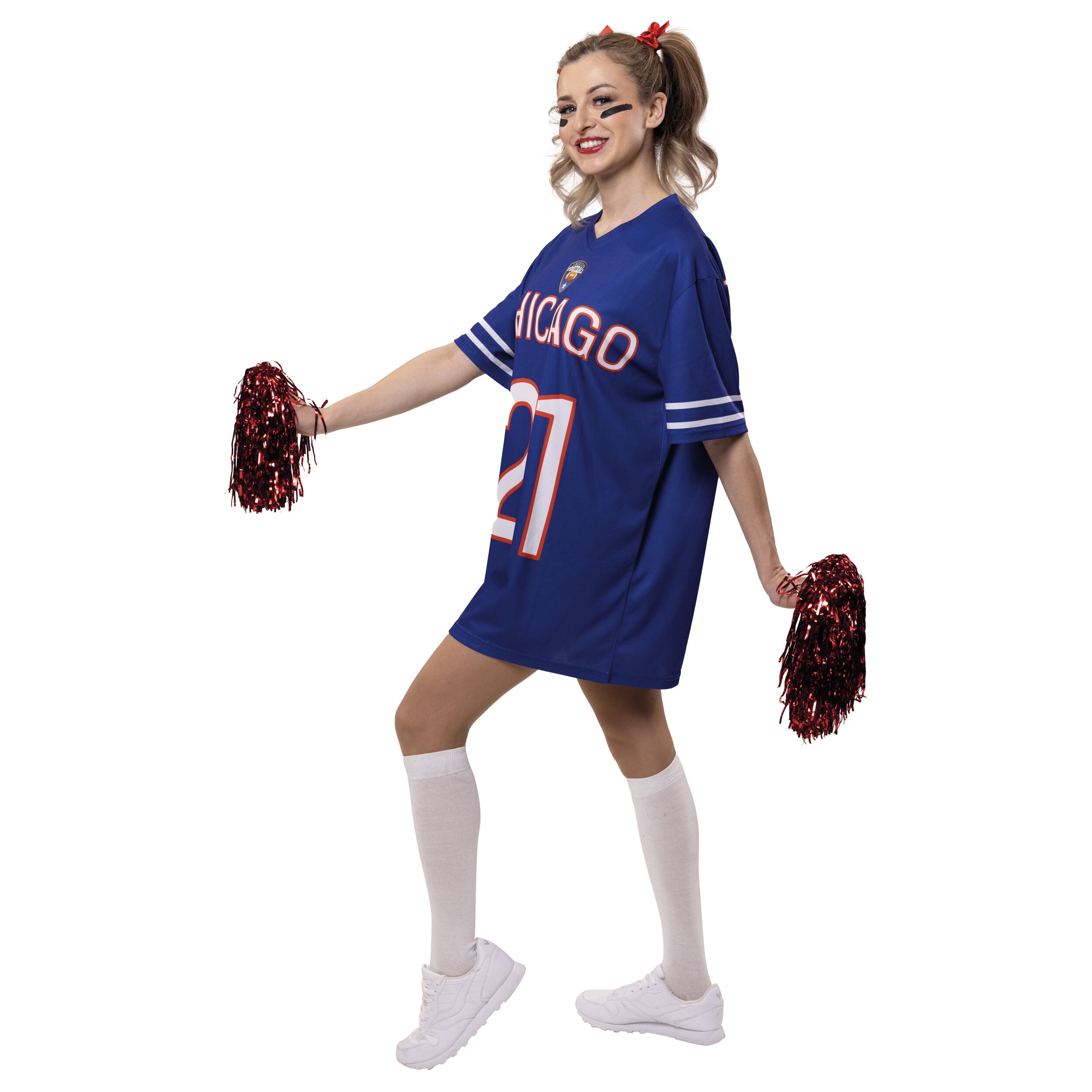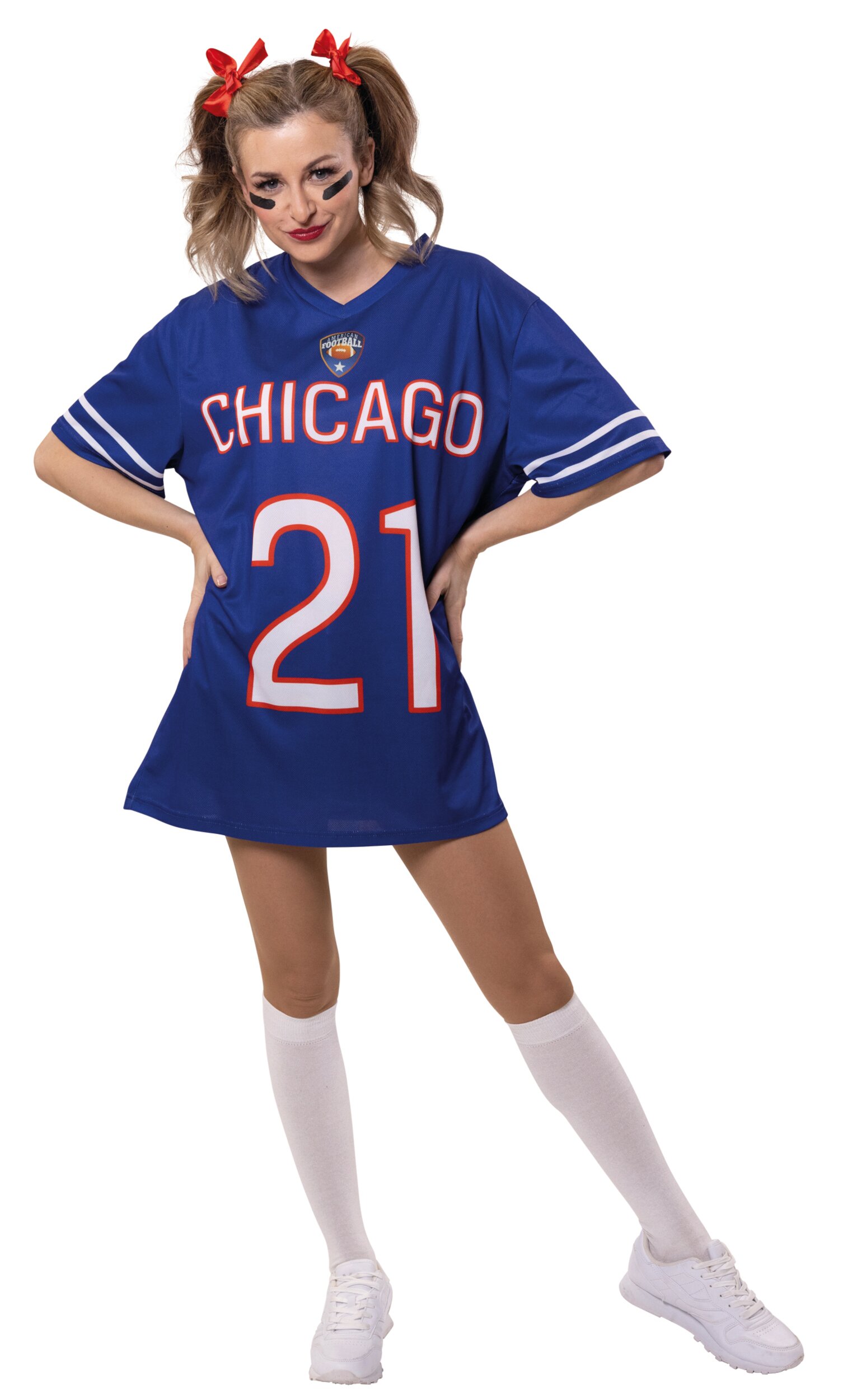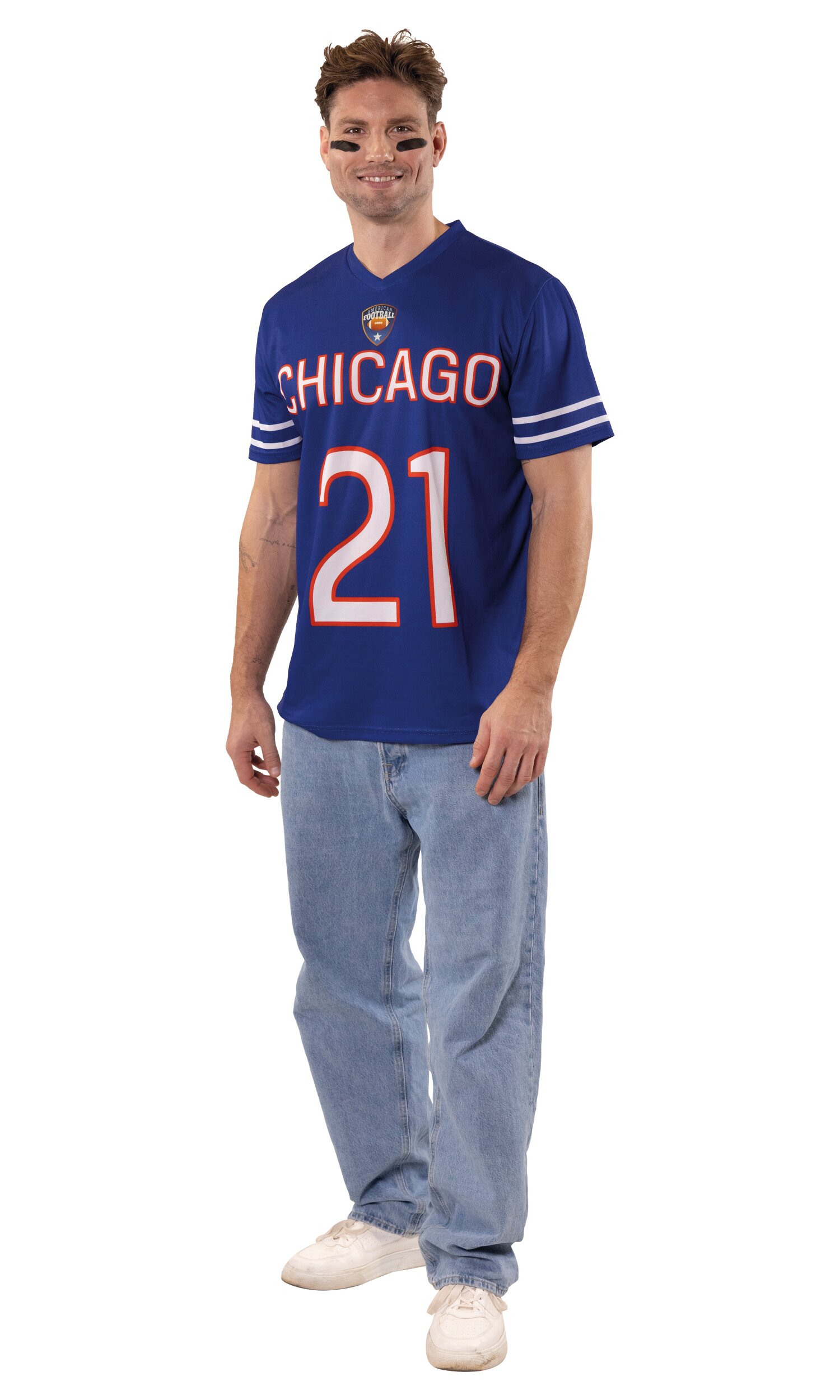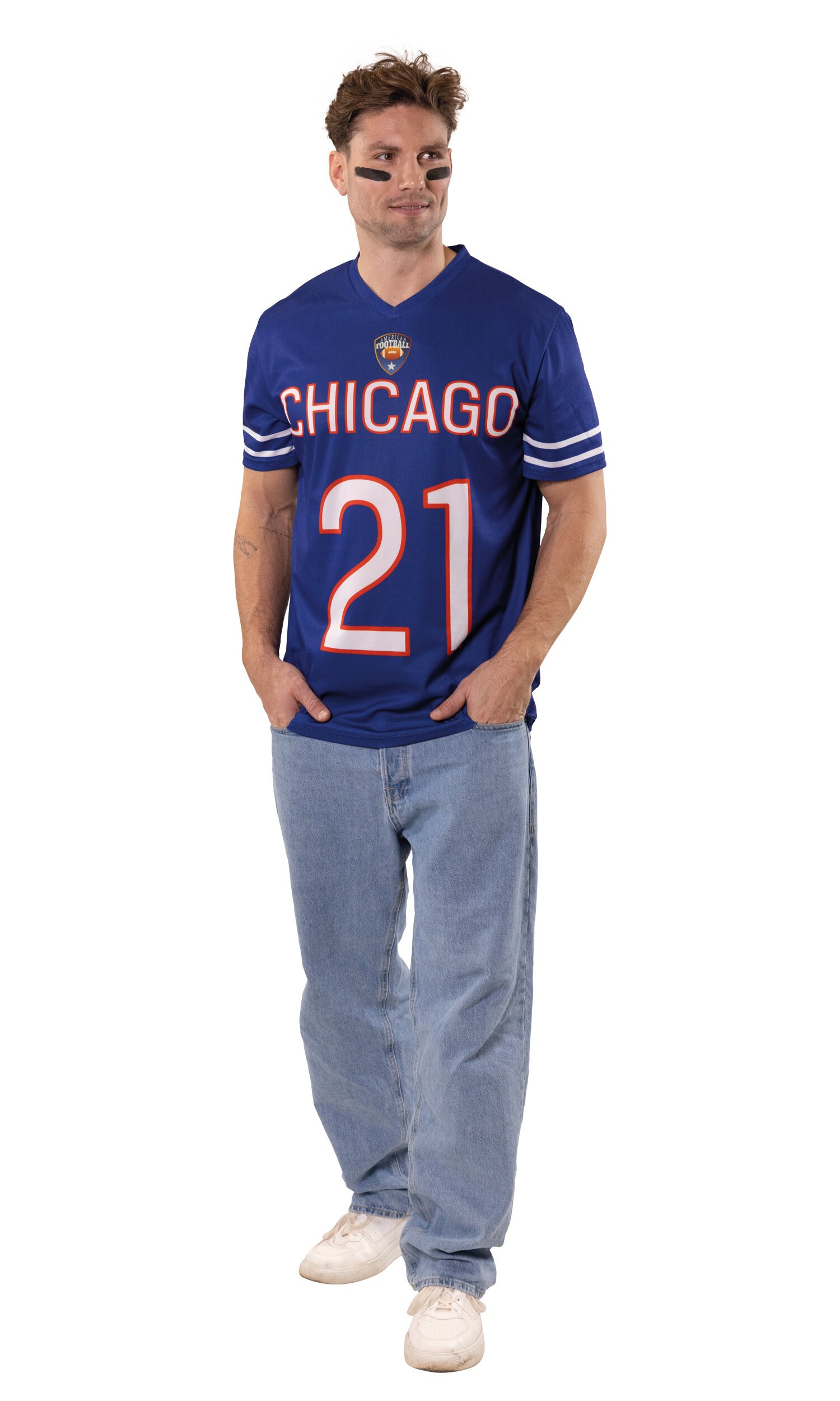 Das American Football Trikot bringt echten Stadion-Style in den Karneval! Das blaue Kurzarm-Jersey besitzt einen sportlichen V-Ausschnitt und zwei weiße Streifen an den Ärmeln. Auf der Vorderseite befindet sich eine große weiße Beschriftung mit „Chicago“ sowie der Spielnummer „21“. Darüber rundet ein Football-Logo den Look perfekt ab.