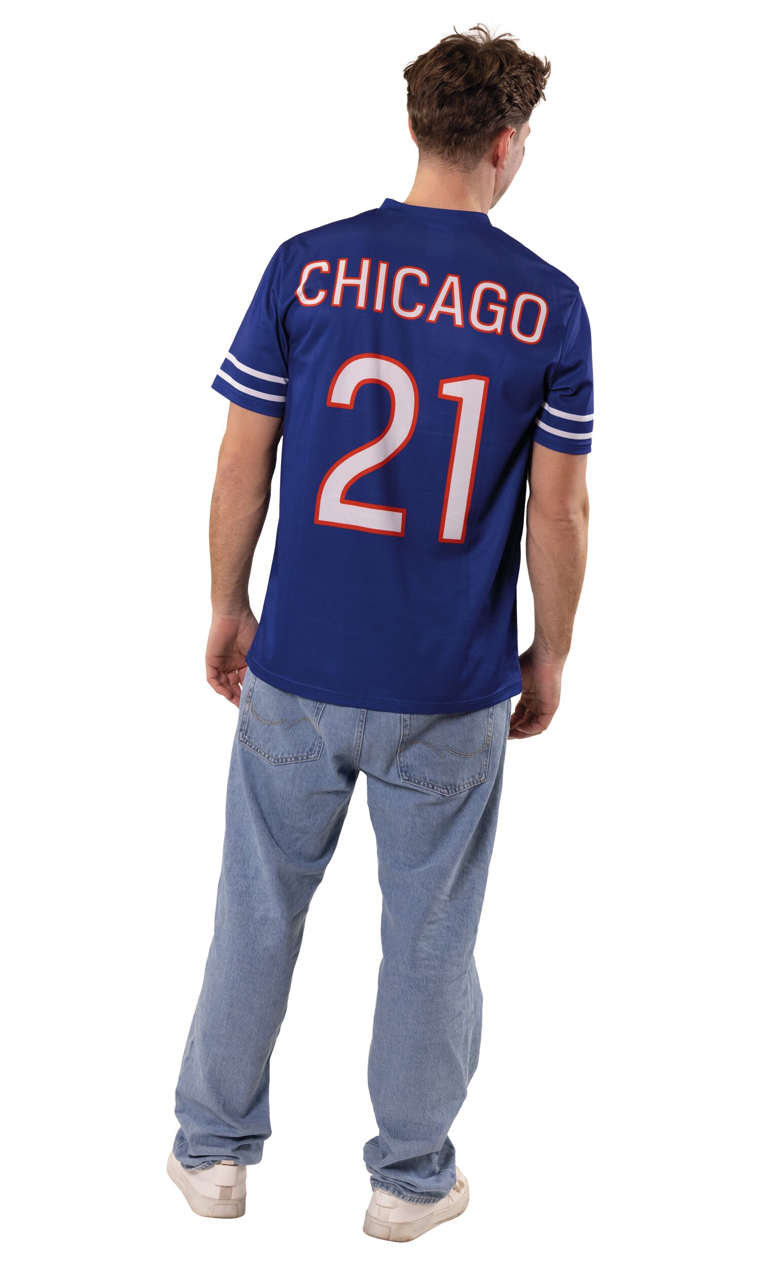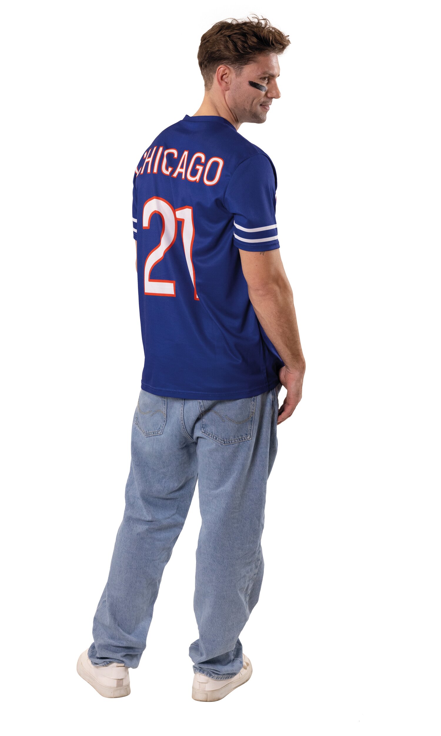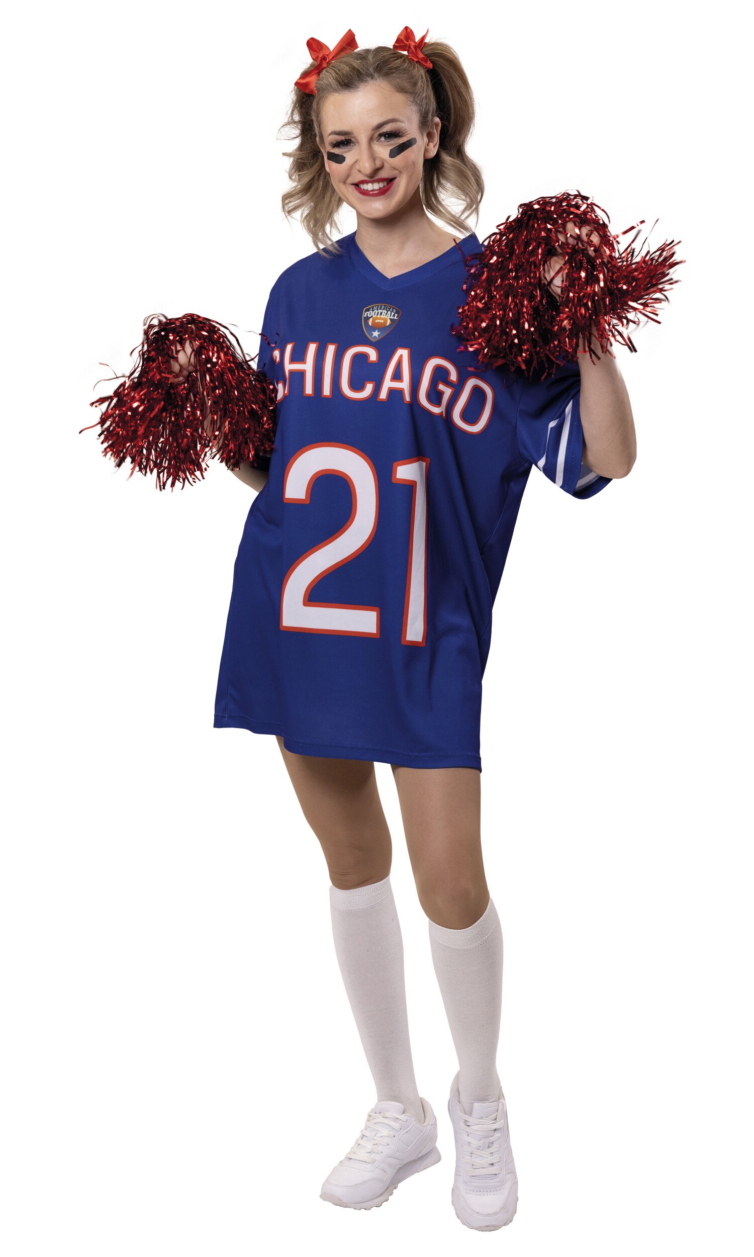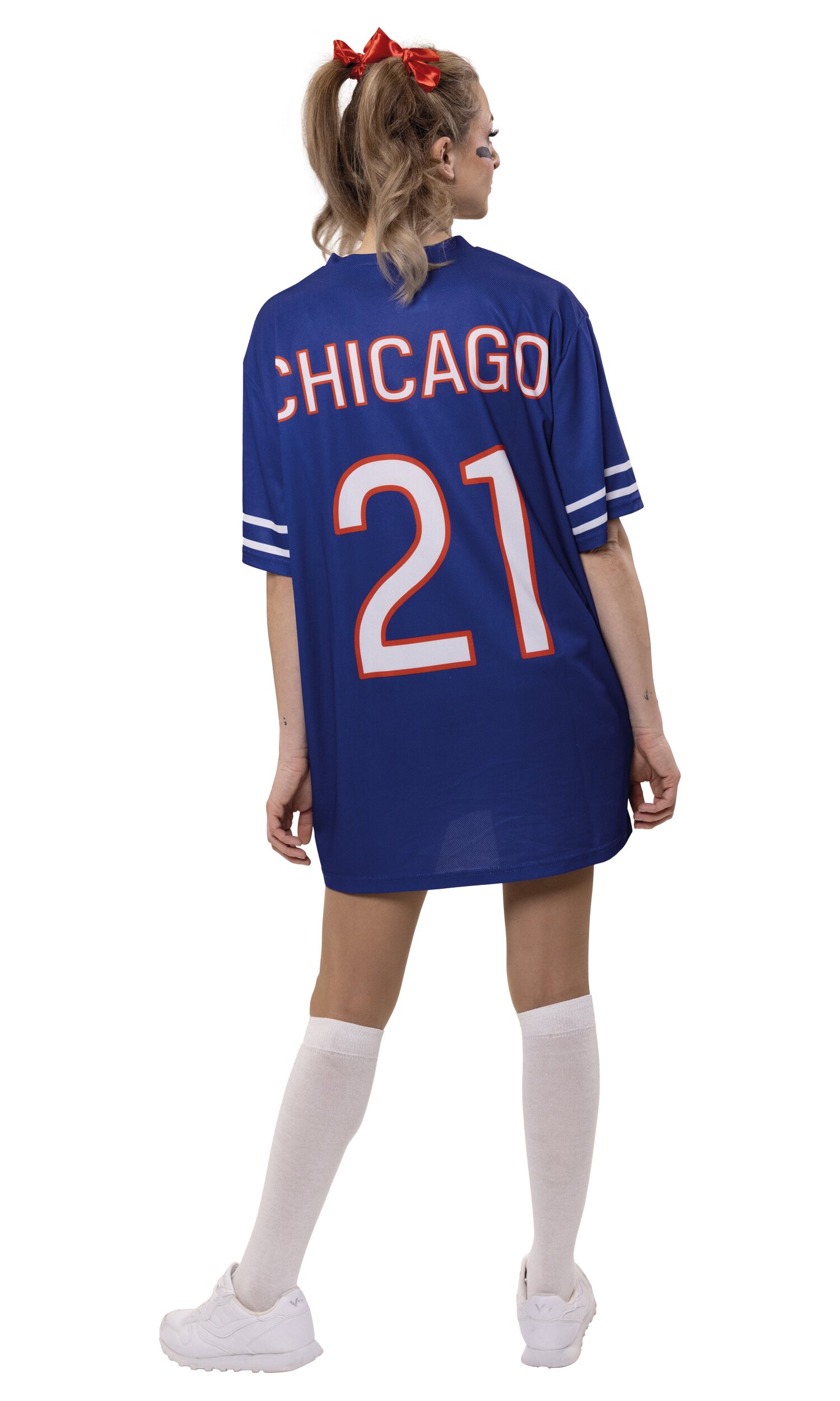 Das American Football Trikot bringt echten Stadion-Style in den Karneval! Das blaue Kurzarm-Jersey besitzt einen sportlichen V-Ausschnitt und zwei weiße Streifen an den Ärmeln. Auf der Vorderseite befindet sich eine große weiße Beschriftung mit „Chicago“ sowie der Spielnummer „21“. Darüber rundet ein Football-Logo den Look perfekt ab.