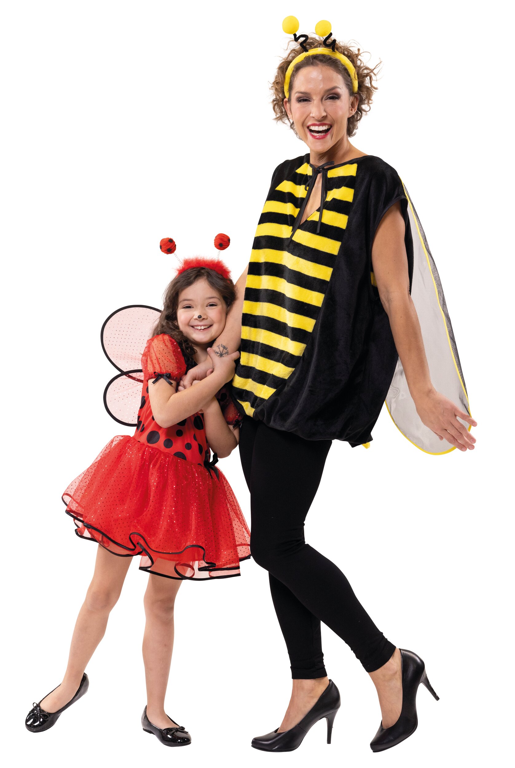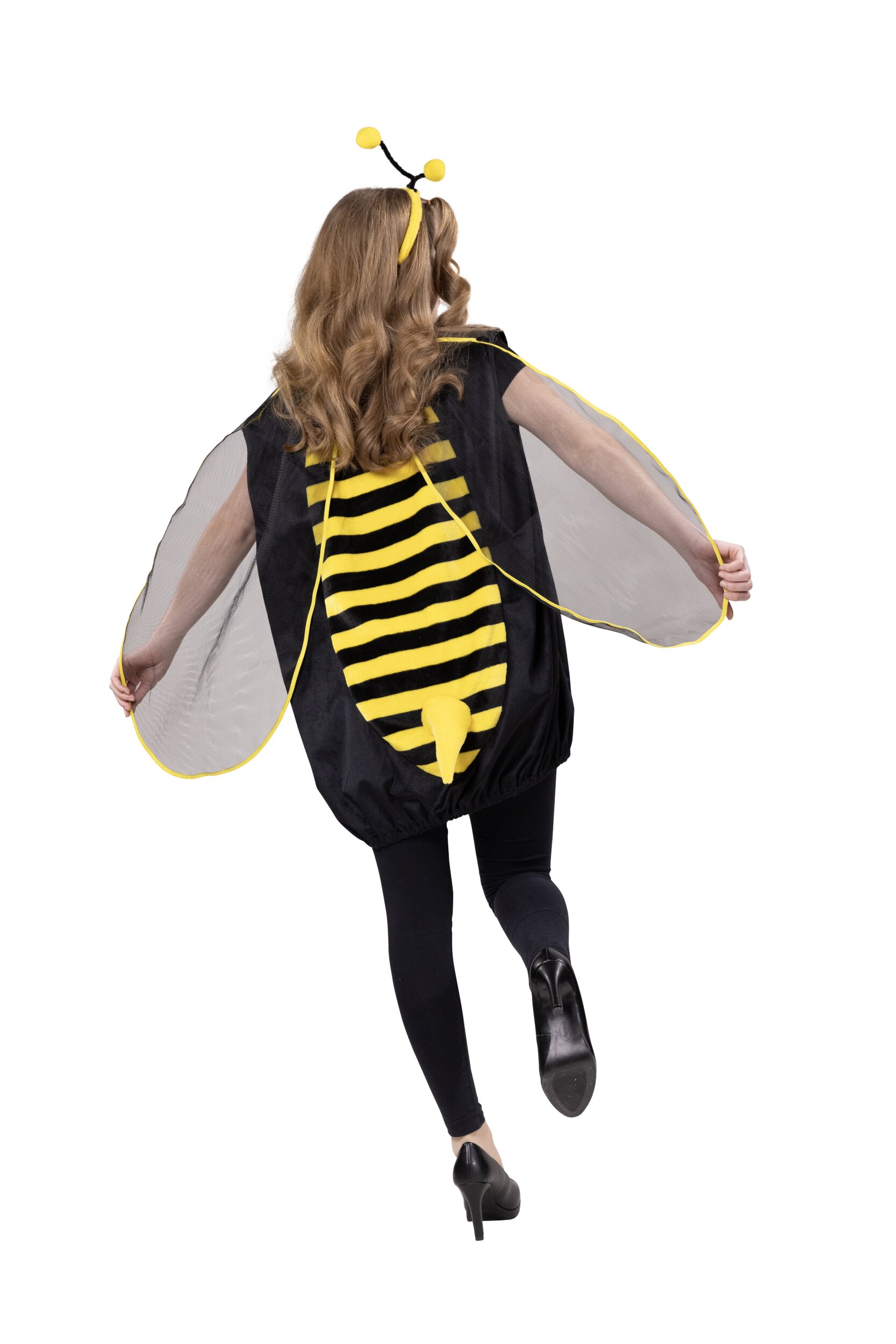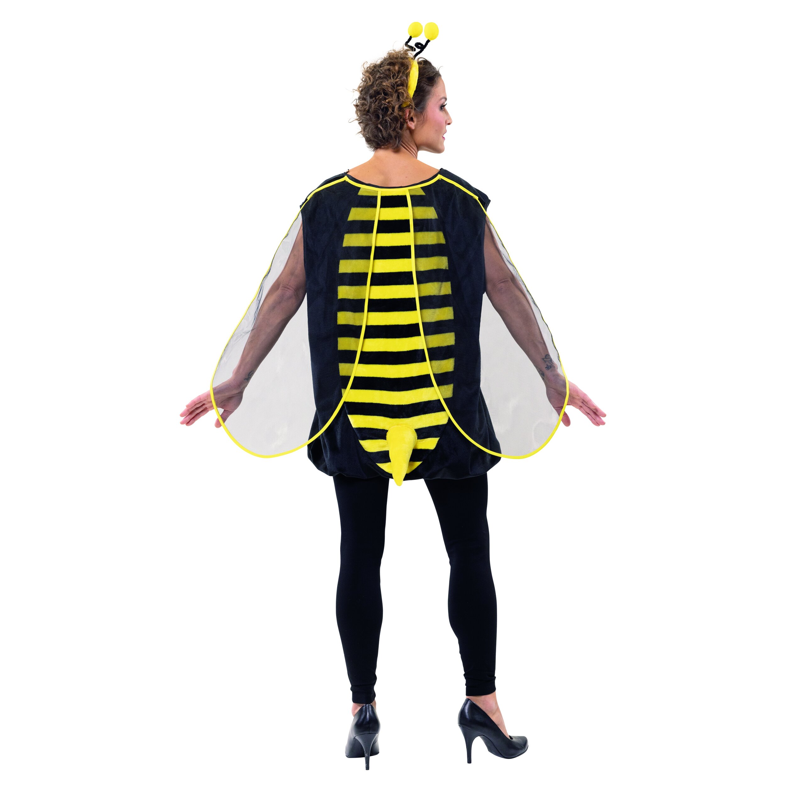 Das schwarze, ärmellose Kostüm wird am Hals mit einer kleinen Schleife gebunden und hat schwarz-gelbe Einsätze vorn und hinten. Auf der Rückseite ist ein kleiner Stachel angenäht sowie Flügel aus doppellagigem Netzstoff, die mit gelber Borte umrandet sind. Das Kostüm fällt bis über den Po und schließt mit einem Gummiband im Saum ab. Der Haarreif ist mit gelbem Plüsch bezogen und hat zwei schwarze Fühler mit gelben Pompons.