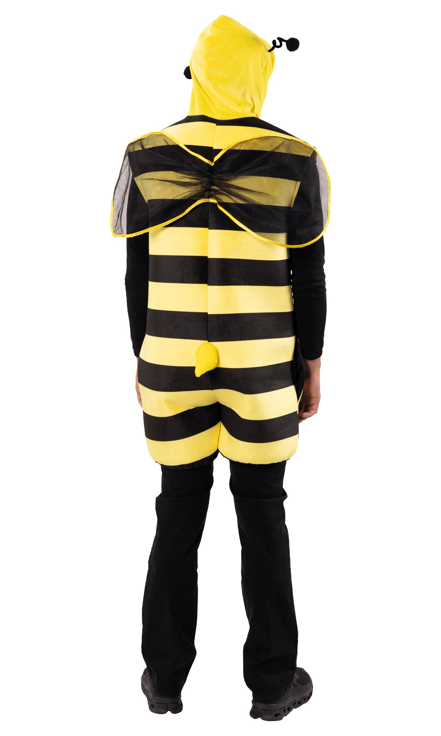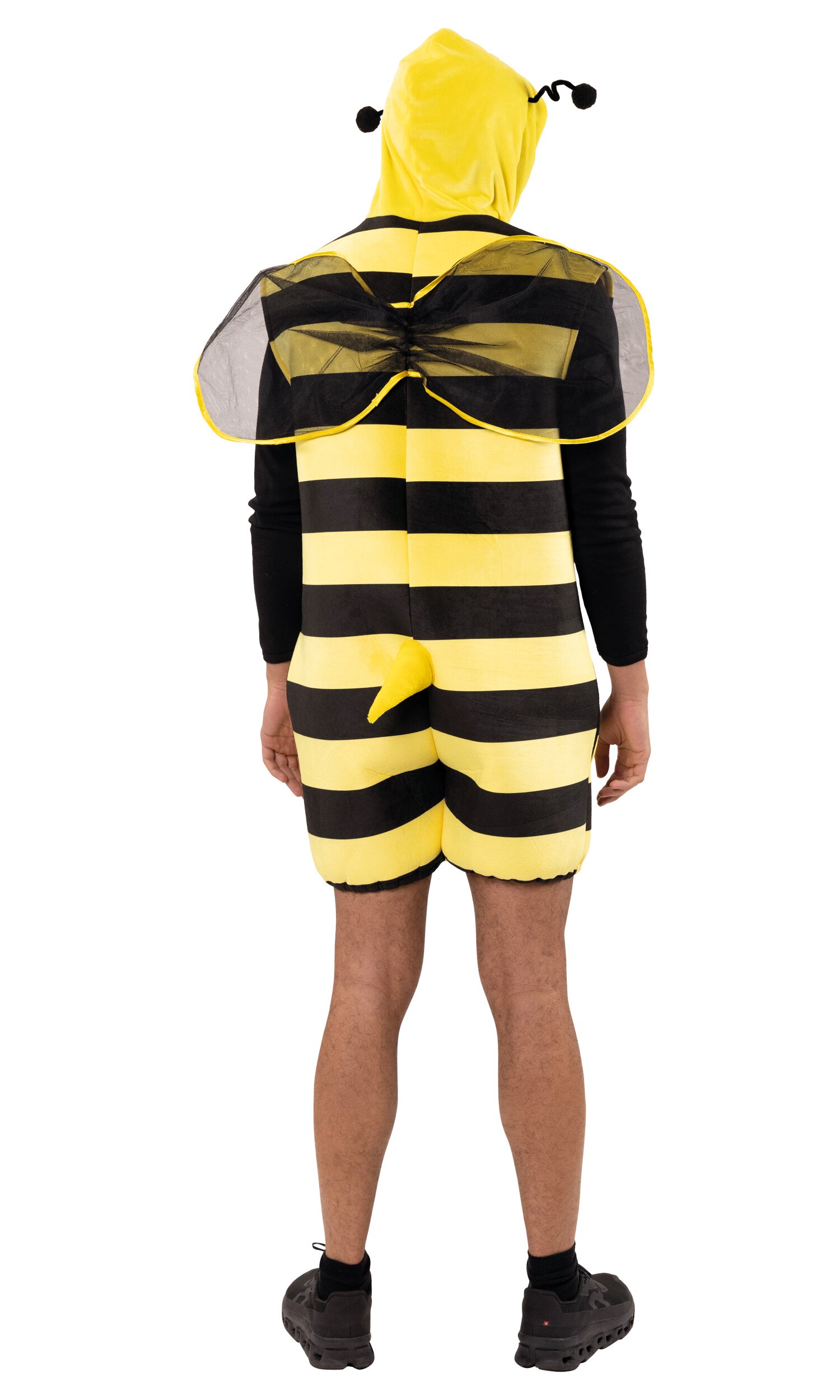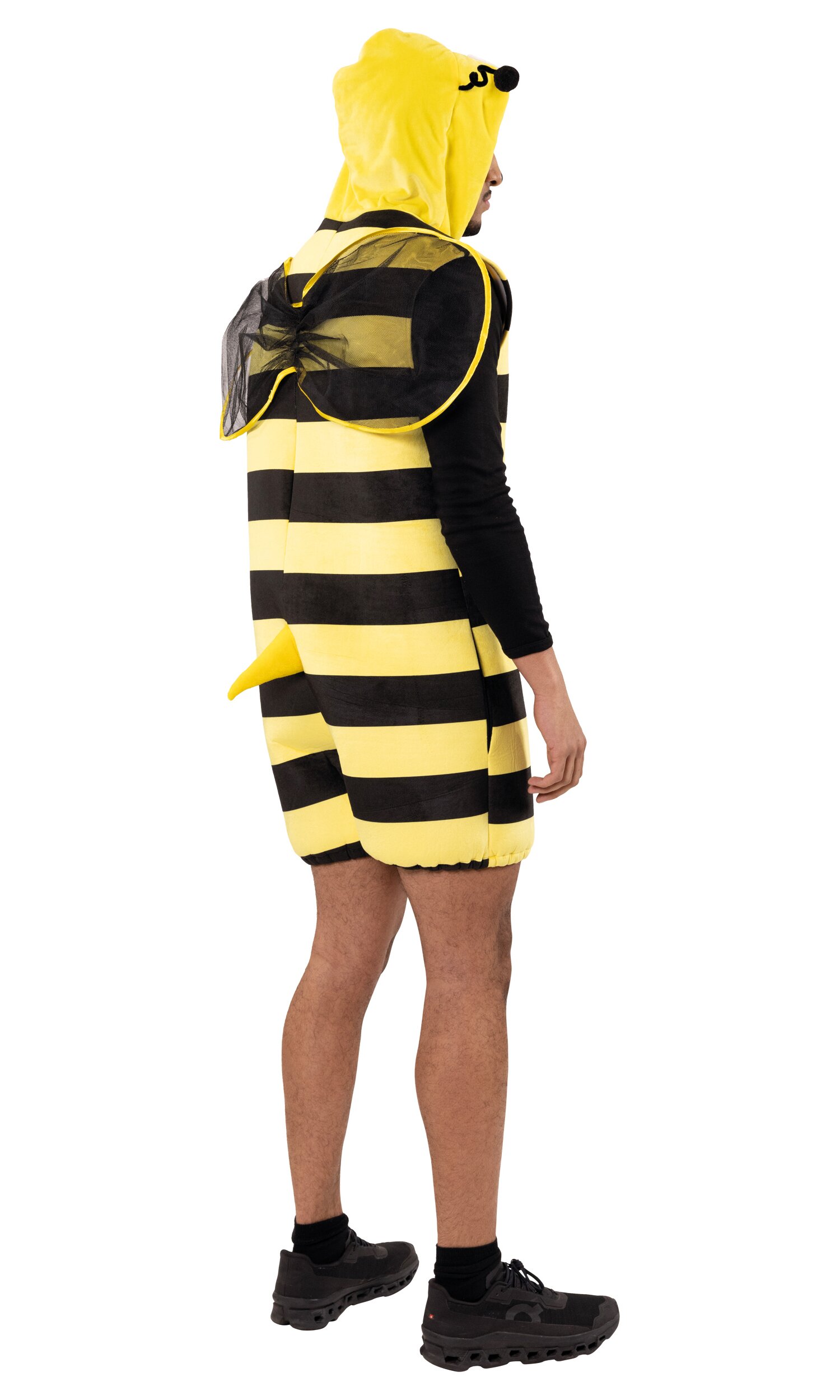 Mit dem Bienen Kostüm sorgst du für gute Stimmung auf jeder Feier! Der Jumpsuit kommt mit kurzen Beinen und schulterfreiem Schnitt und ist im typischen Gelb-Schwarz gestreiften Design gehalten. Die gelbe Kapuze ist mit zwei Fühlern und Augen ausgestattet. Am Rücken befinden sich passende Flügel sowie ein Stachel – für den perfekten Bienen-Look!