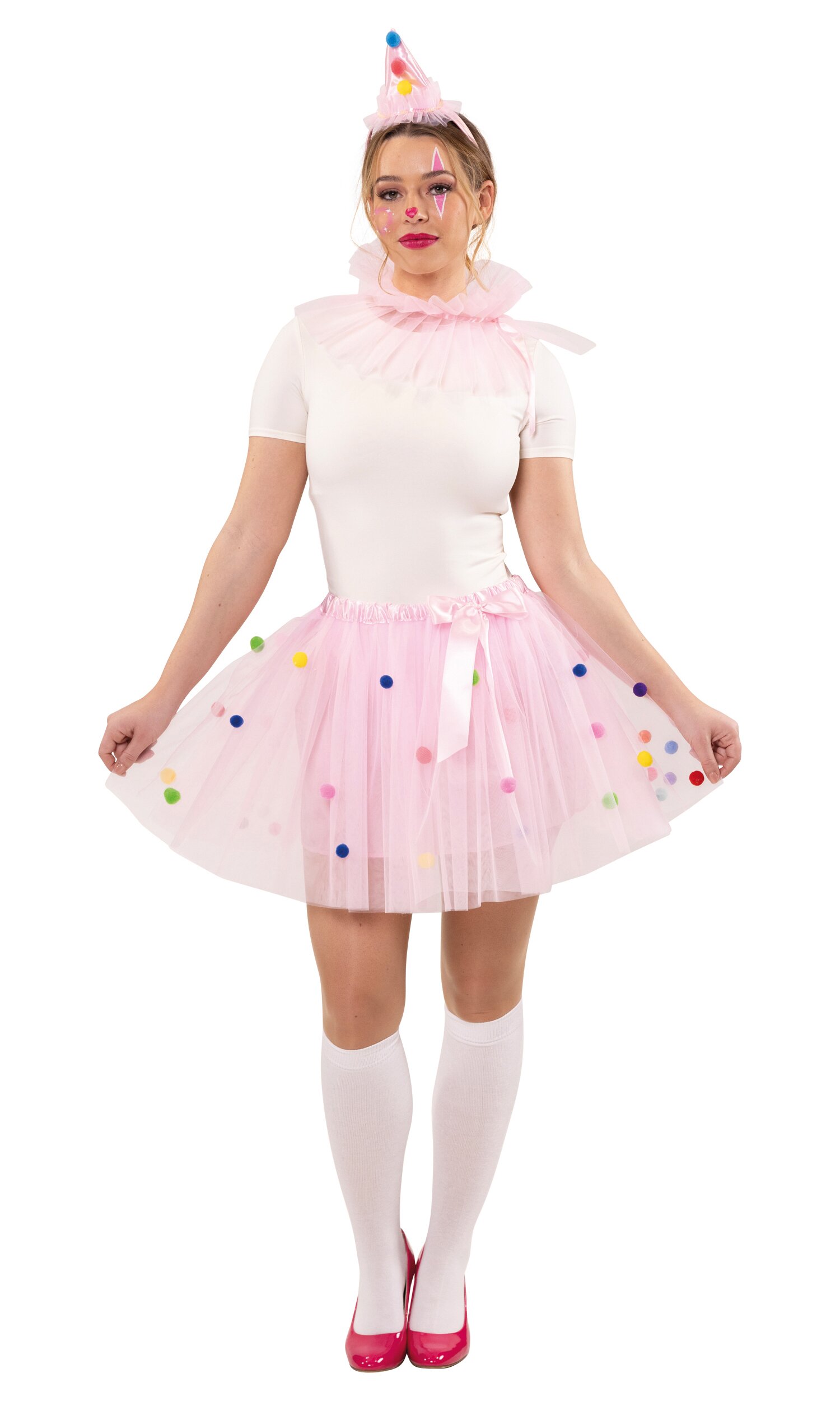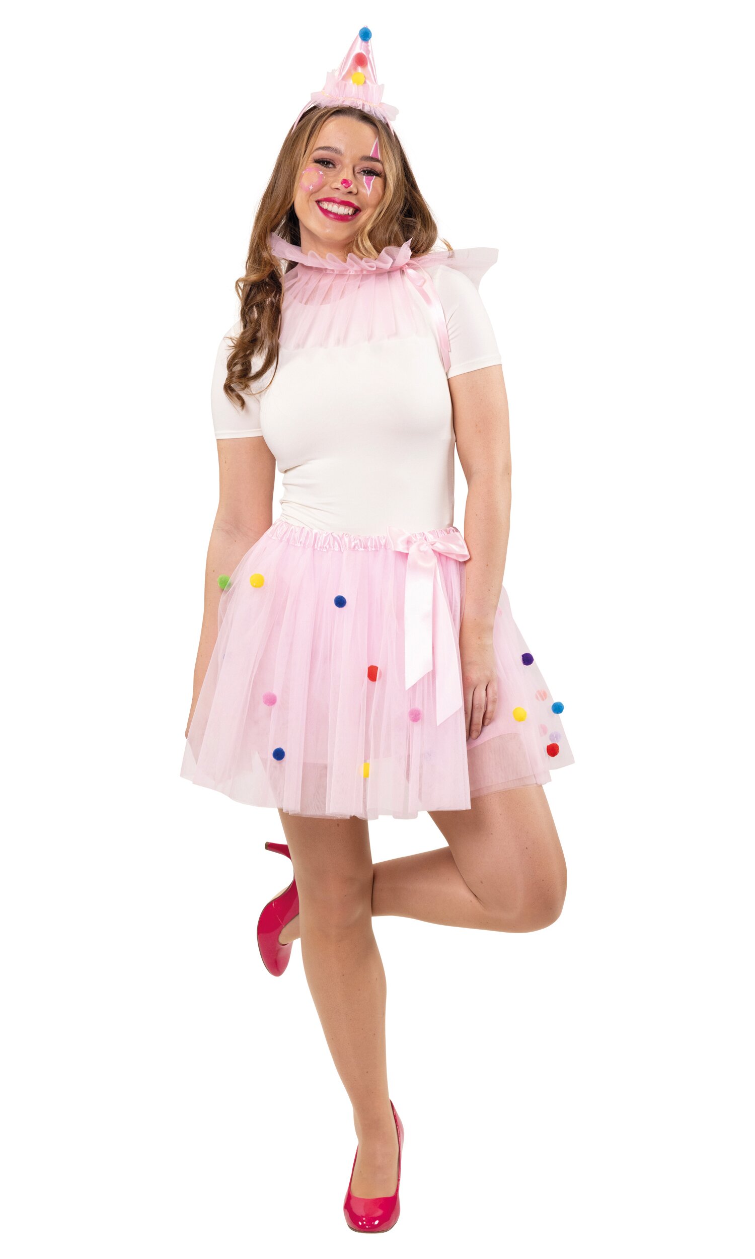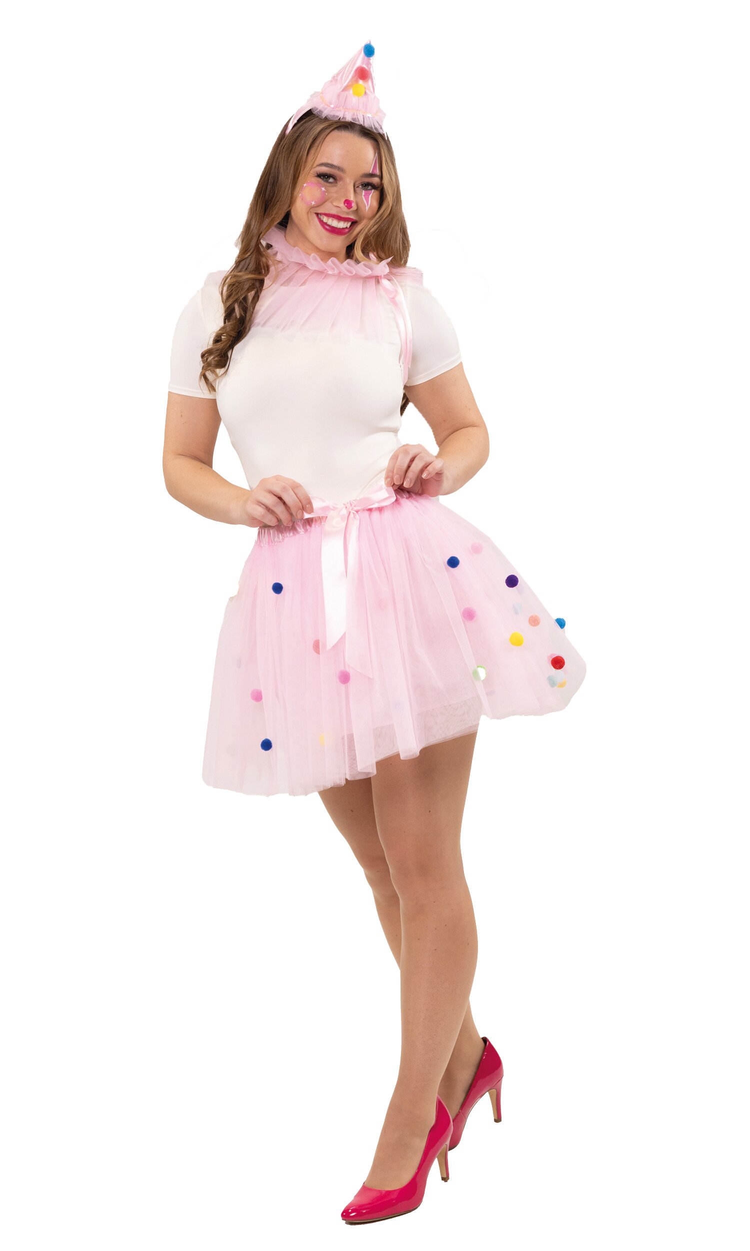 Mit dem Cupcake Kostüm wirst du zur süßesten Versuchung auf jeder Feier! Der pinke Tüllrock ist mit kleinen, bunten flauschigen Kügelchen verziert und mit einer rosa Schleife akzentuiert – wie Zuckerdekor auf einem Cupcake. Die passende Halskrause aus pinkem Tüll ergänzt den Look perfekt. Der glänzende rosa Haarreif in Partyhut-Form, ebenfalls mit den kleinen bunten Kügelchen verziert, setzt das i-Tüpfelchen oben drauf.