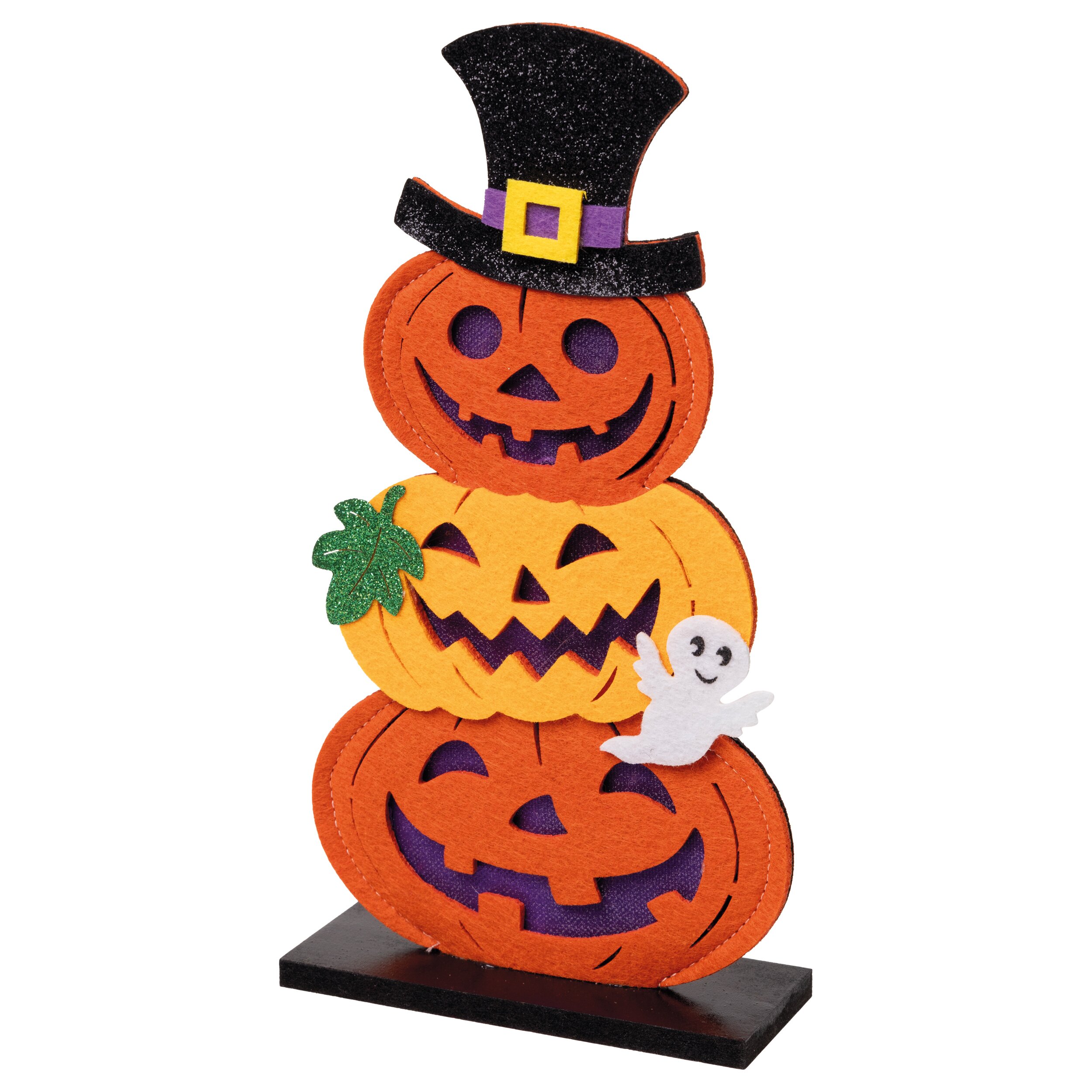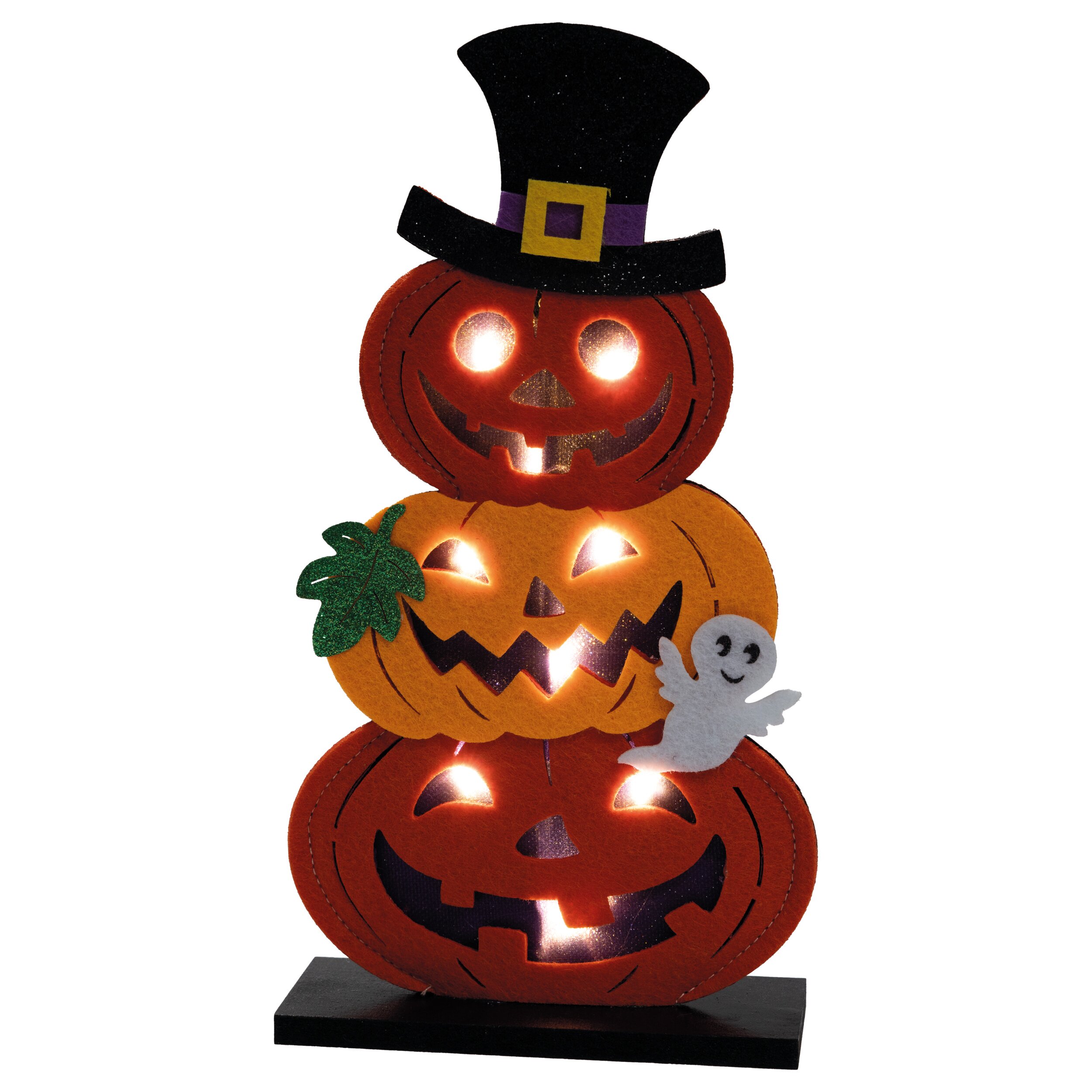 Diese stimmungsvolle LED Kürbis-Dekoration aus Filz sorgt für eine gemütlich-schaurige Atmosphäre in der Halloweenzeit. Die liebevoll gestaltete Figur zeigt drei übereinander gestapelte Kürbisse mit freundlichen Jack-o’-Lantern Gesichtern, einen kleinen Geist sowie dekorative Details wie ein Blatt und einen schwarzen Glitzerhut. Durch die integrierte LED-Beleuchtung leuchten die ausgeschnittenen Gesichter der Kürbisse besonders effektvoll und schaffen eine warme Halloween-Stimmung.