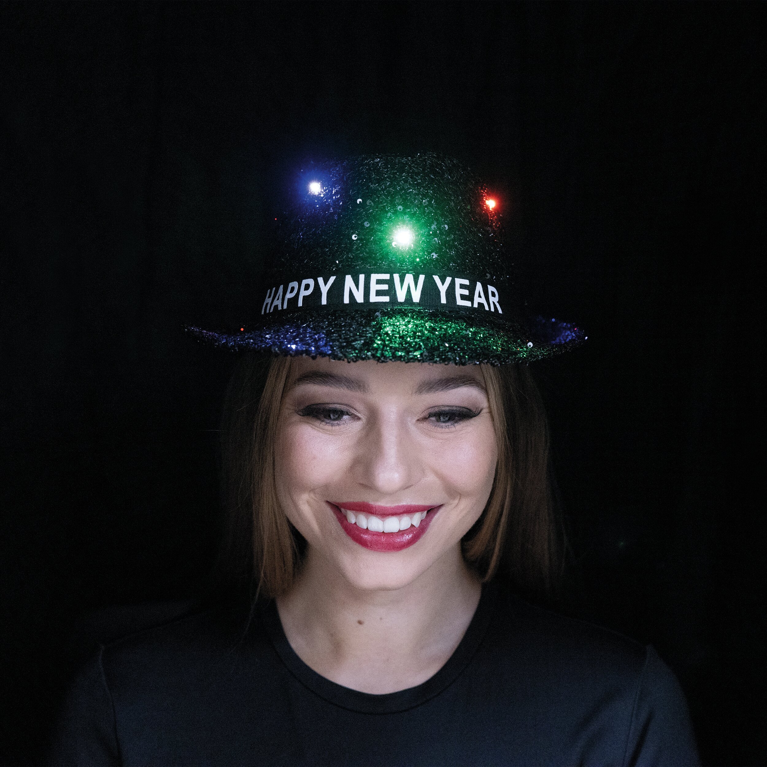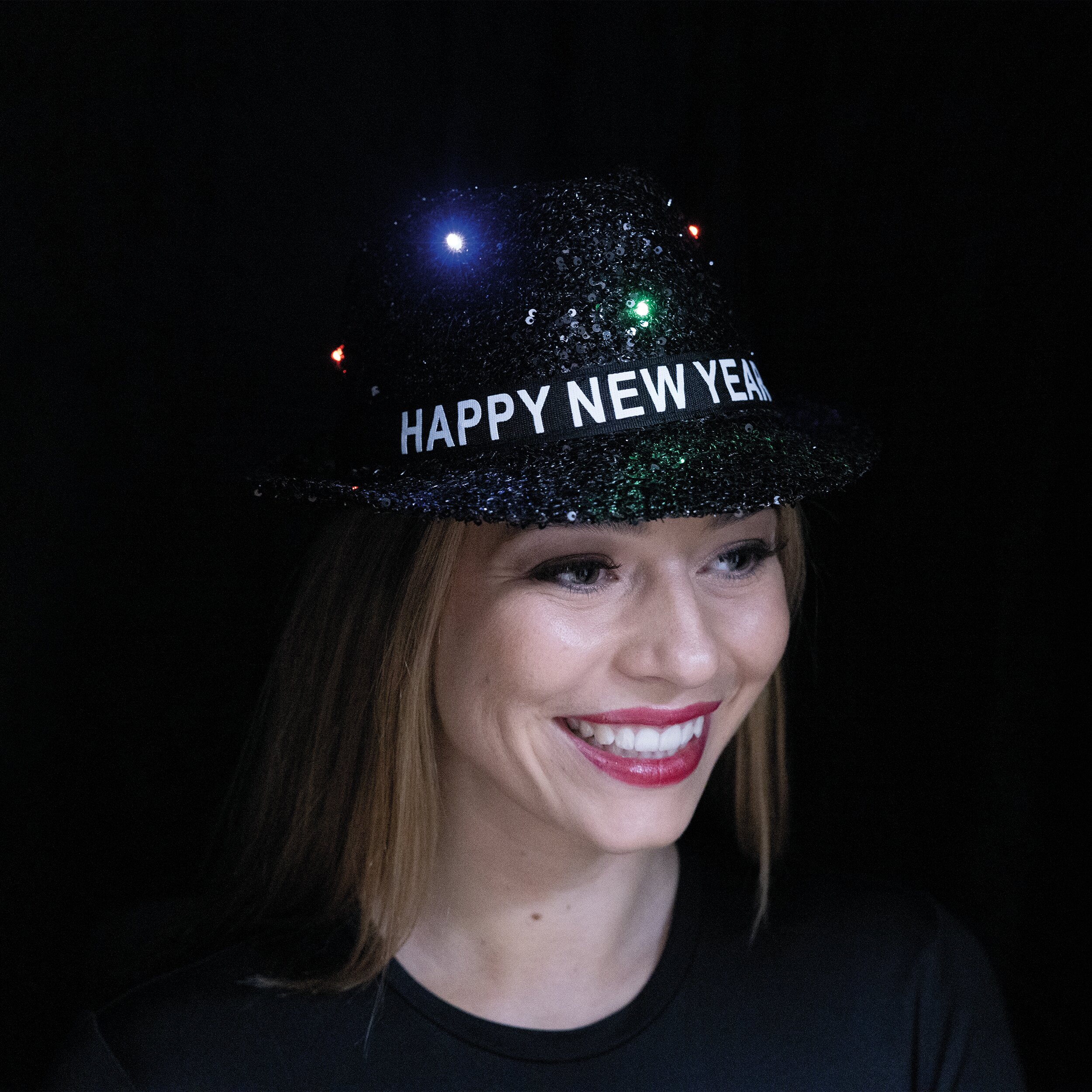 Eigenschaften "Fedora Paillettenhut Happy New Year LED schwarz"