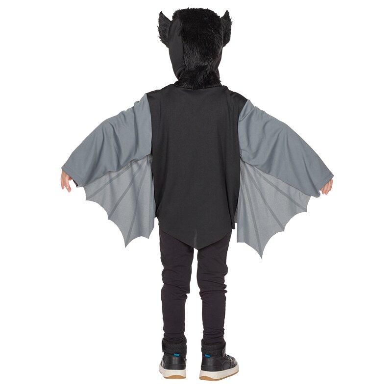 Schwarzes Oberteil, an dessen fellbedeckter Kapuze Ohren angenäht sind. Die langen grauen Ärmel breiten sich beim Heben der Arme zu Fledermausflügeln aus.