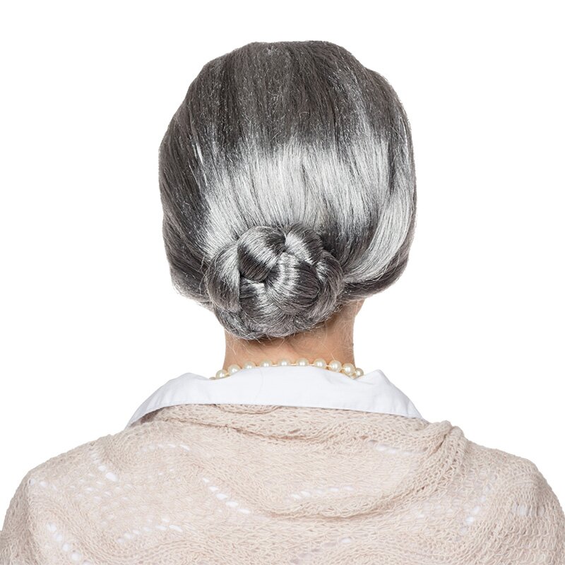 Graumelierte Großmutterperücke mit Mittelscheitel, deren Haare im Nacken zu einem verschlungenen Knoten gebunden sind.