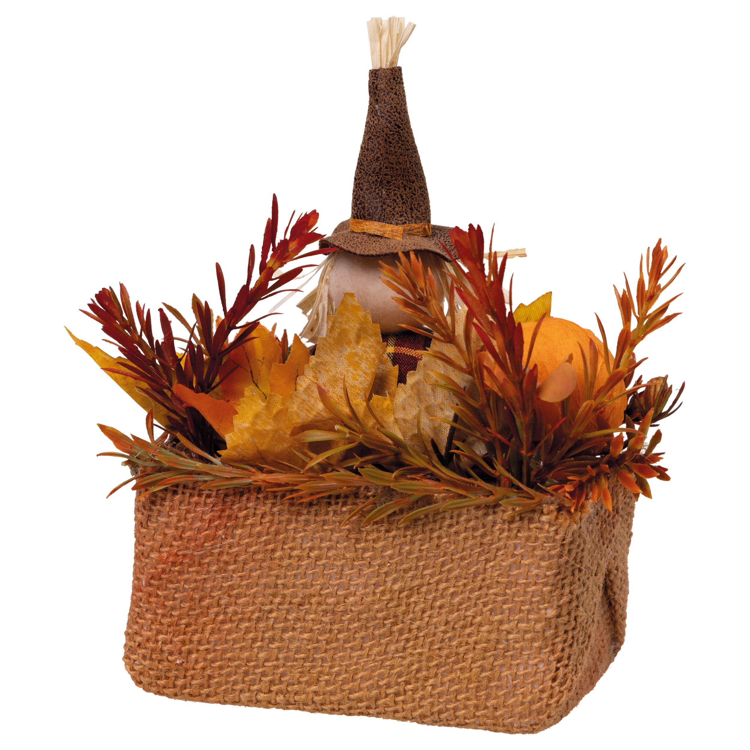 Dieser dekorative Herbstkorb mit Vogelscheuche bringt den Charme der goldenen Jahreszeit direkt in Ihr Zuhause. In dem rustikalen Stoffkorb sitzt eine niedliche Vogelscheuche mit spitzem Hut, umgeben von herbstlichen Pflanzen, Blättern und kleinen Kürbissen. Die warmen Farben und natürlichen Materialien sorgen für eine gemütliche Herbstatmosphäre.