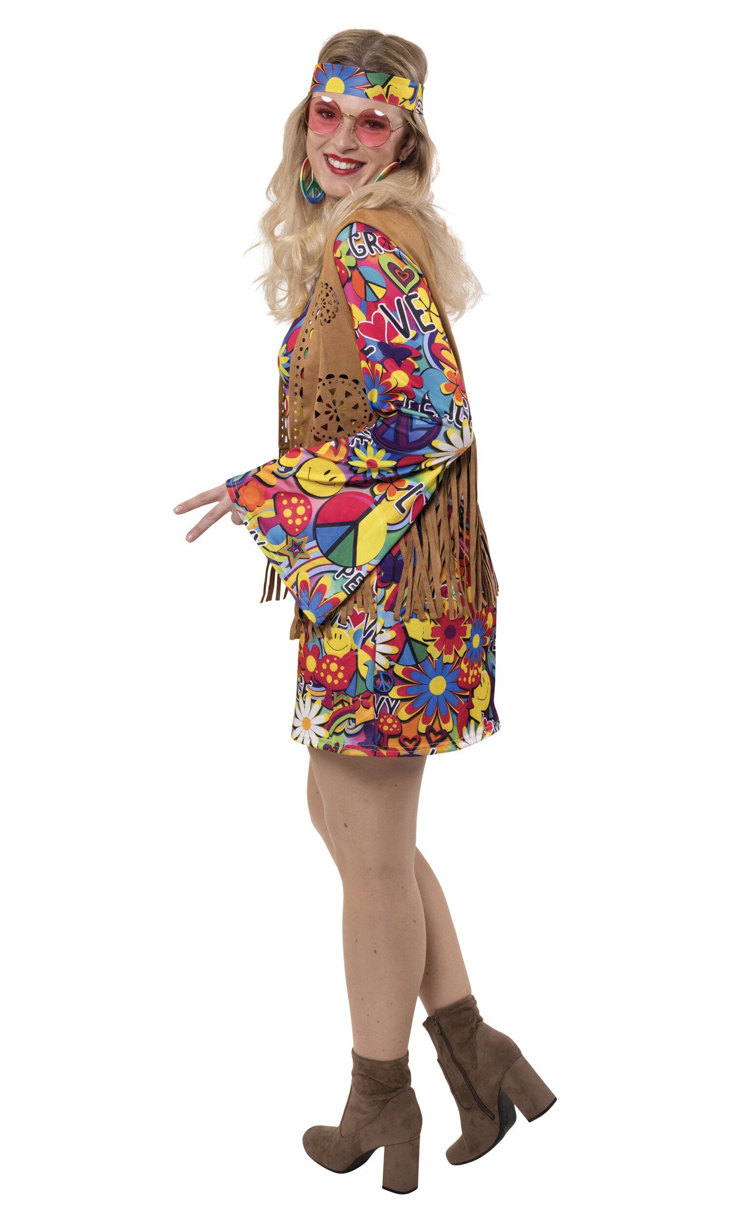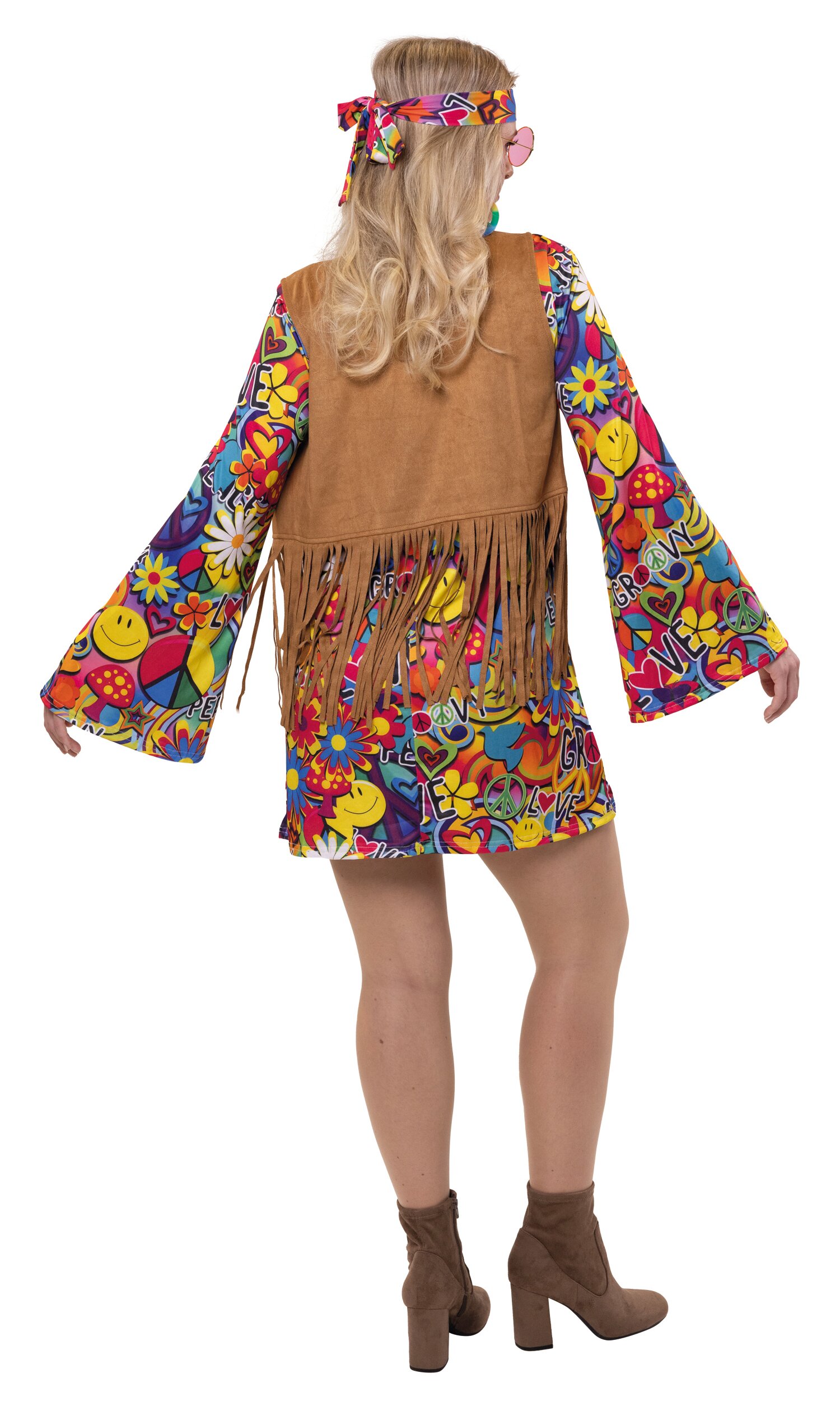 Kurzes Hippie-Kleid mit typischem 70er-Jahre Muster und Trompetenärmeln. Im Lieferumfang enthalten ist eine brauen Weste mit Lochmuster und langen Fransen sowie ein passendes langes