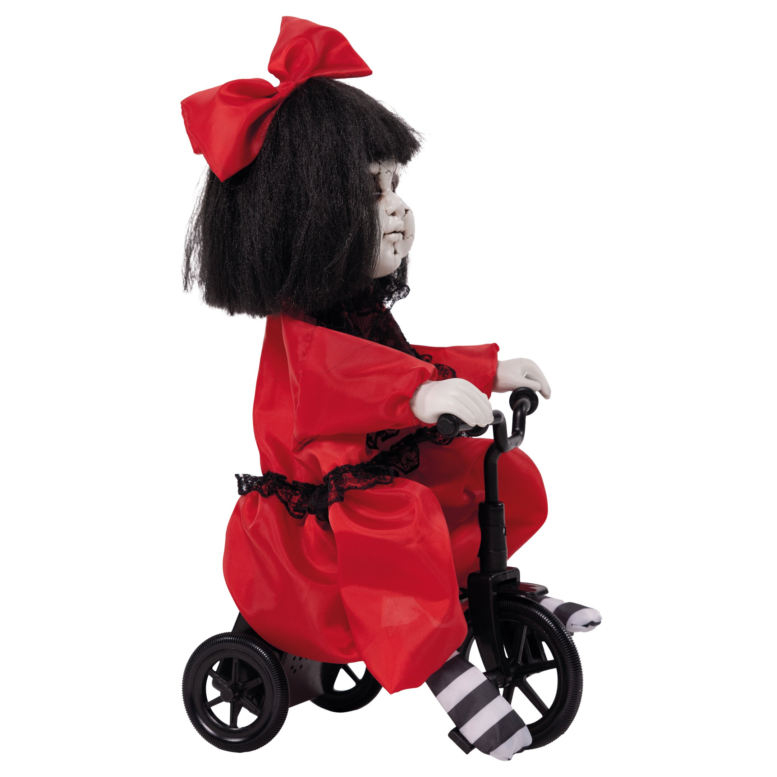 Die unheimliche Puppe mit ihrem rissigen Gesicht, dunklen Augen und schwarzem Haar sitzt auf einem kleinen Dreirad und trägt ein auffälliges rotes Kleid mit großer Schleife. Wird die Figur aktiviert, setzt sich das Fahrrad in Bewegung, während gleichzeitig gruselige Geräusche abgespielt werden. Diese Kombination aus Bewegung und Soundeffekten erzeugt einen besonders erschreckenden Effekt und macht die Figur zu einer lebendigen Halloween-Dekoration.