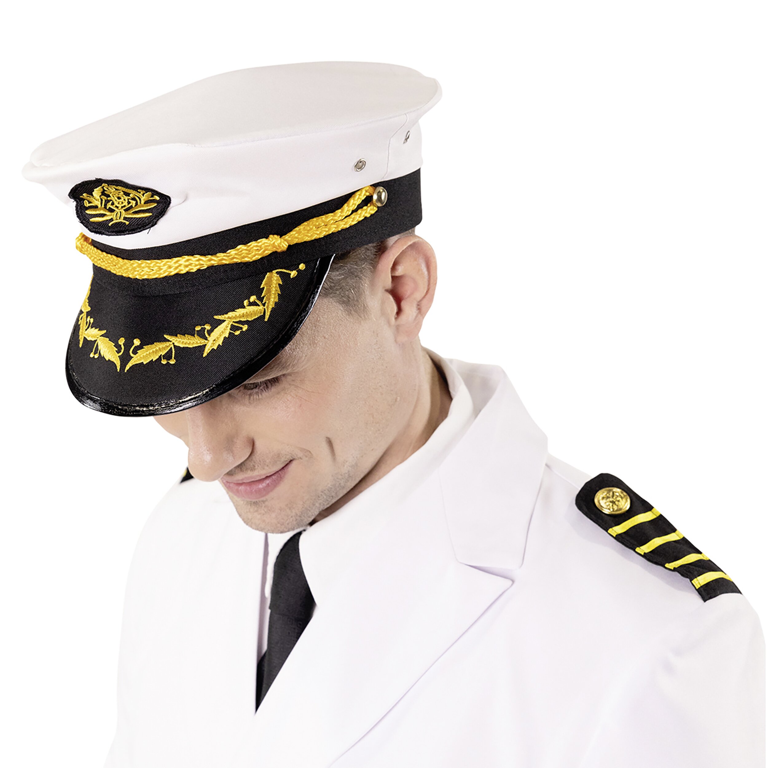 Die weiße Mütze ist mit einem aufgenähten Abzeichen versehen, das den typischen Kapitänslook unterstreicht. Der schwarze Schirm ist mit goldener Stickerei und dekorativer Kordel gestaltet und sorgt für eine hochwertige Optik.