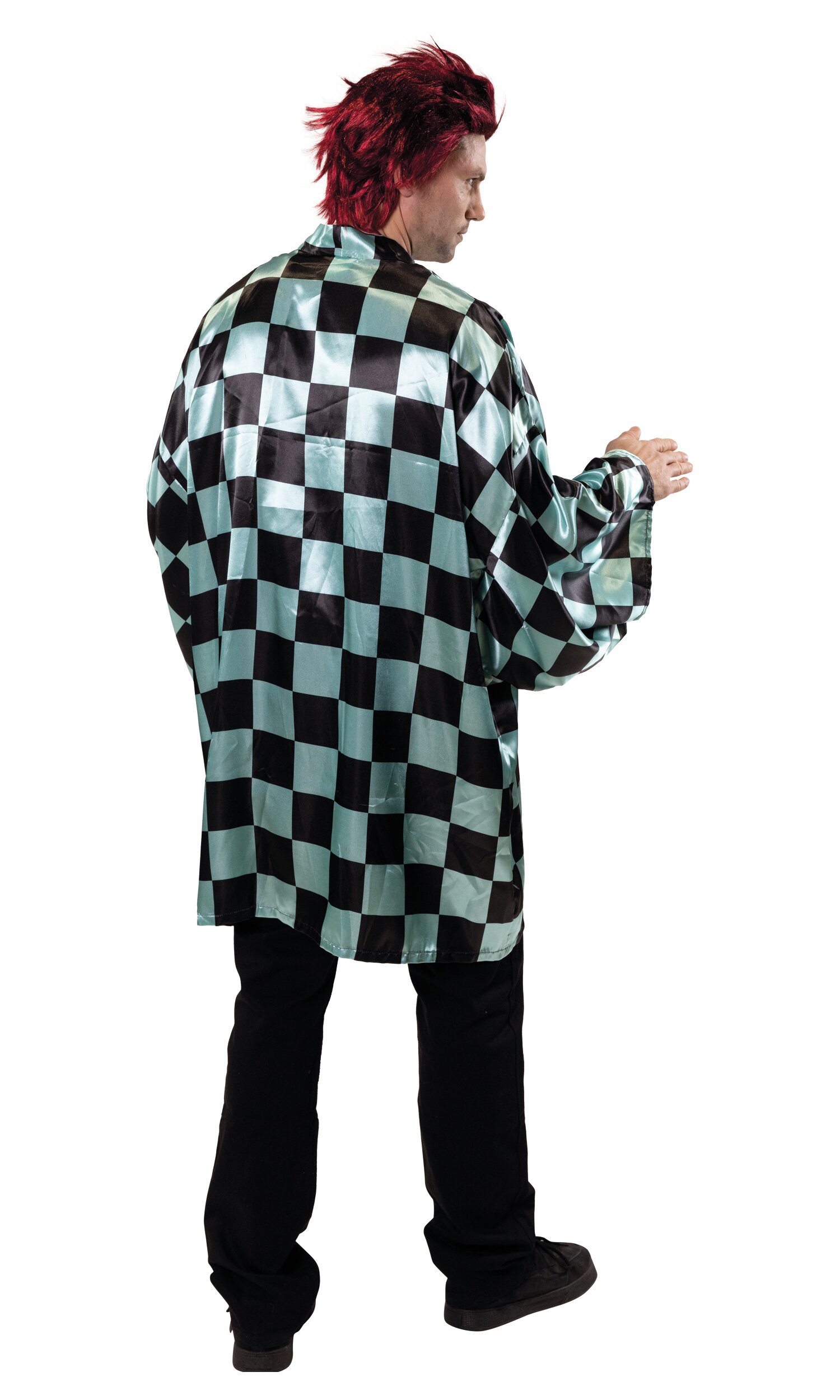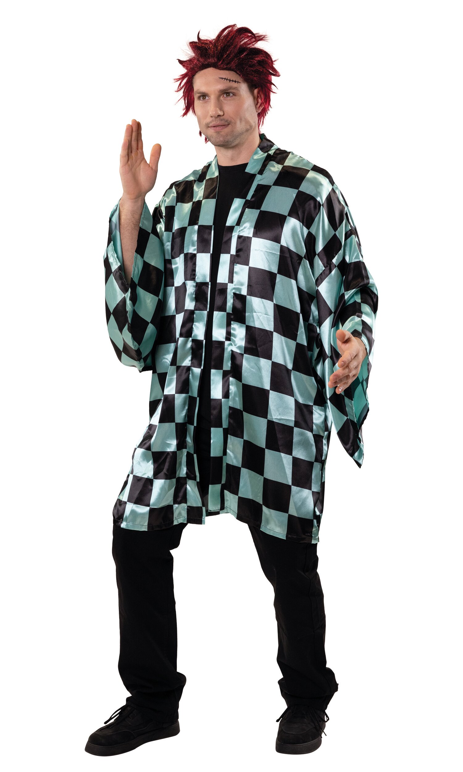 Kimono aus glänzendem Stoff für Dämonenjäger, mit typischem türkis-schwarzem Karomuster. Der Kimono ist etwa knielang und hat weit geschnittene Ärmel.