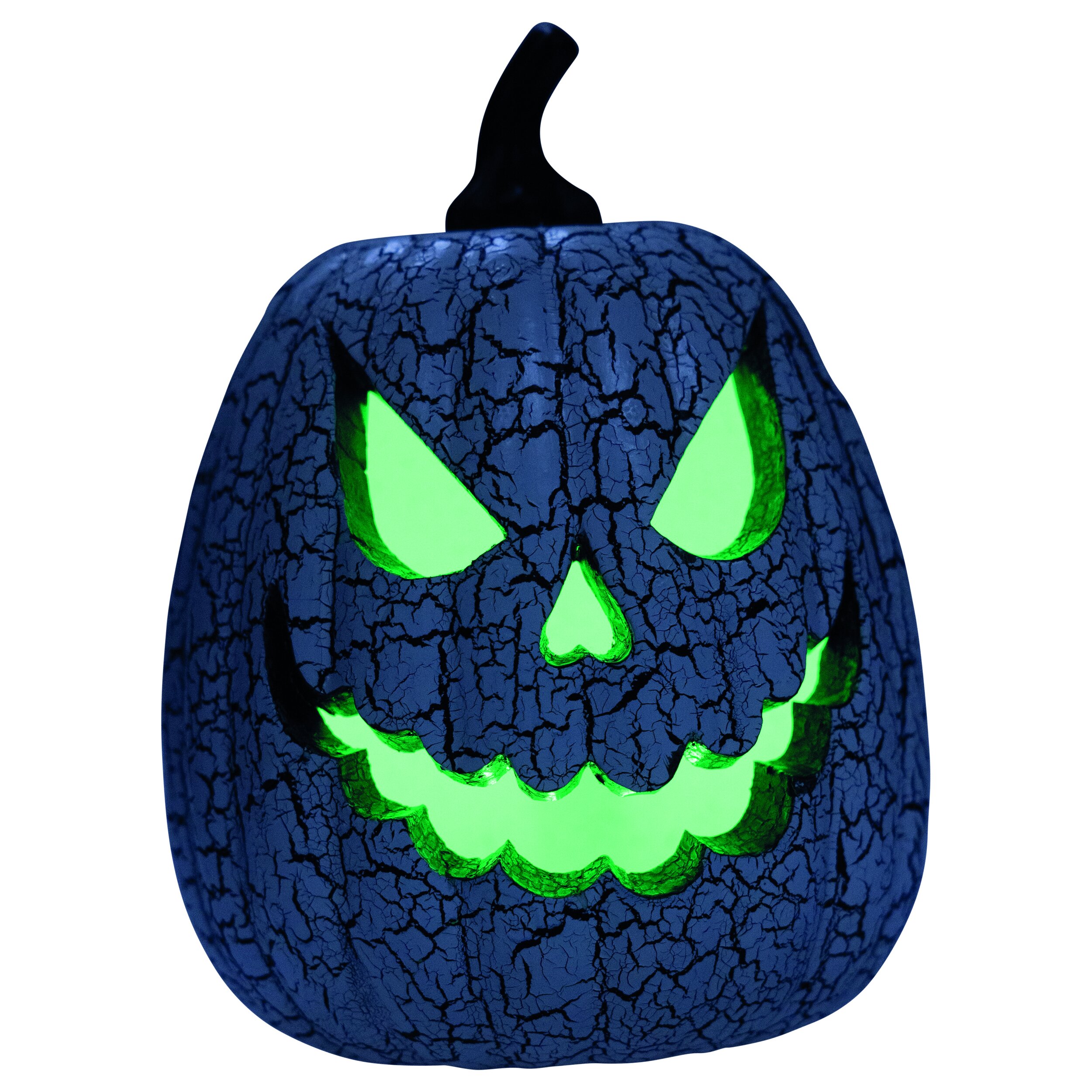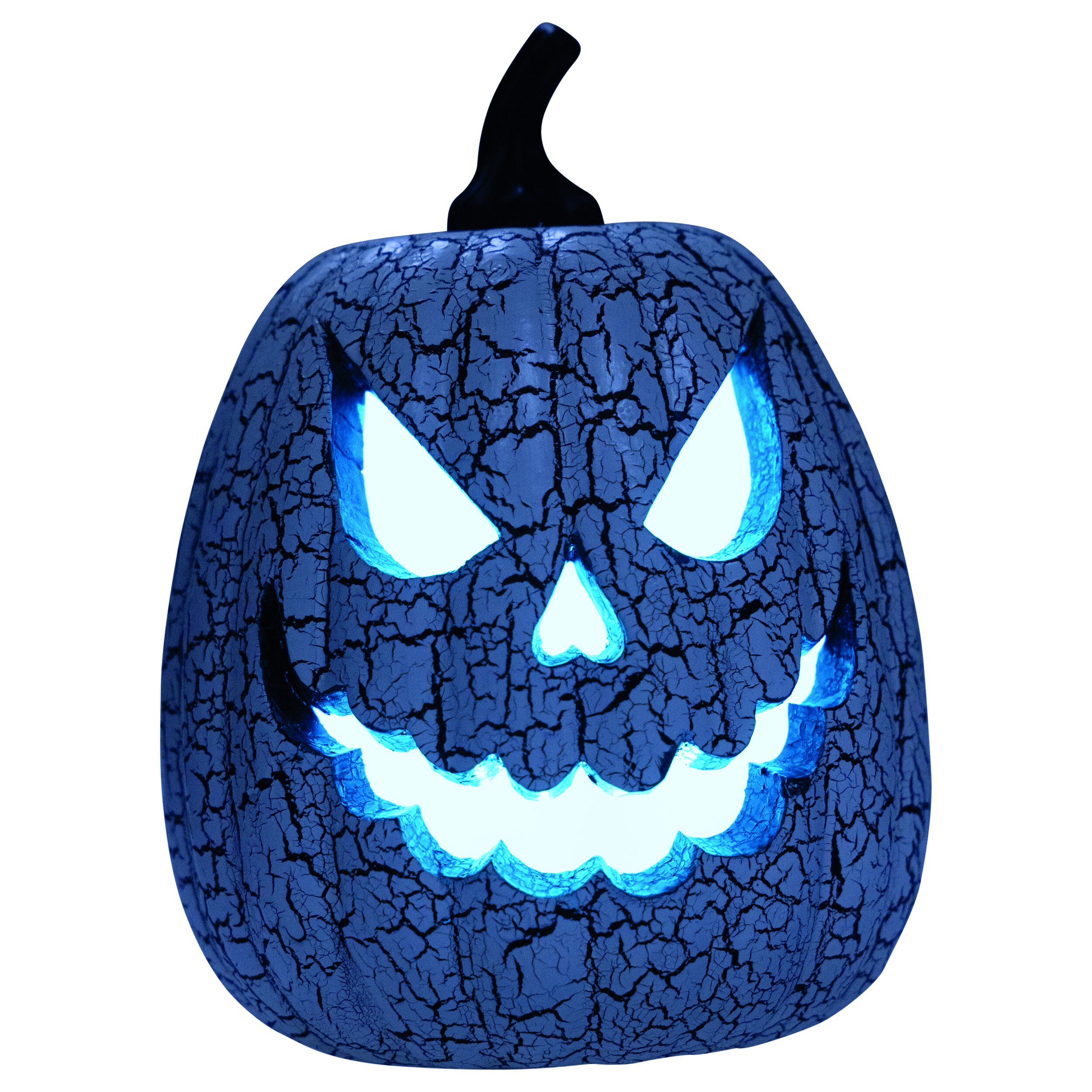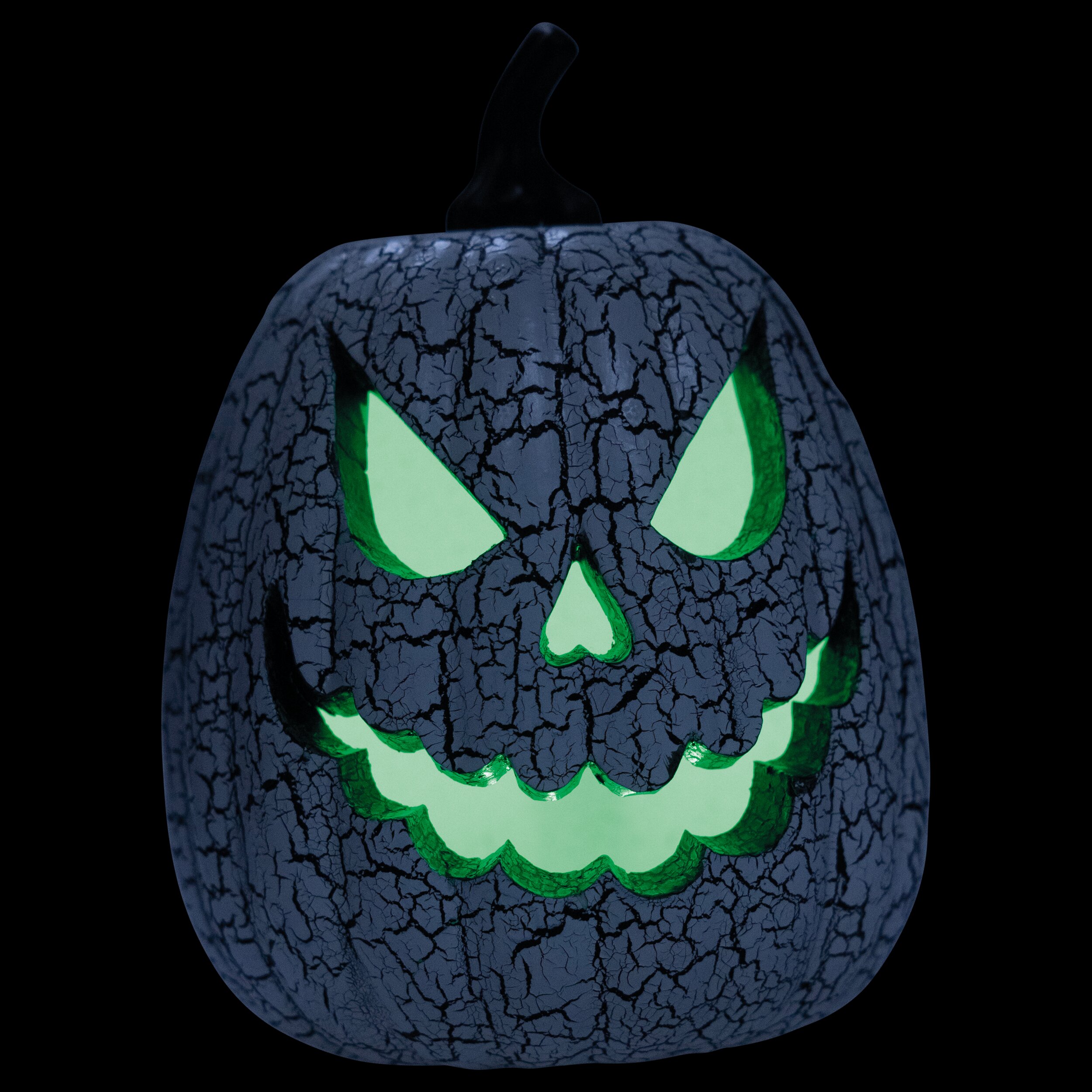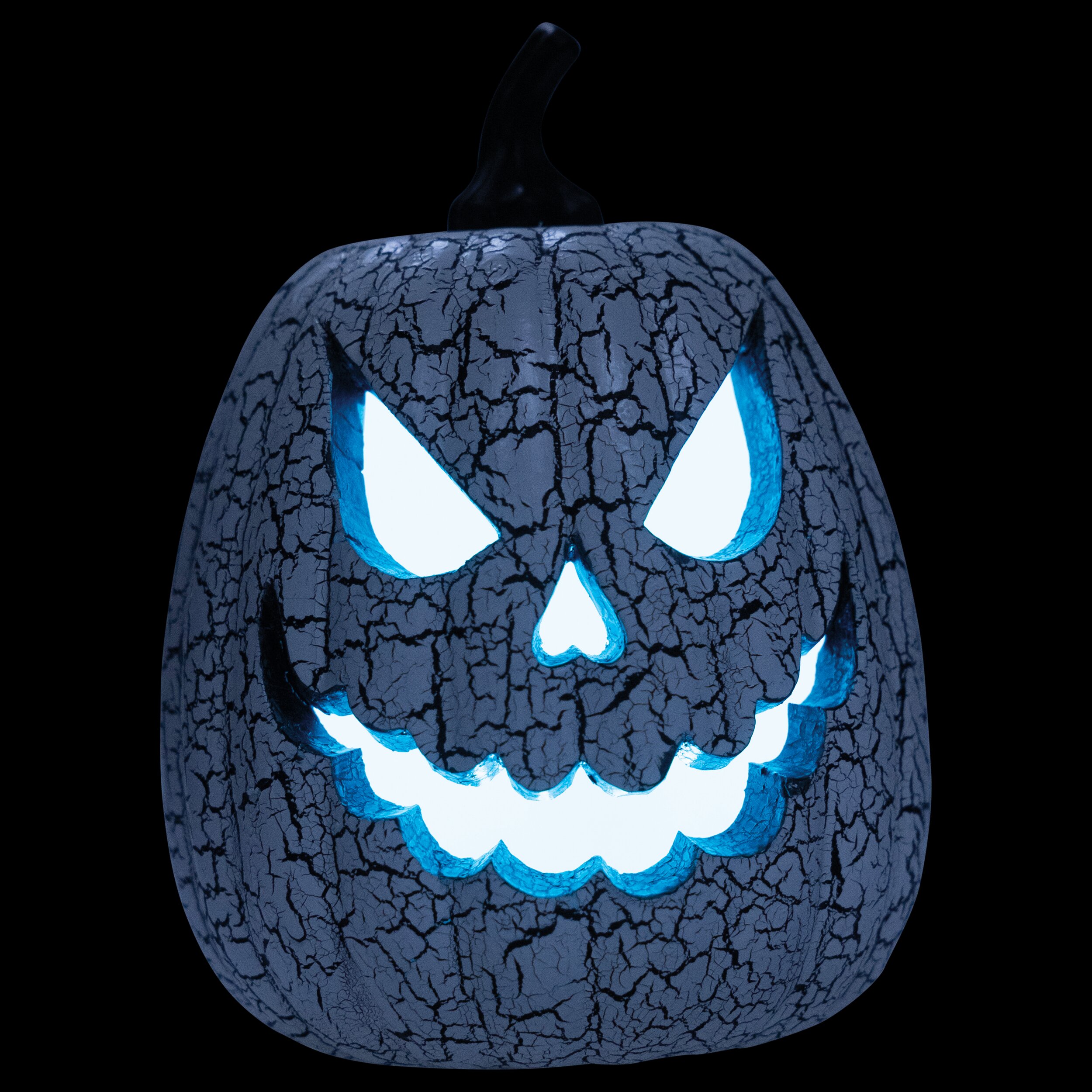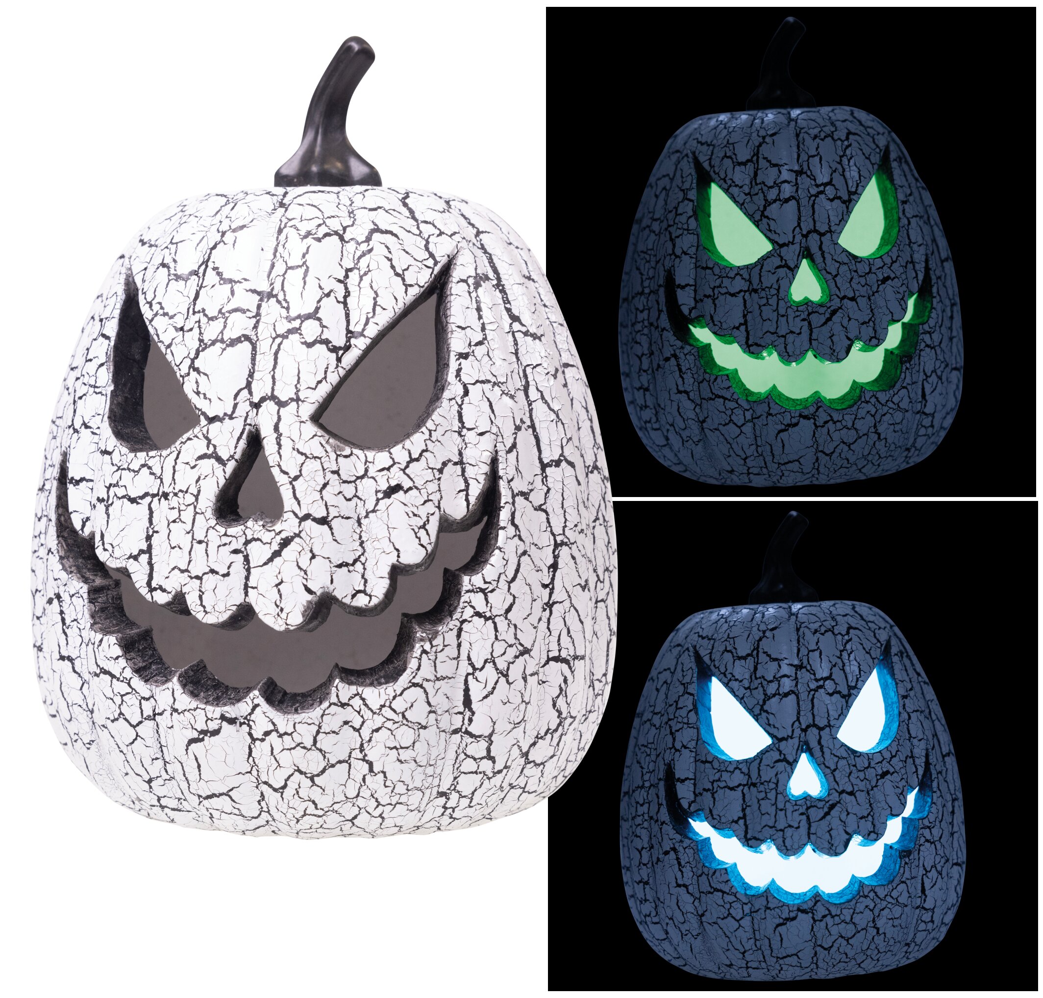 Dekorativer Kürbis mit weiß-schwarzer Oberfläche und gruseligem Gesicht. Inklusive in verschiedenen Farben blinkender LED-Leuchten innen.