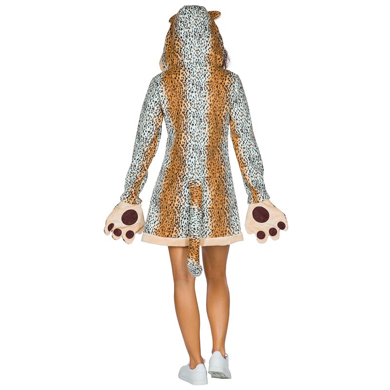 Kapuzenkleid aus Fleece in Leopardenmuster. An der Kapuze sind Ohren und an der Rückseite ein ausgestopfter Leopardenschwanz angenäht. Inklusive überdimensionaler Fäustlinge mit einem Pfotenmuster auf den Handflächen, die an den Ärmeln angenäht sind und auch hochgeklappt getragen werden können.
