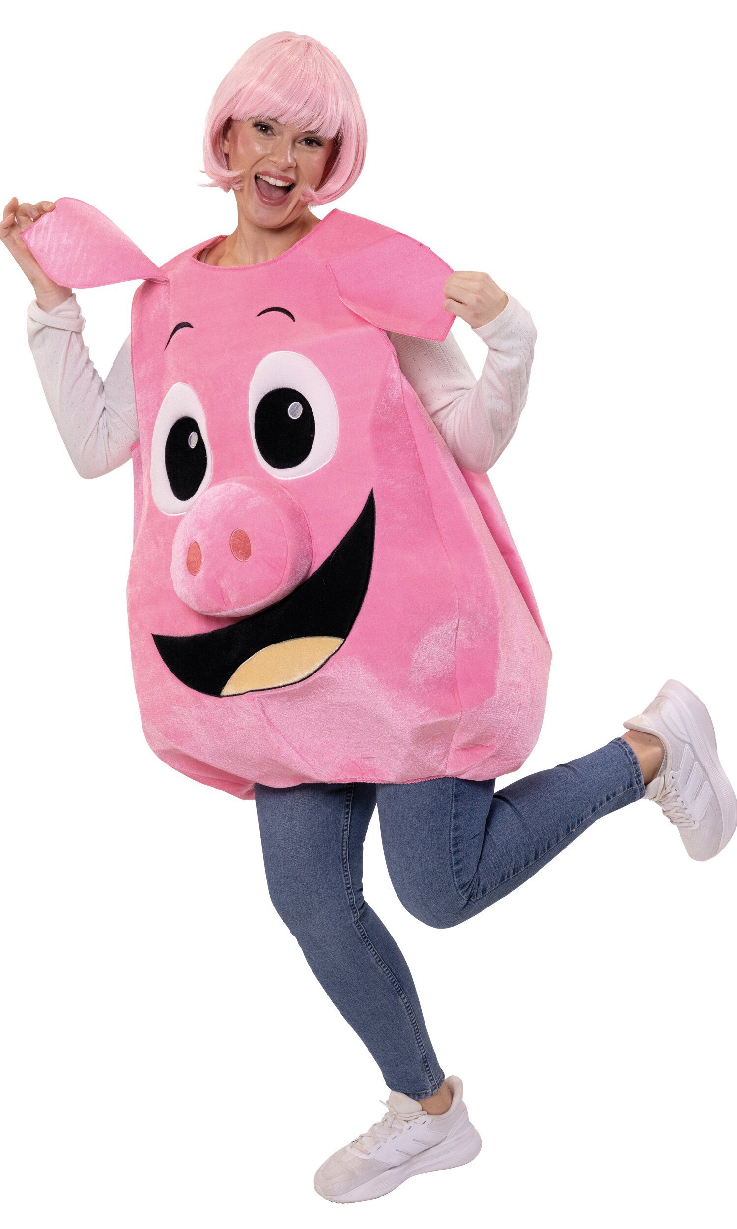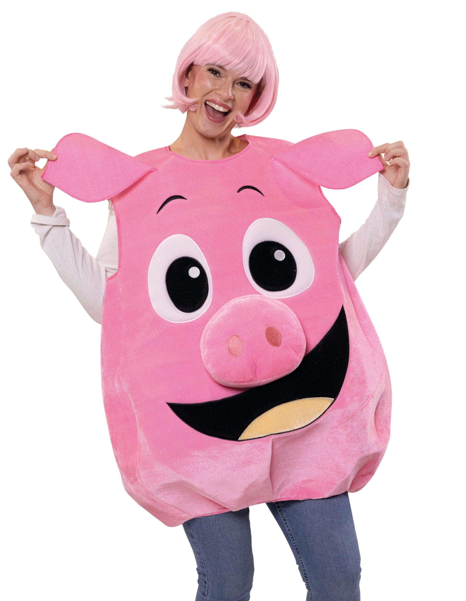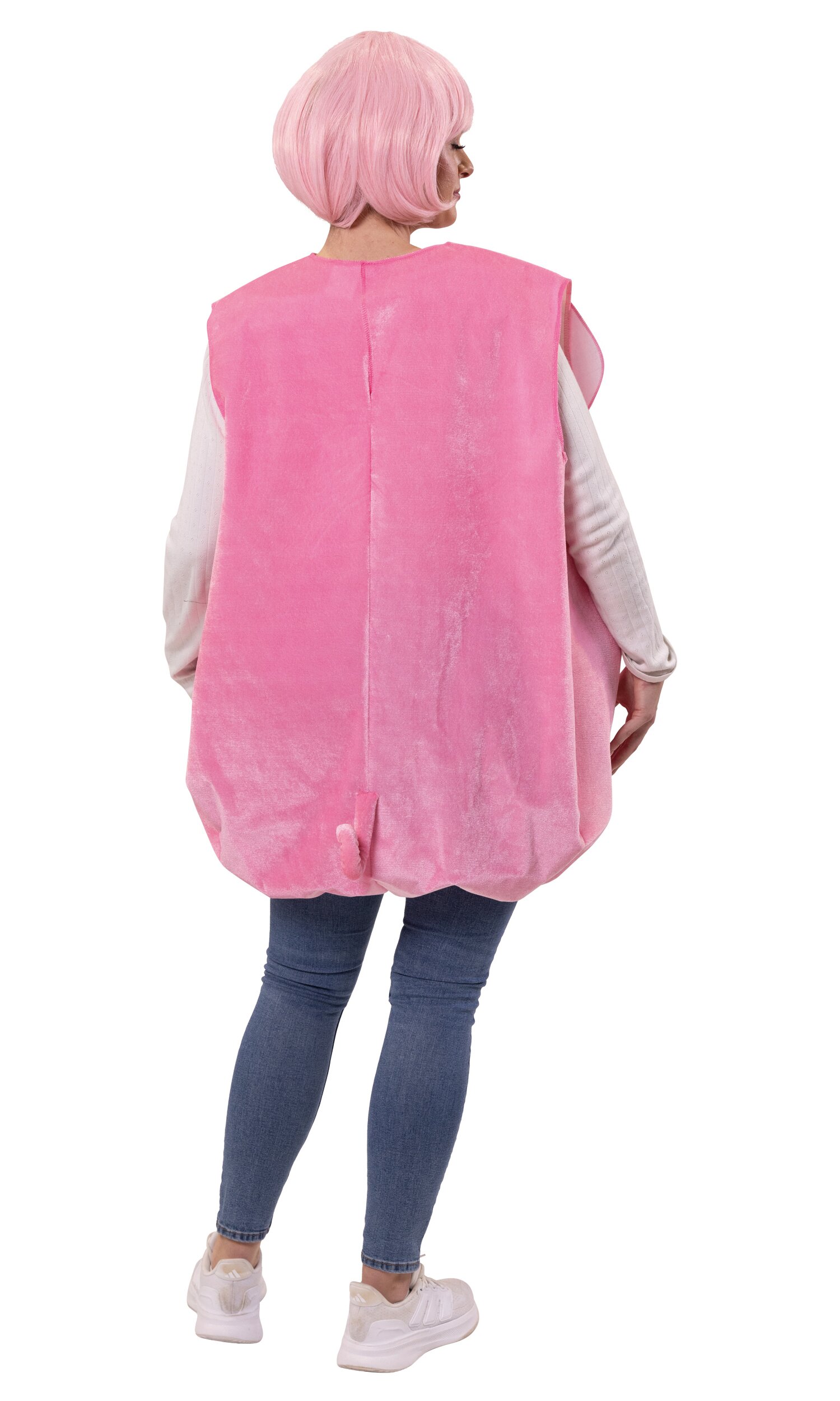 Rosarotes, ärmelloses Oberteil zum Überziehen für Erwachsene. Der Stoff in Nicki-Optik ist auf der Vorderseite mit flexiblem Schaumstoff unterlegt. Vorn sind Ohren, große Augen, eine gepolsterte große Nase sowie Mund und Augen appliziert bzw. gestick. Hinten ist das Kostüm uni rosa und wird mit einem Klettpunkt im Nacken geschlossen. Durch Abnäher unten erhält es eine rundliche Form.