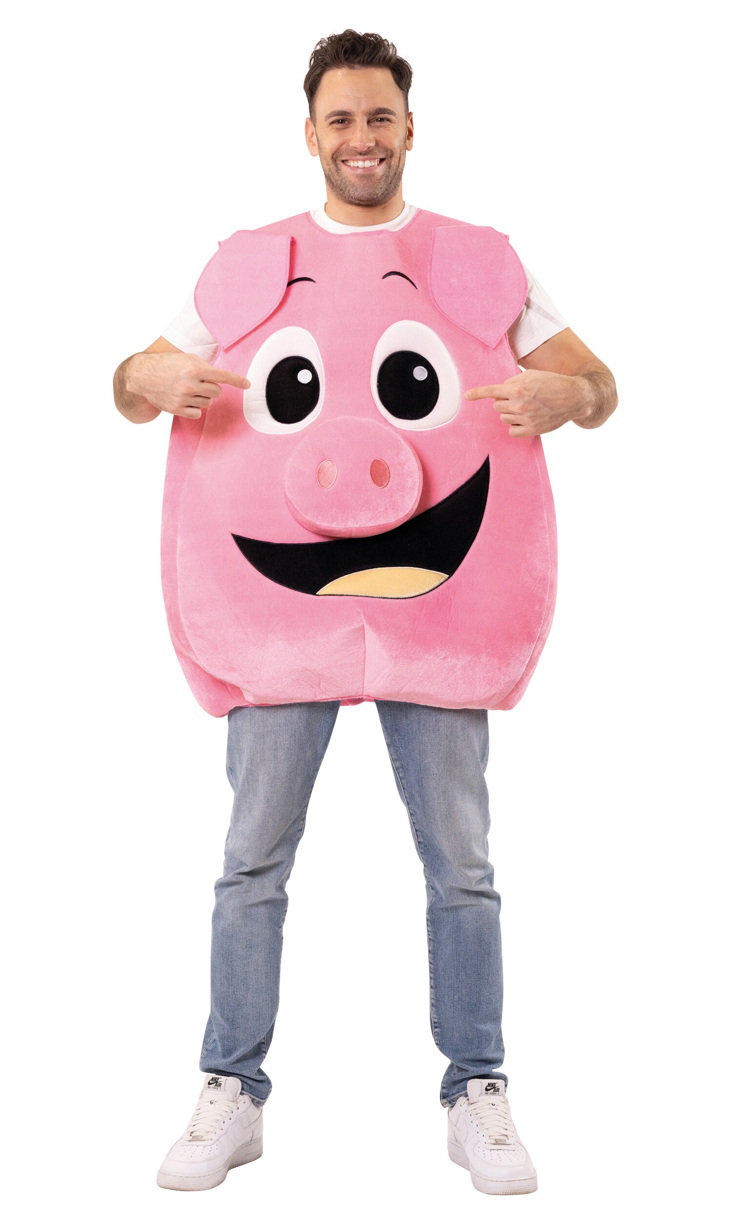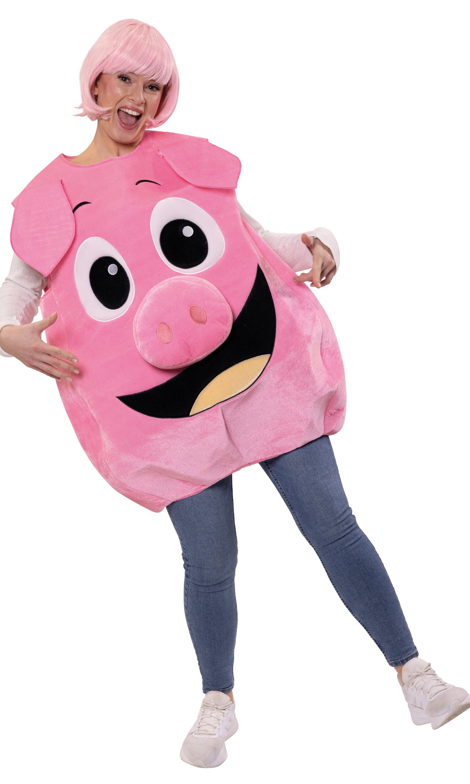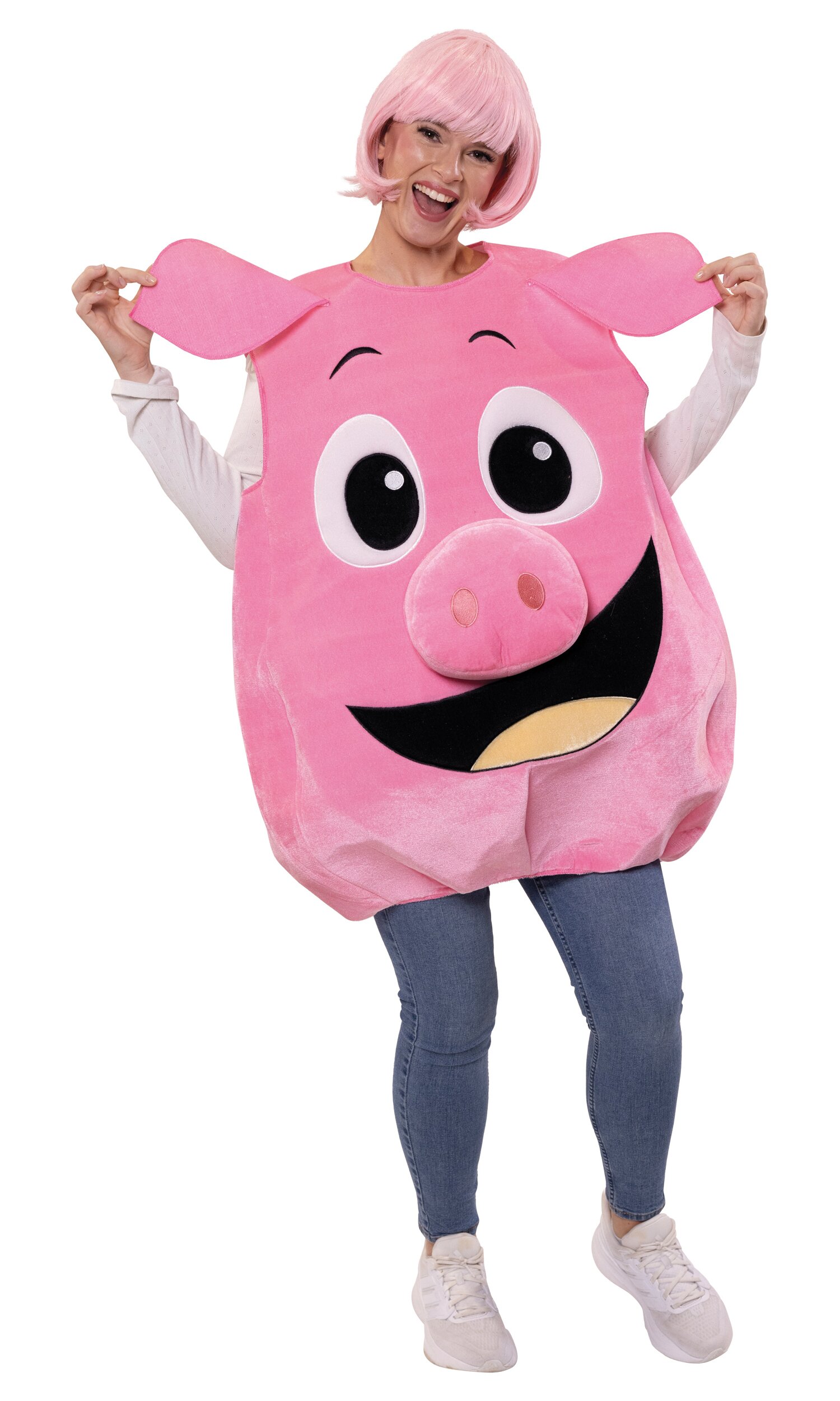 Rosarotes, ärmelloses Oberteil zum Überziehen für Erwachsene. Der Stoff in Nicki-Optik ist auf der Vorderseite mit flexiblem Schaumstoff unterlegt. Vorn sind Ohren, große Augen, eine gepolsterte große Nase sowie Mund und Augen appliziert bzw. gestick. Hinten ist das Kostüm uni rosa und wird mit einem Klettpunkt im Nacken geschlossen. Durch Abnäher unten erhält es eine rundliche Form.