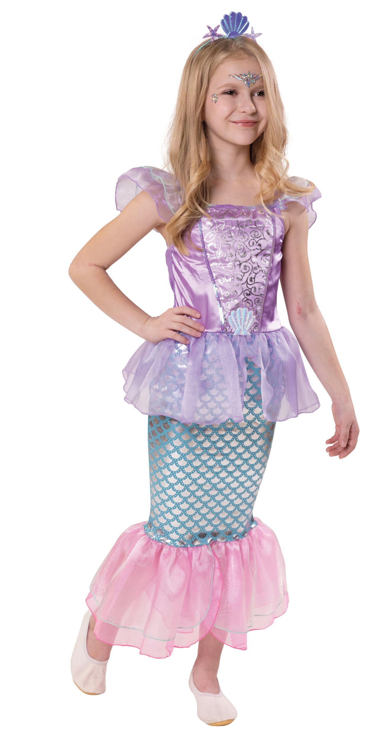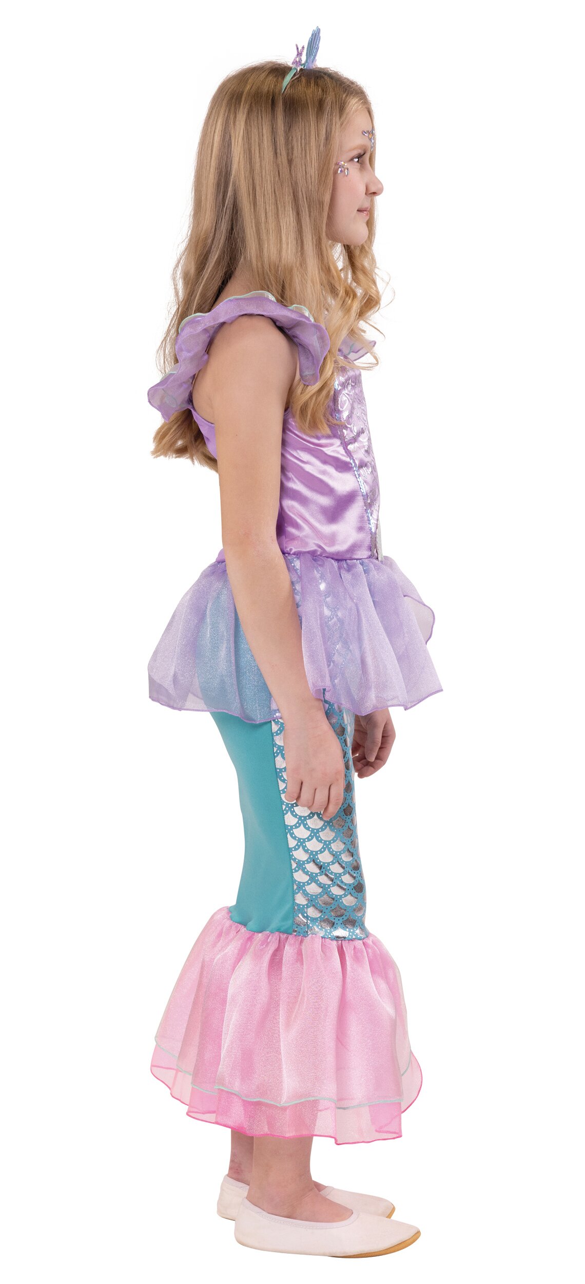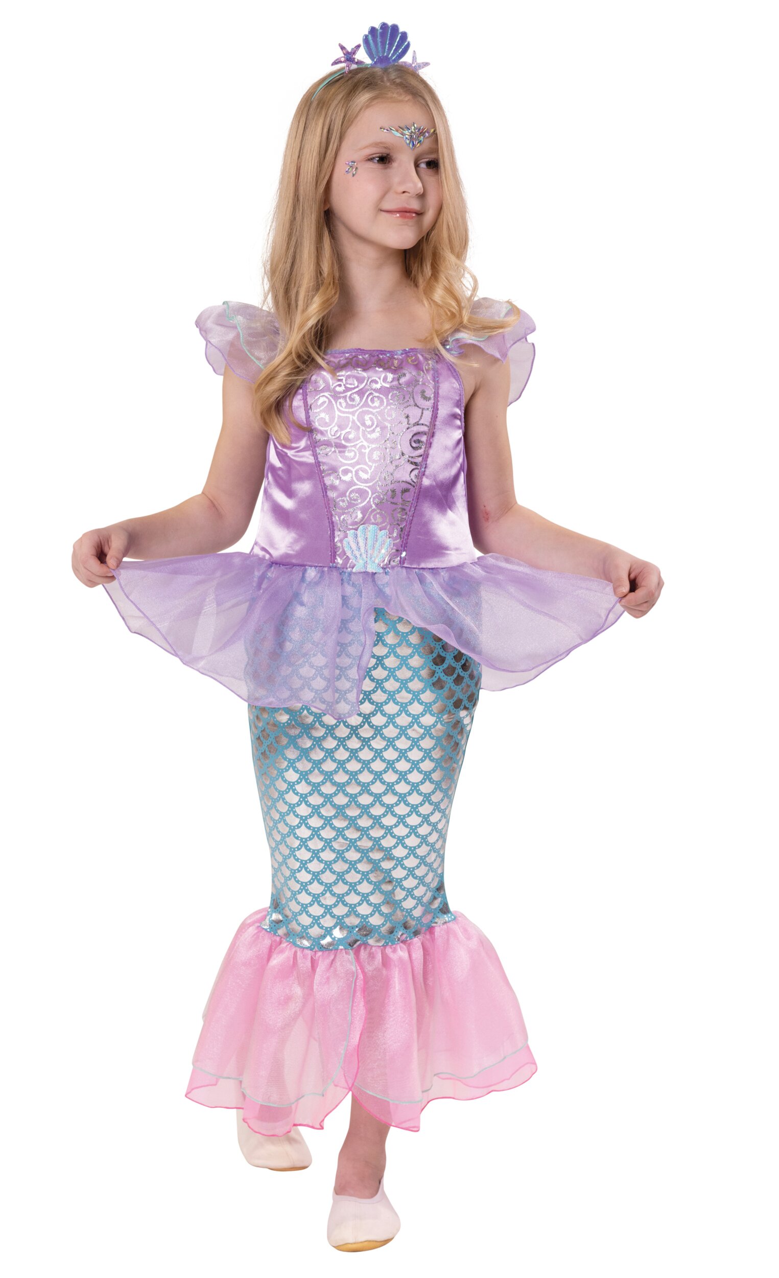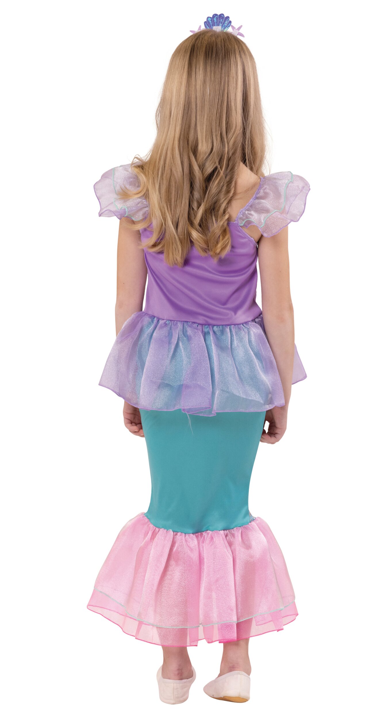 Das Oberteil des Kleides begeistert mit glänzendem Stoff, zarten Organza-Rüschen an den Schultern und dekorativen Ornamenten. Der Rock ist im typischen Meerjungfrauen-Look mit schimmerndem Schuppenmuster gestaltet und endet in einer luftigen, rosafarbenen Flosse aus transparentem Stoff. Die harmonischen Farben in Lila, Türkis und Rosa verleihen dem Kostüm einen besonders märchenhaften Look.