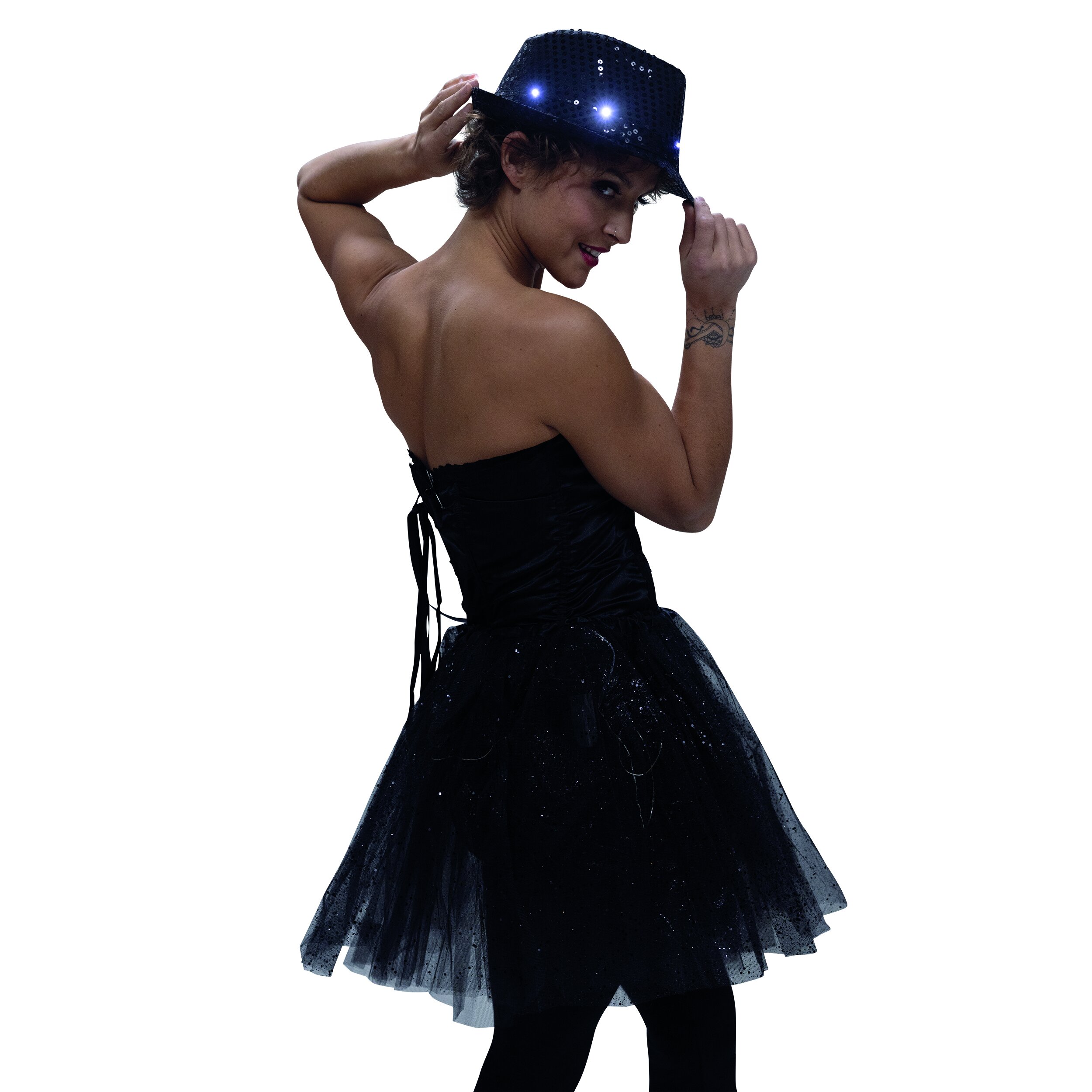Schwarzer Fedorahut, der mit Pailletten und kleinen Blinklichtern besetzt ist. Batterien sind beinhaltet.
