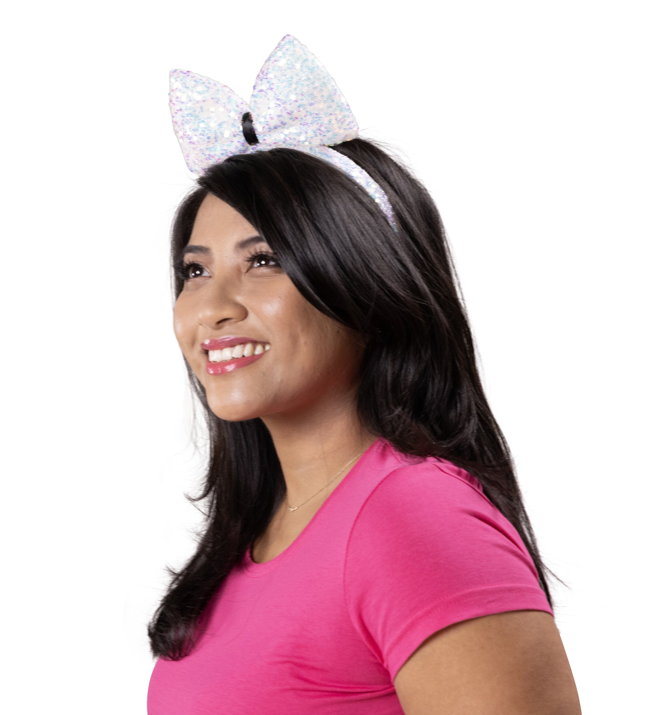 Ein mit Paillettenstoff bezogener Haarreif mit weißen, paillettenbesetzten Schleifen.