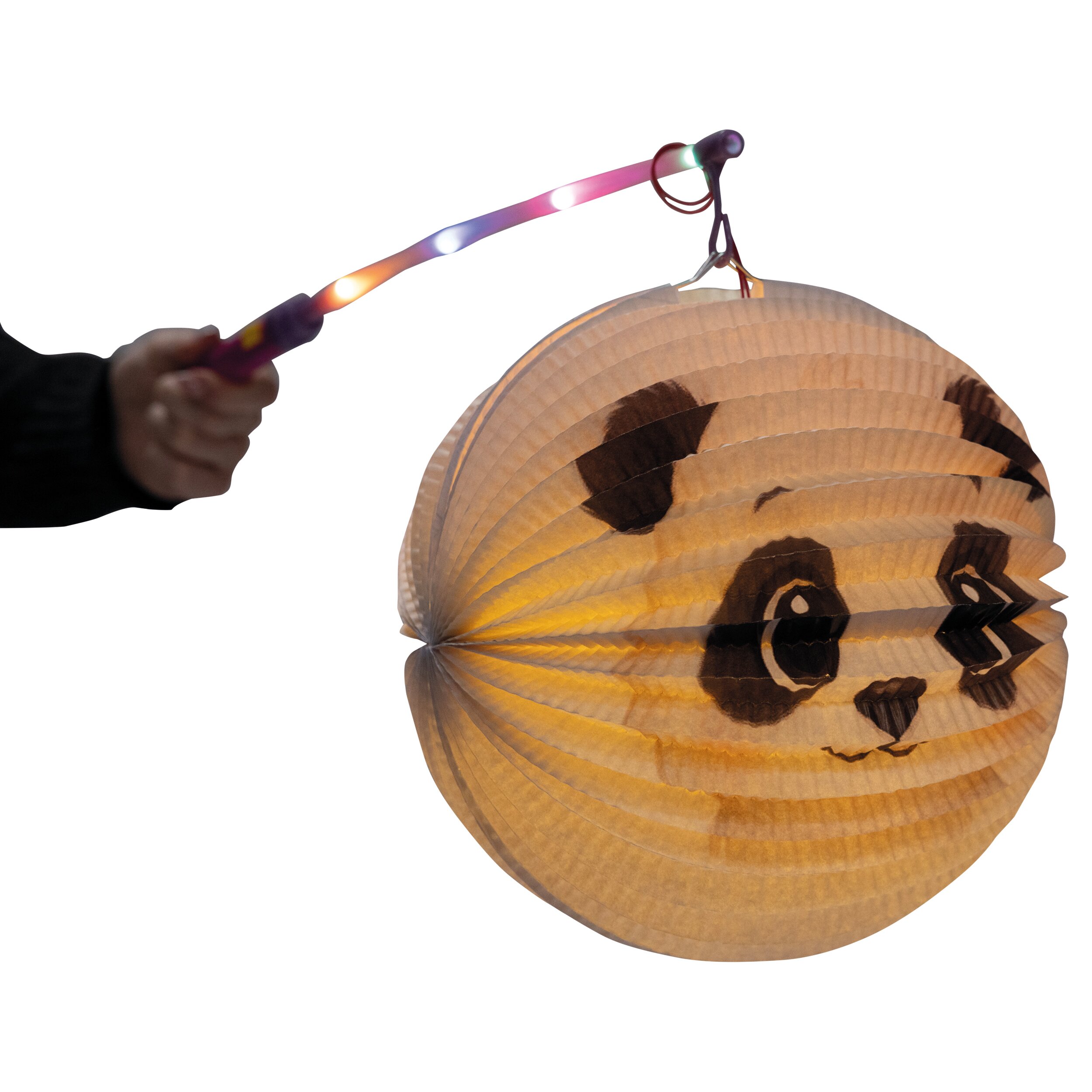 Die Papierlaterne mit Panda-Motiv hat einen Durchmesser von ca. 25 cm und besteht aus gefaltetem Papier, das beim Beleuchten für einen stimmungsvollen Lichteffekt sorgt. Dank des praktischen Metallbügels lässt sich die Laterne ganz einfach an einem Laternenstab befestigen und bequem tragen.