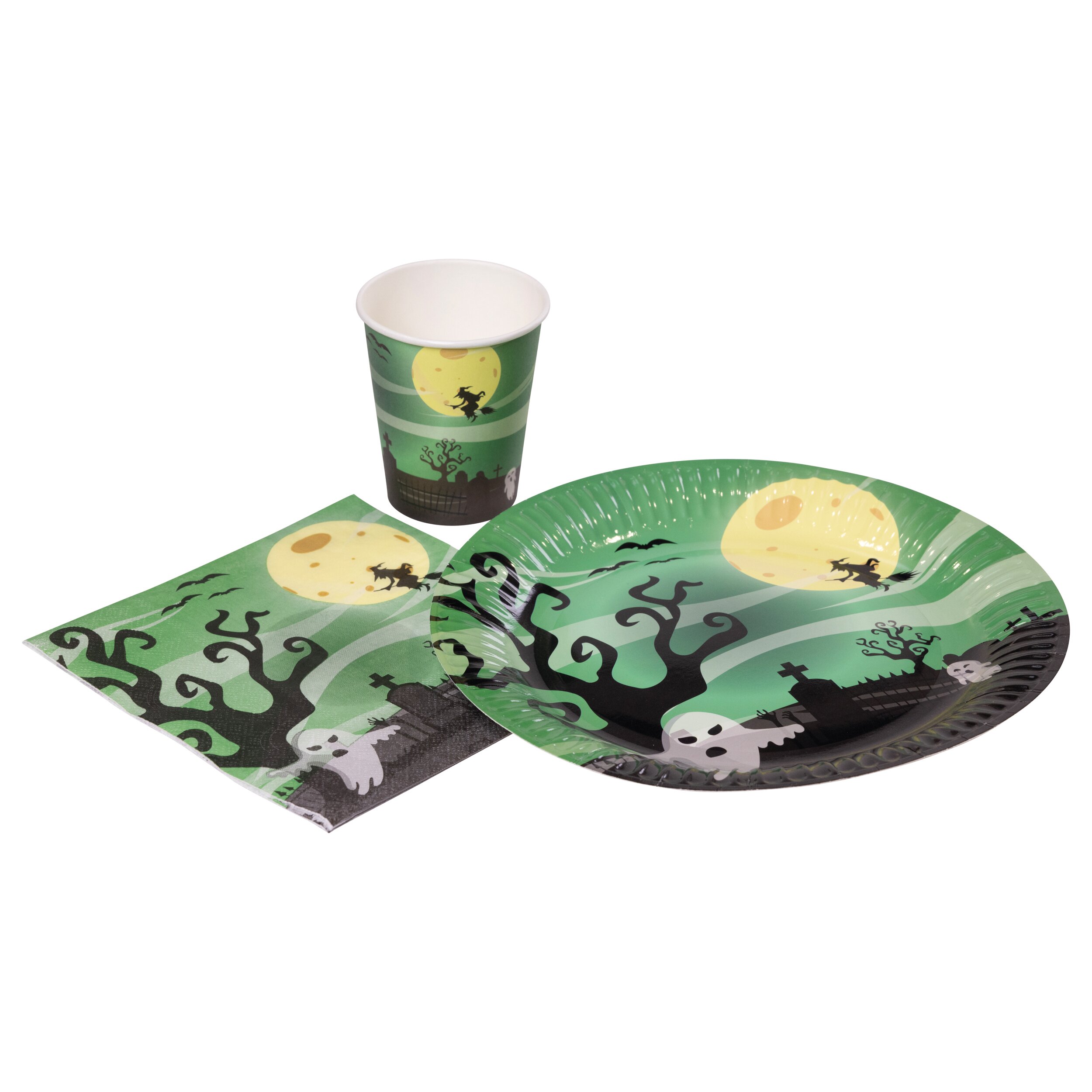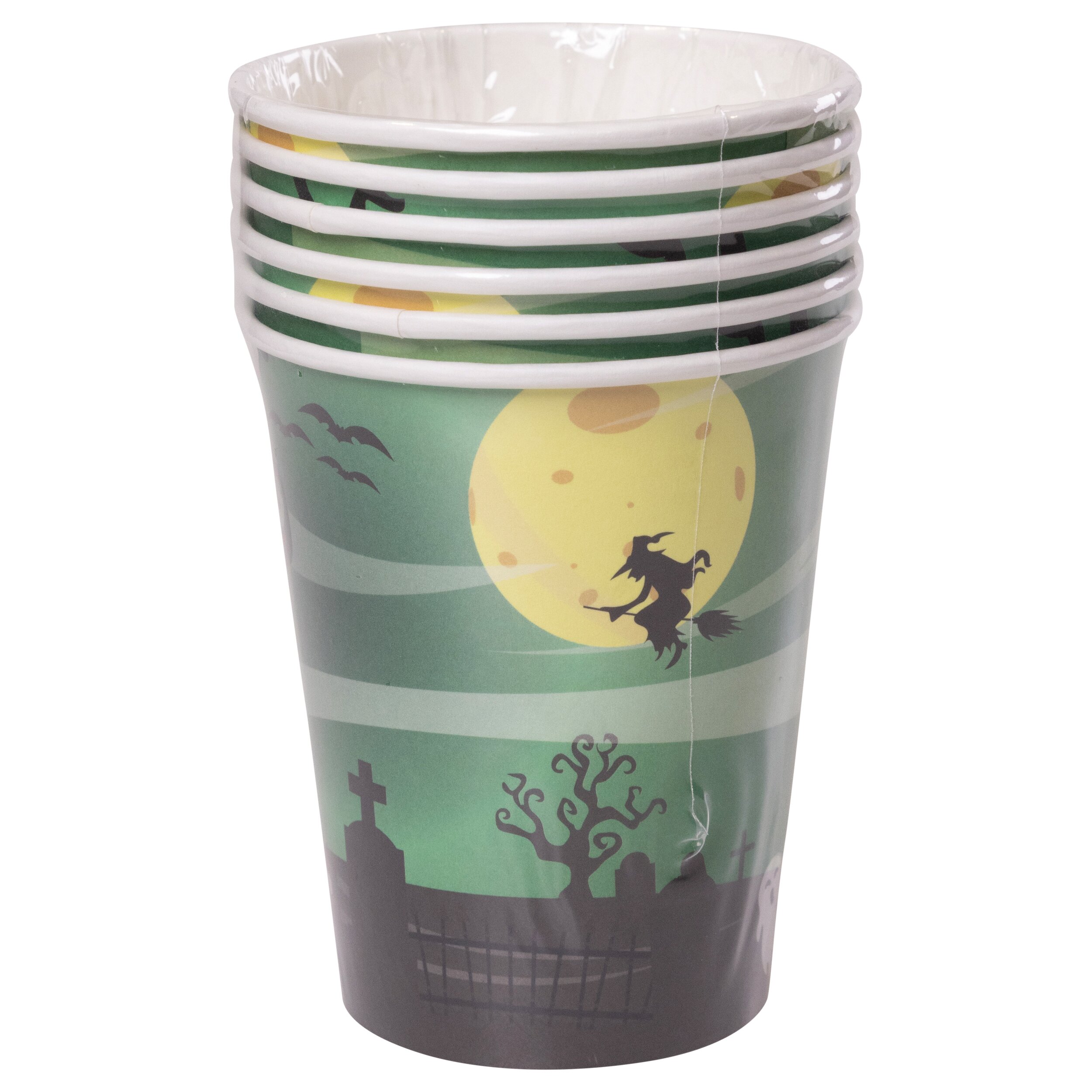Diese Pappbecher mit Geistermotiv sind die perfekte Ergänzung für eine stimmungsvolle Halloweenparty. Das schaurig-schöne Design zeigt eine geheimnisvolle Nachtlandschaft mit Vollmond, fliegender Hexe, Geistern und einem düsteren Friedhof – ideal für eine gruselige Halloween Tischdekoration.