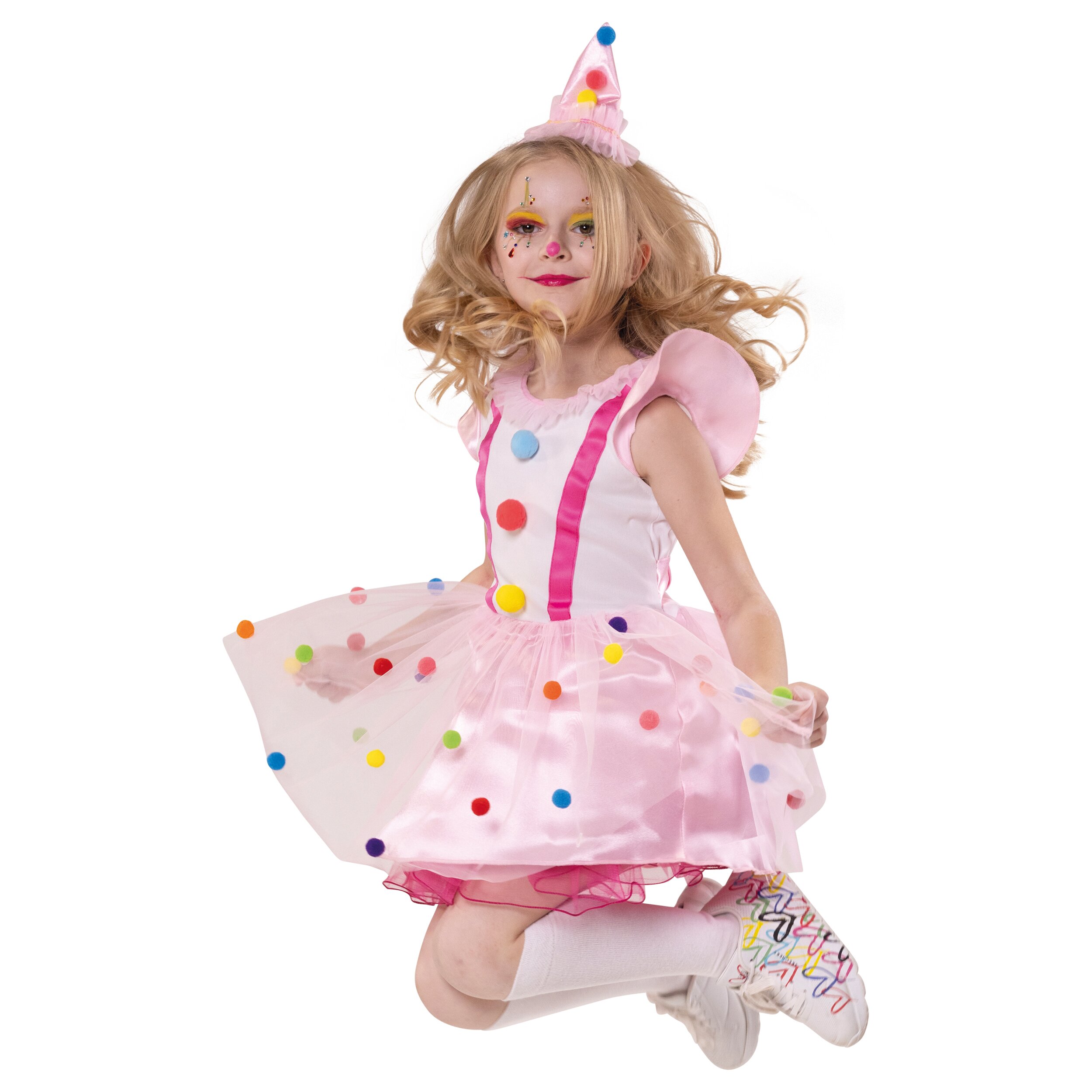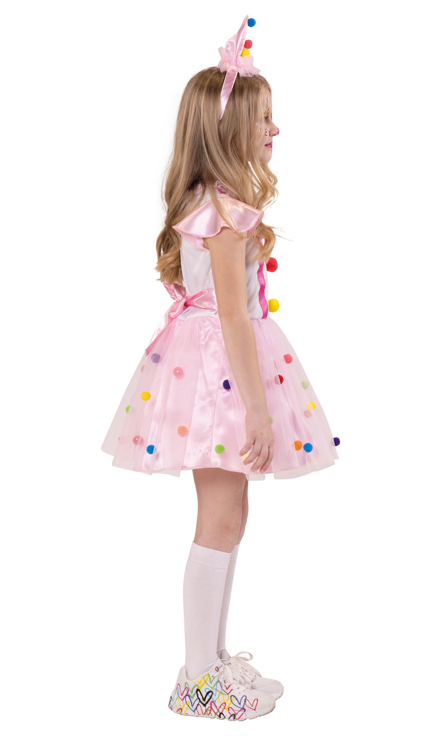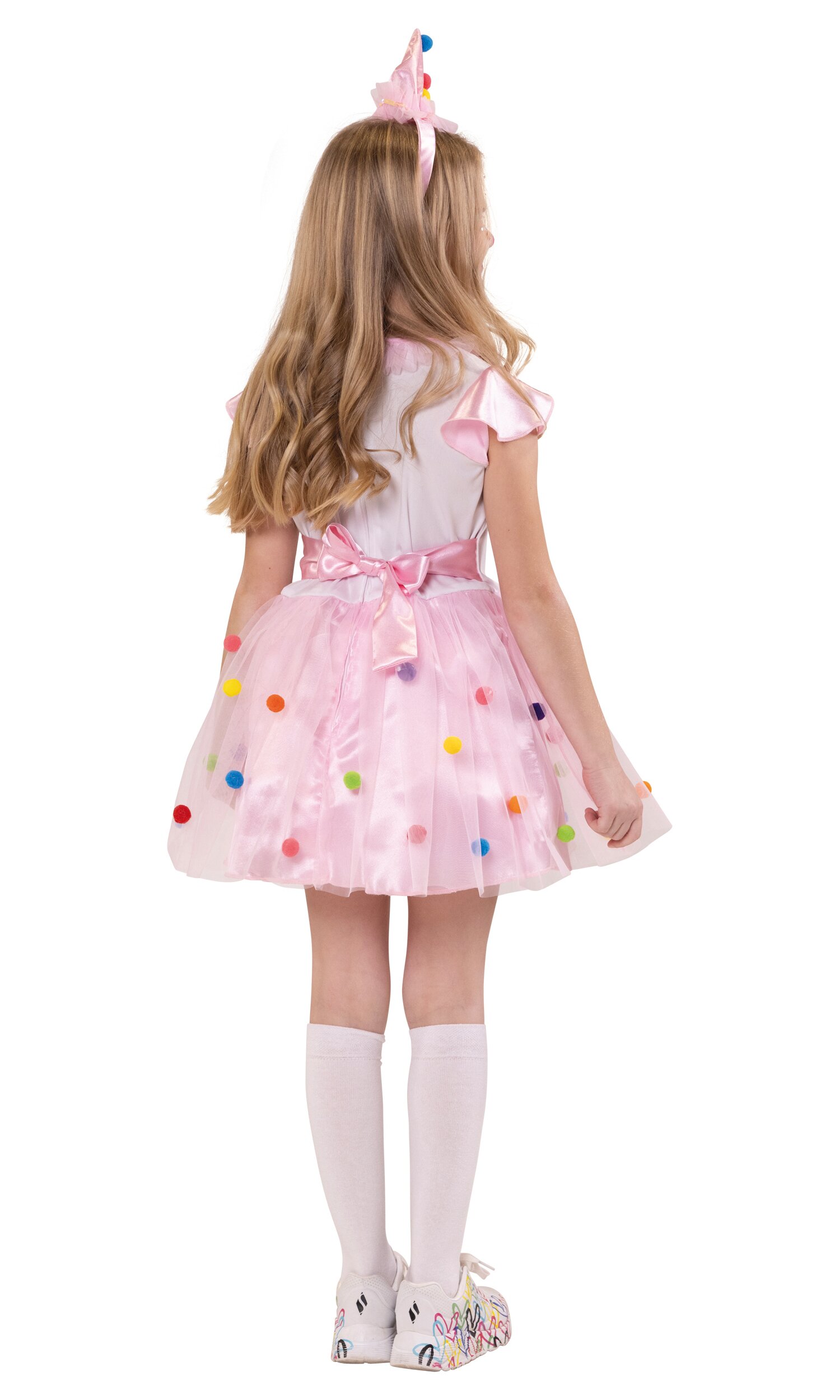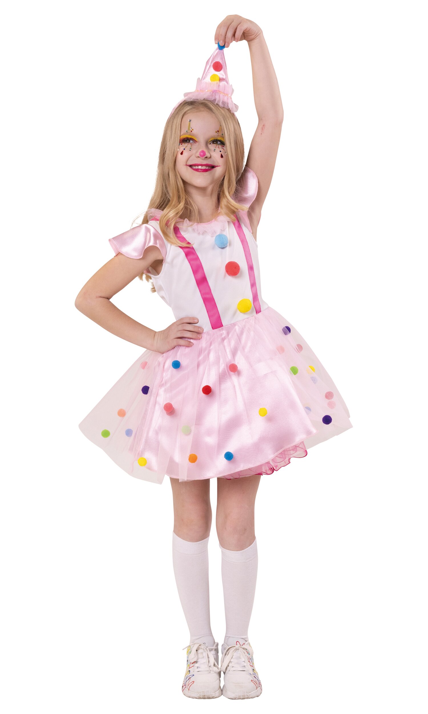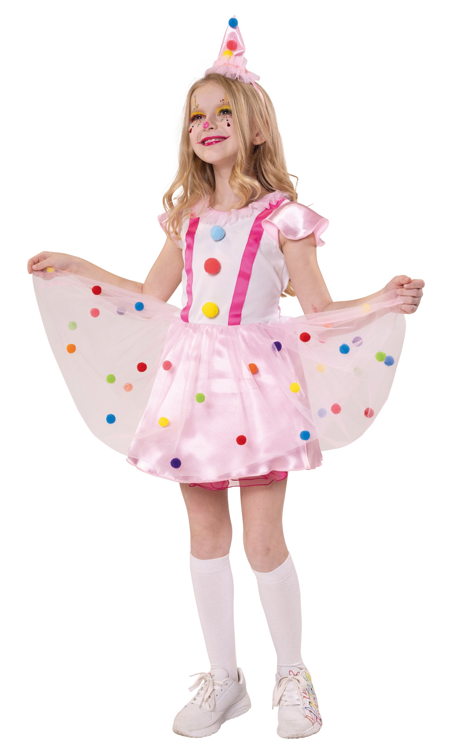 Die Cap-Ärmel sind aus dem gleichen glänzenden Stoff wie der Rock, über dem eine zweite Lage rosa Tüll mit bunten Pompons liegt. Das Kleid wird hinten mit Reißverschluss geschlossen und hat einen Ziergürtel. Im Lieferumfang ist ein passender Haarreif mit spitzem rosa Hut enthalten. Dieser ist mit Pompons, Tüll und Paillettenband verziert, der Haarreif ist mit rosa glänzendem Stoff ummantelt.