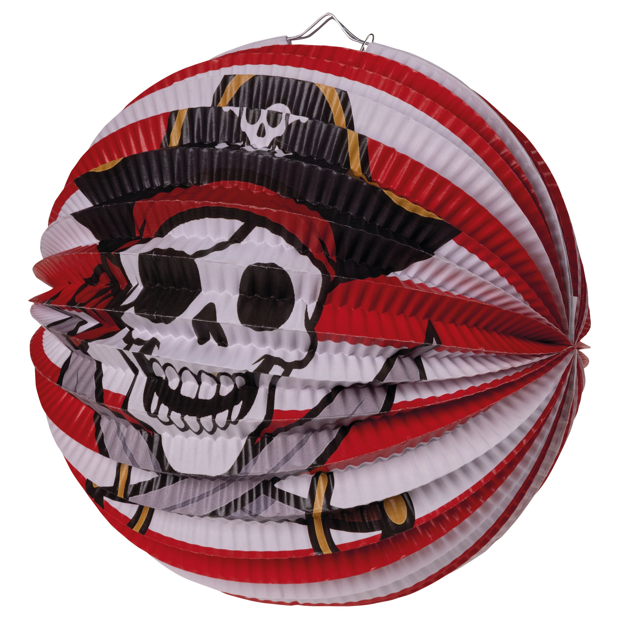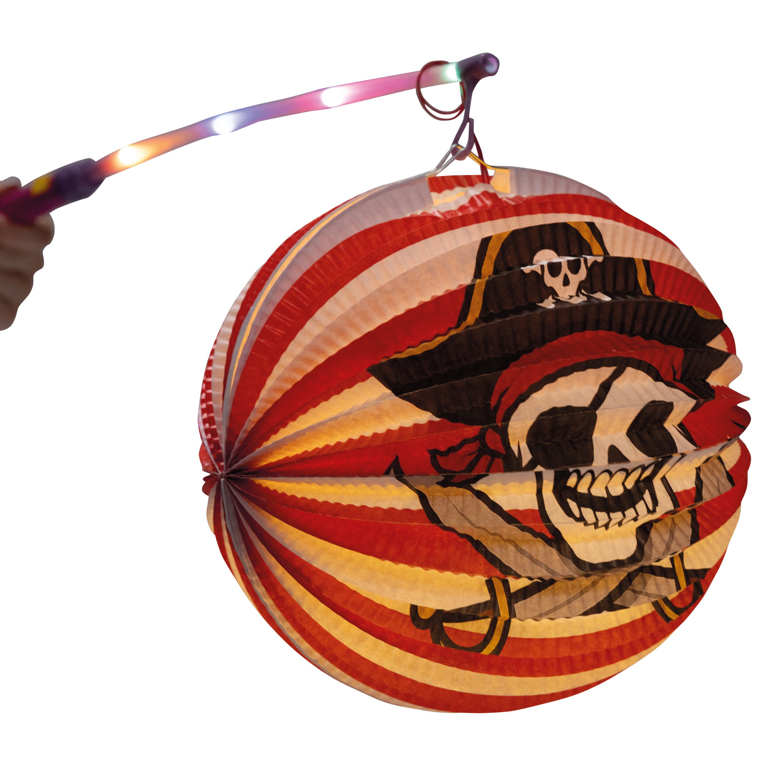 Die runde Papierlaterne hat einen Durchmesser von ca. 25 cm und überzeugt durch ihre kräftigen Farben und das detailreiche Piratenmotiv. Durch die gefaltete Struktur der Laterne entsteht beim Beleuchten ein besonders schöner Lichteffekt, der das Motiv eindrucksvoll hervorhebt.