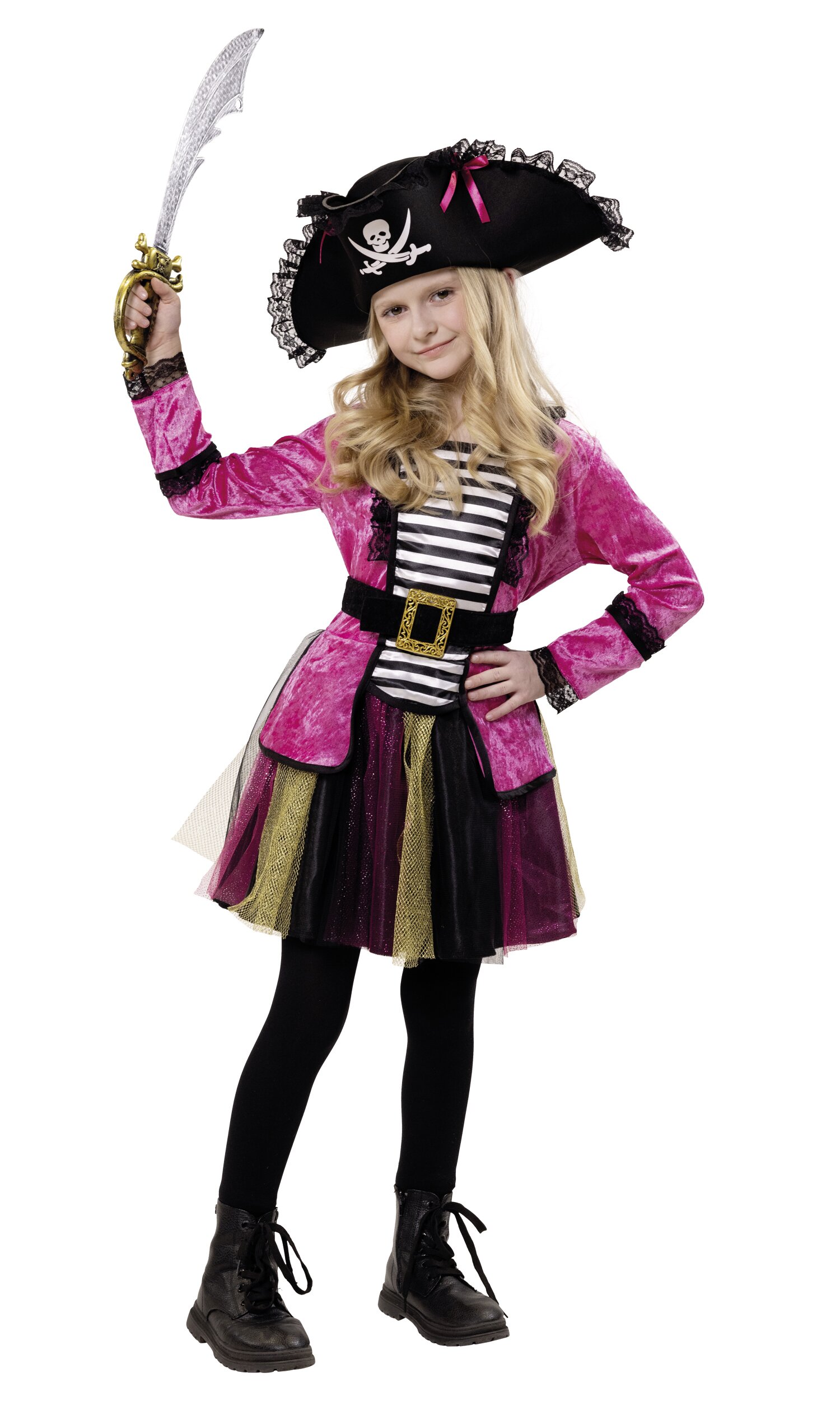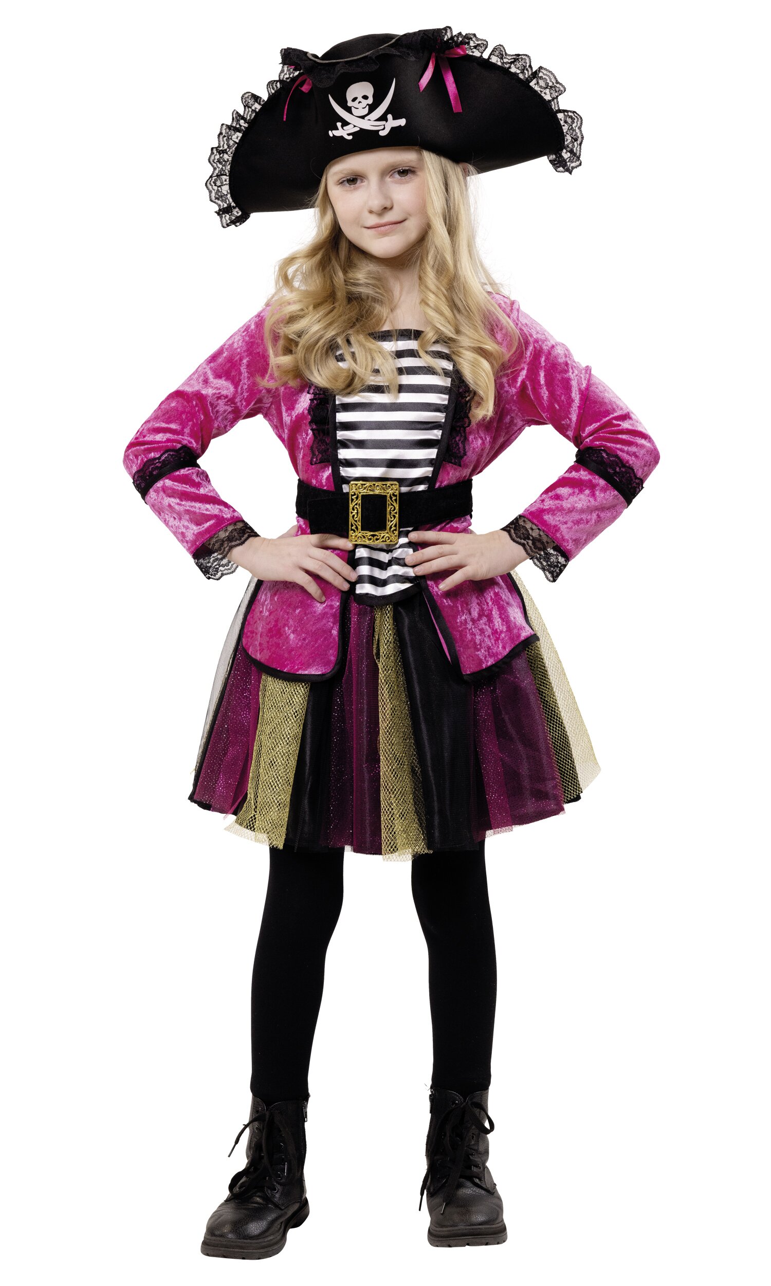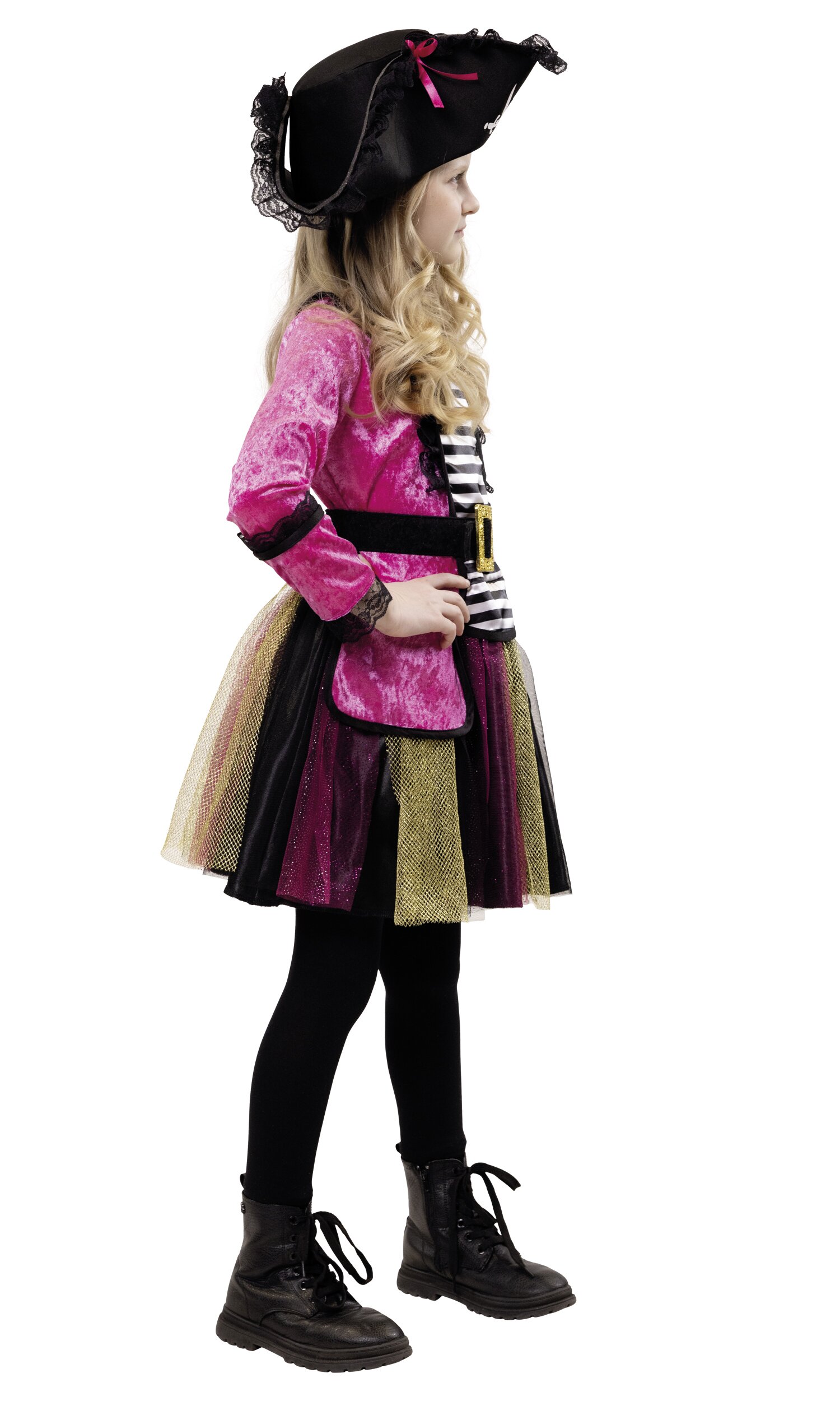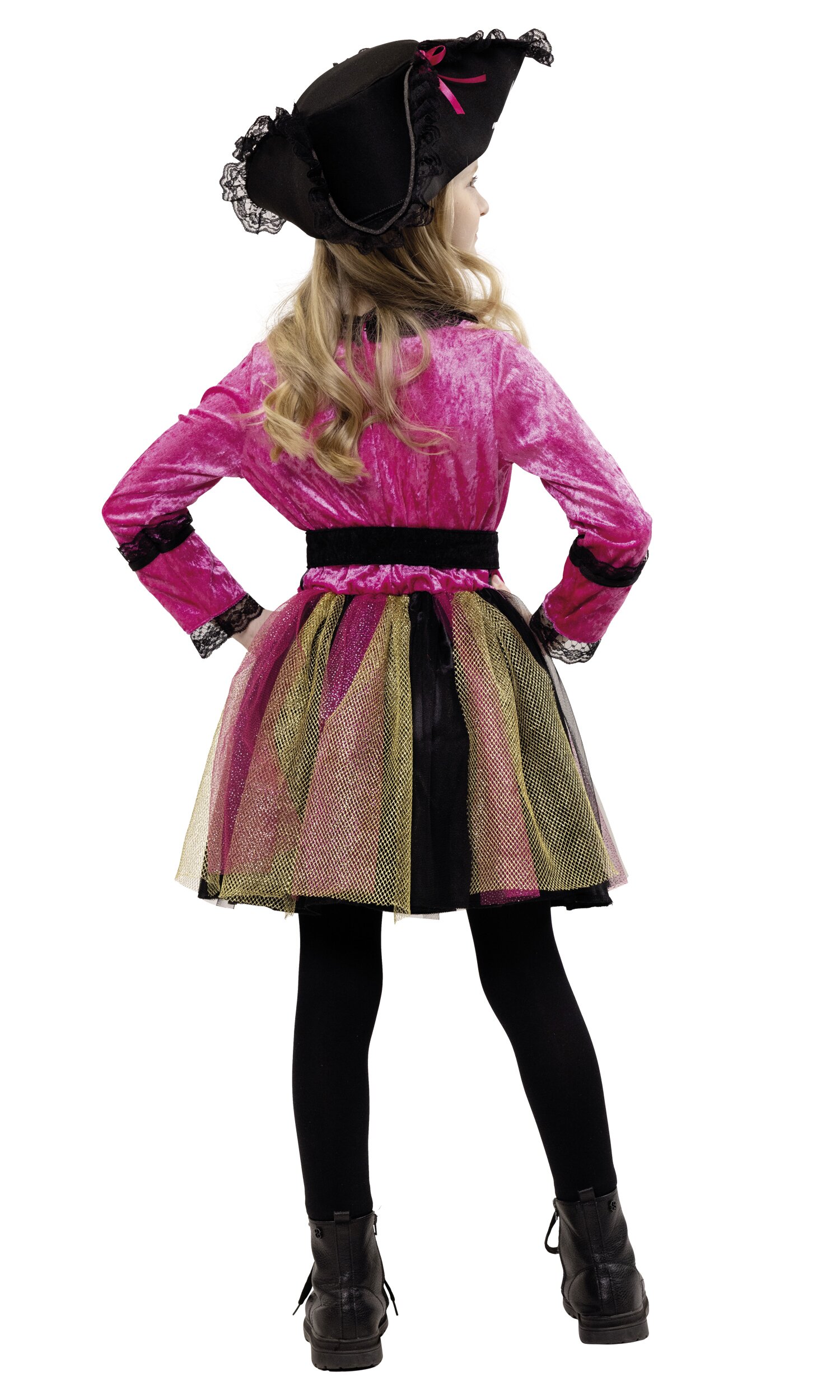 Ahoy, kleine Piratinnen! Mit dem Piratin Rosa Kostüm wird der Karneval zur aufregenden Schatzsuche. Das Set besteht aus einem pinken Oberteil aus veloursähnlichem Stoff, das mit einer schwarz-goldenen Schnalle im Bauchbereich verziert ist. Der tüllige Rock in Schwarz, Pink und Gold lässt jedes Abenteuer lebendig werden. Der Piratenhut mit Totenkopf-Logo und pinken Schleifen rundet das Outfit ab und sorgt für den perfekten Piraten-Look.
