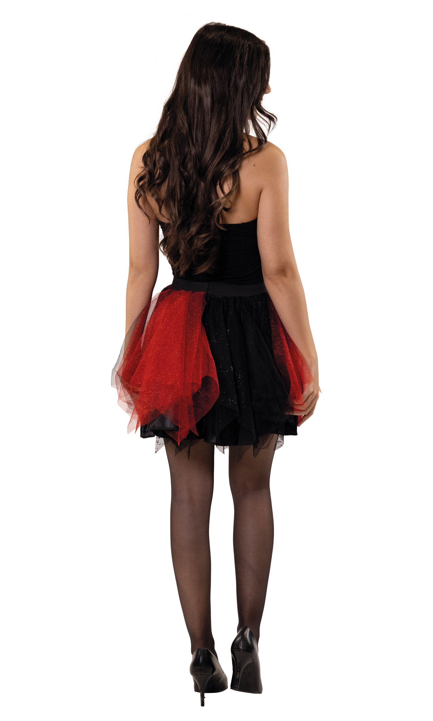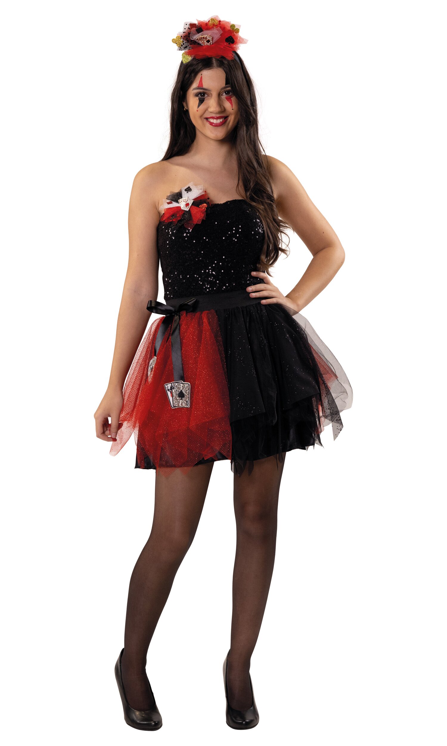 Der Rock besteht aus glitzerndem Tüll in Rot und Schwarz und ist mit vereinzelten Spielkarten-Motiven verziert – ideal für einen auffälligen Casino- oder Poker-Partylook. Perfekt kombinierbar und ein echter Hingucker auf Karneval, Fasching oder Mottopartys!
