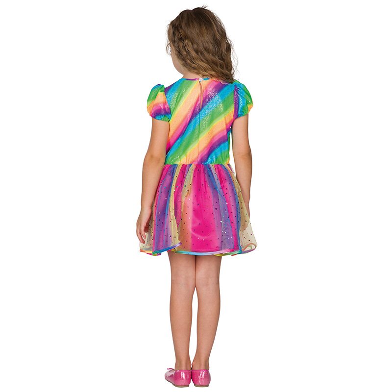 Kurzärmliges Kleidchen in kräftigen Regenbogenfarben, das auf der Brust mit einem Dekoherz und um die Taille mit Blüten verziert ist. Das Kleid hat einen Überrock aus glitzerndem Tüll.