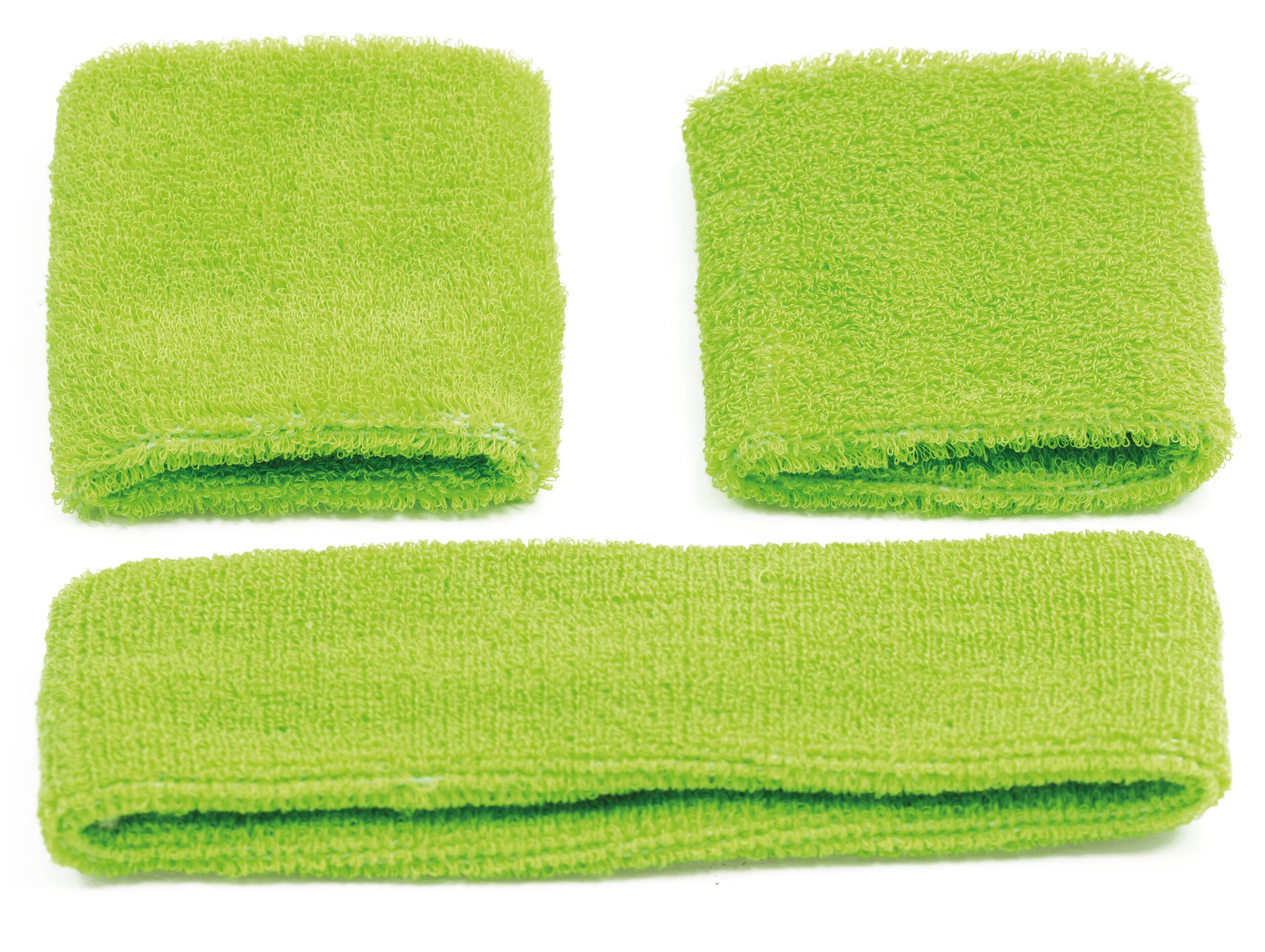 Tennis, Aerobic oder Fußball: Schweißbänder waren für Sportler fast aller Disziplinen in den 80ern ein wichtiges Fashion-Accessoire. Dieses 3-teilige Set besteht aus zwei Armbändern und einem Stirnband aus neongrünem Frotteestoff.
