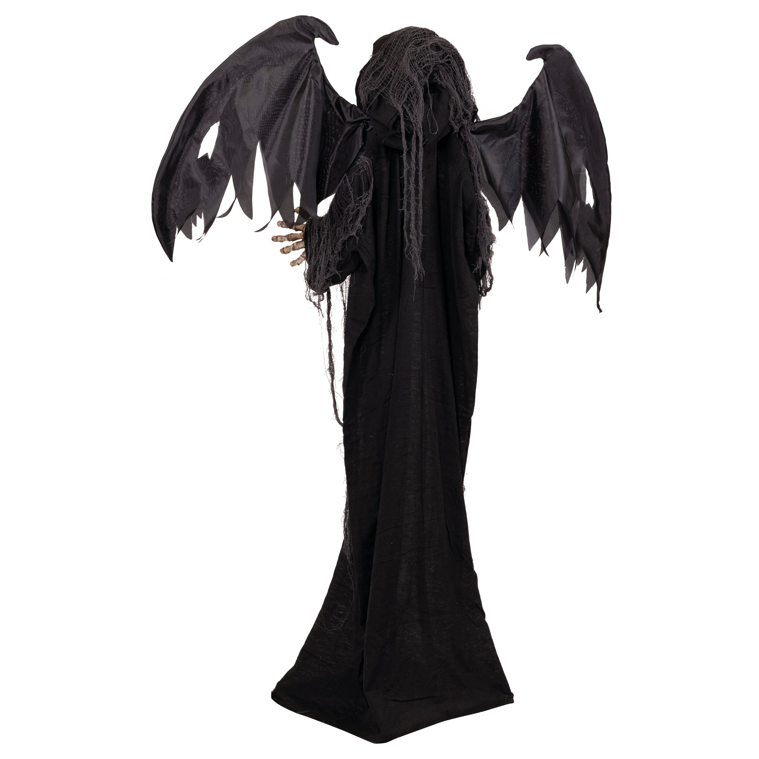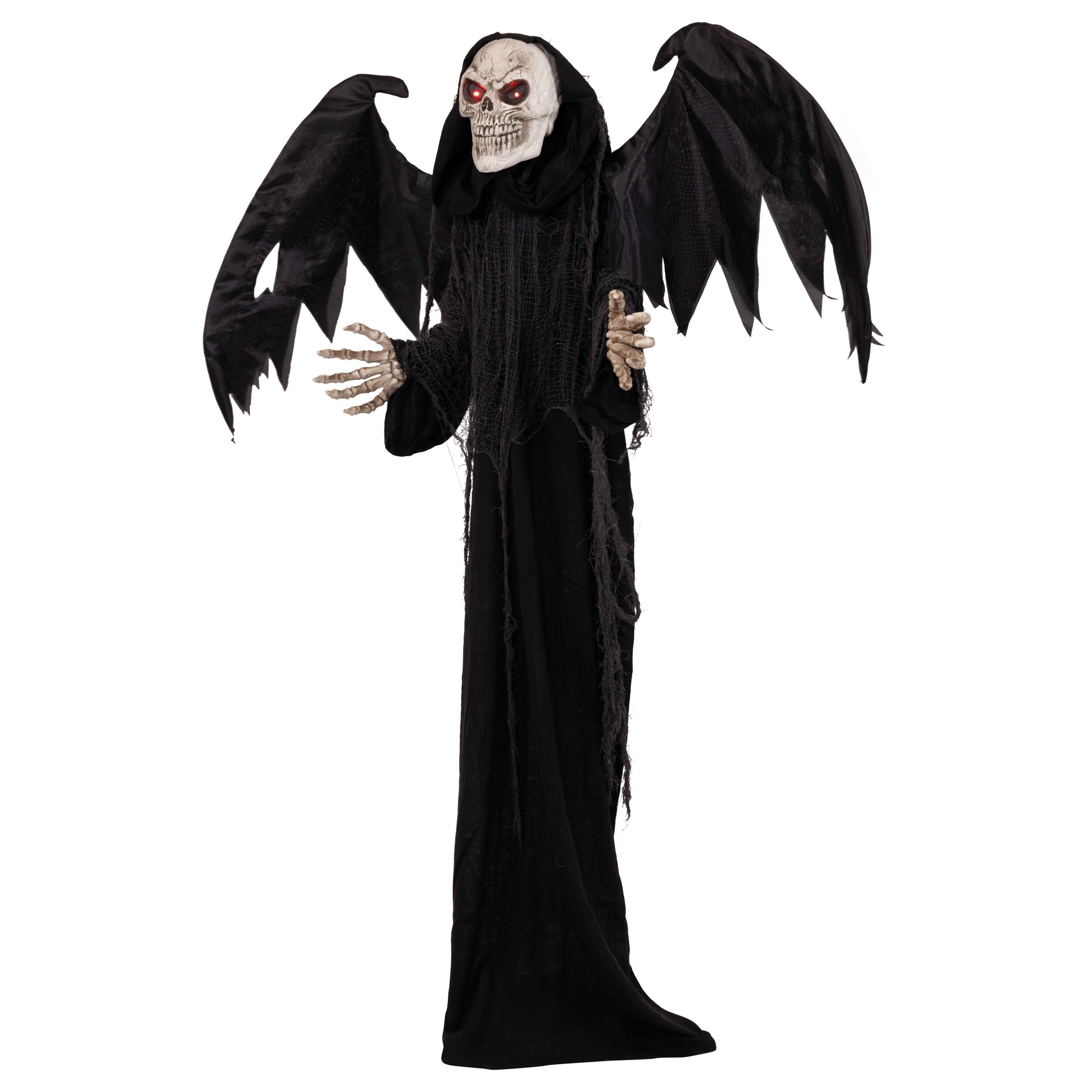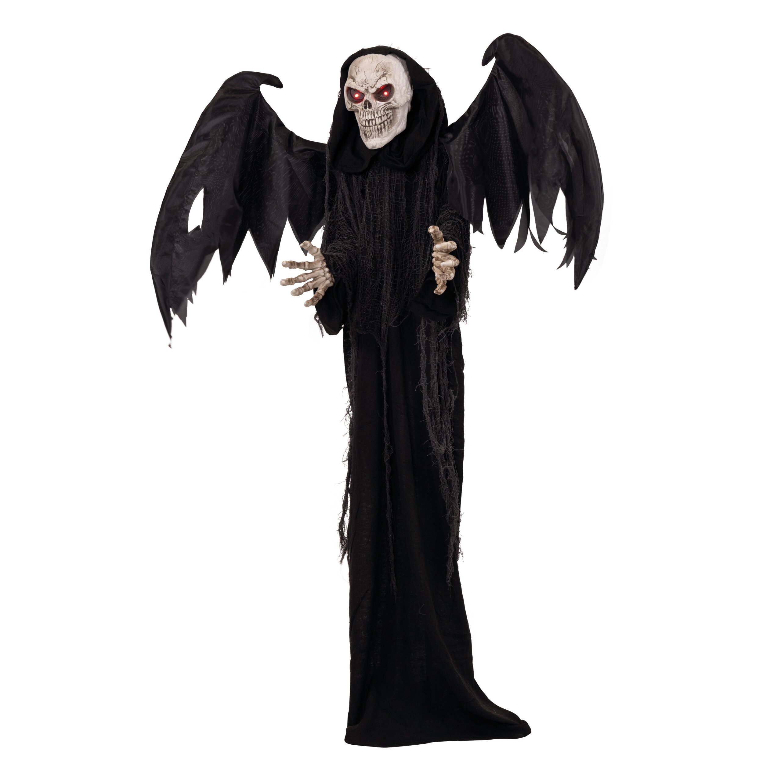 Die unheimliche Gestalt trägt ein dunkles Gewand mit ausgebreiteten Flügeln und einem furchterregenden Totenkopf. Sobald der integrierte Sensor auf Licht oder Geräusche reagiert, beginnt das Skelett sich zu bewegen: Arme und Kopf bewegen sich, während gleichzeitig gruselige Sounds abgespielt werden und die Augen rot aufleuchten. Dadurch entsteht ein besonders realistischer und erschreckender Effekt.