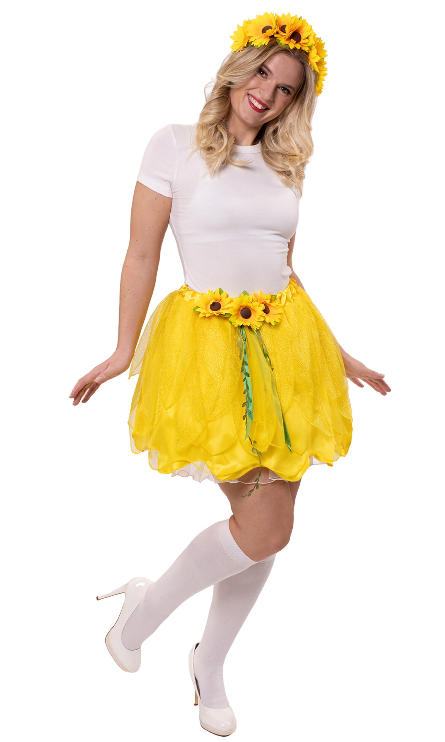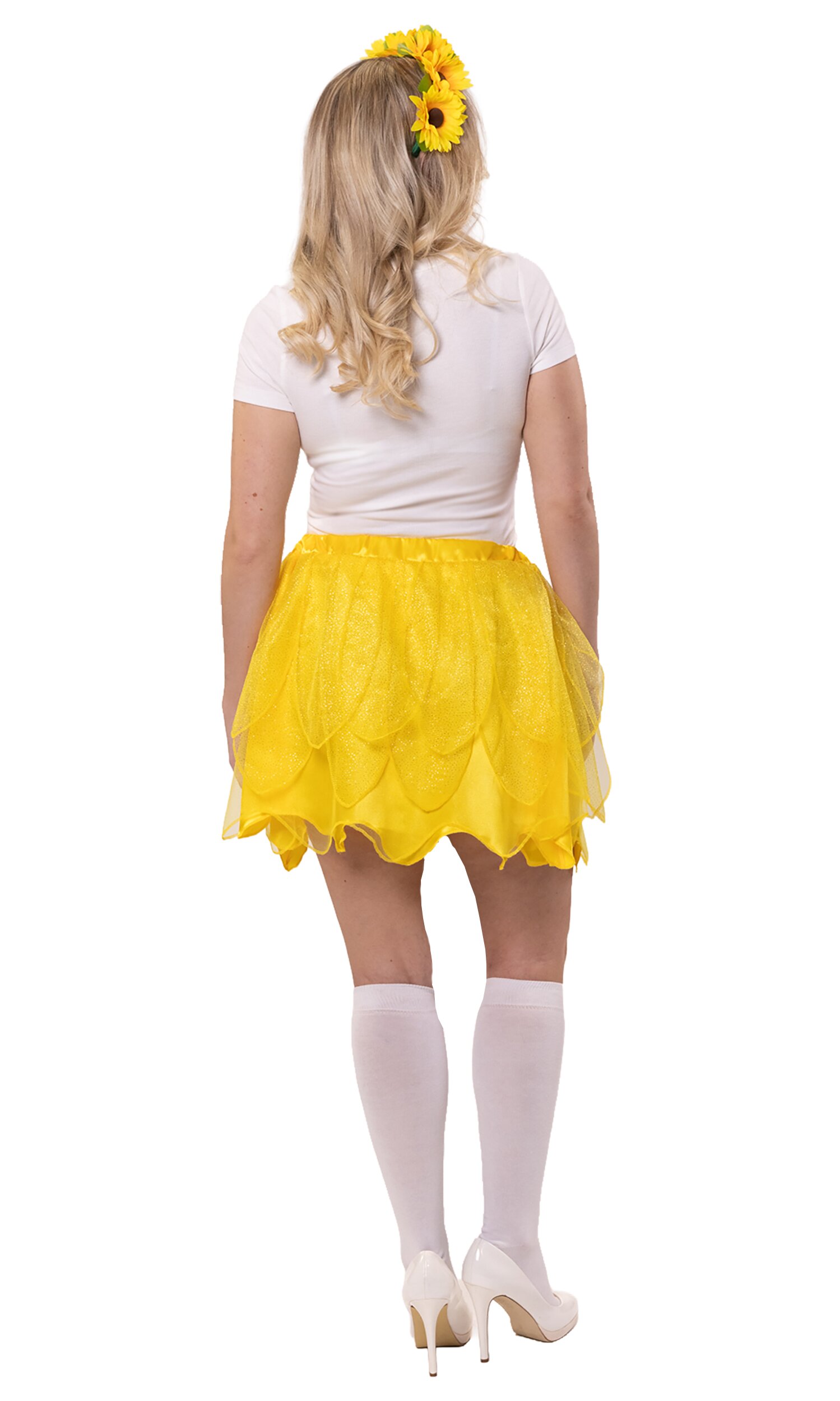 2-teiliges Set, bestehend aus einem gelben Rock und passendem Haarreif. Der Rock hat mehrere Lagen: Ein Unterrock aus Satin, darüber eine Lage aus gelbem Tüll und schließlich "Blätter" aus Tüll mit goldenem Glitzer. Vorne sind 3 Sonnenblumen aufgebracht sowie grüne Satinbänder und Blätter. Der grüne, stoffummantelte Haarreif ist mit 7 großen, gelben Sonnenblumen-Blüten besetzt und passt perfekt zum Rock.