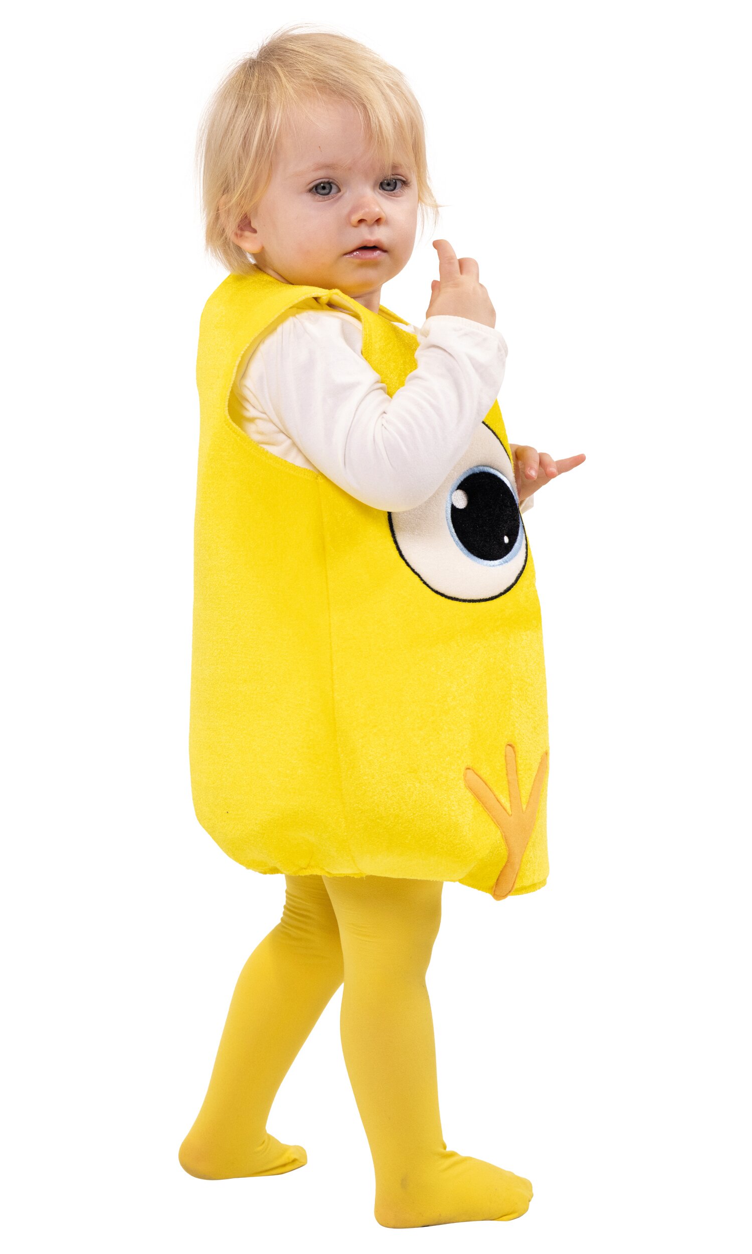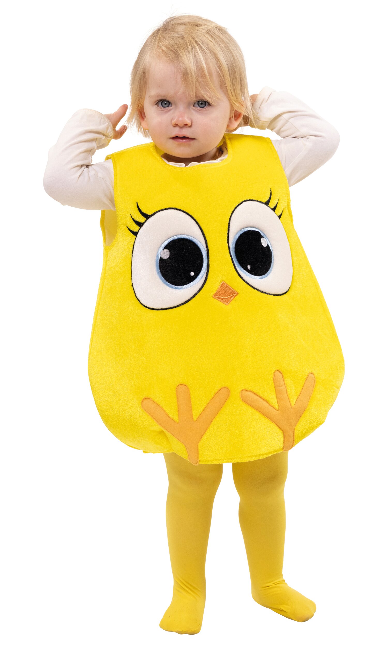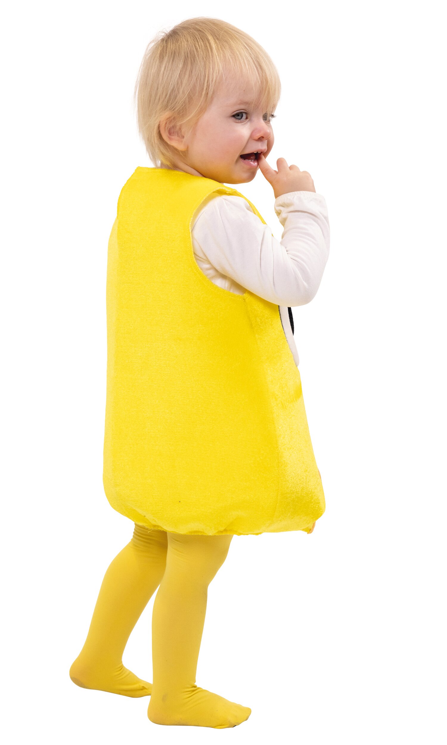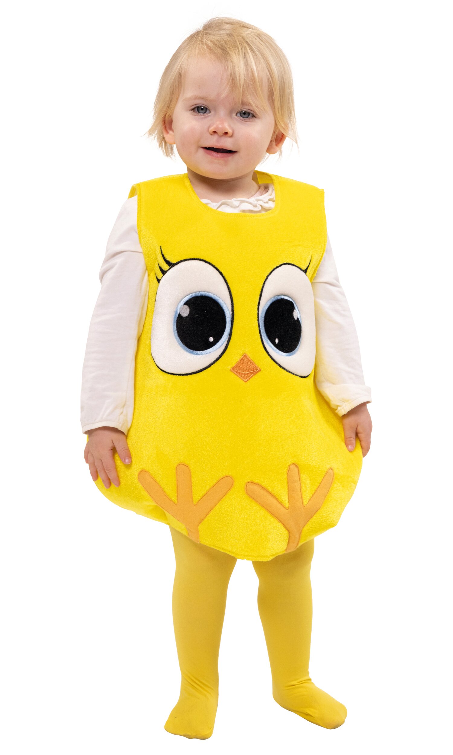 Gelbes, ärmelloses Oberteil zum Überziehen für kleine Küken! Für das niedliche Kostüm wurde besonders flexibler Schaumstoff mit einem Stoff in Nicki-Optik bezogen. Vorn sind große Augen mit Wimpern, ein kleiner Schnabel sowie Füßchen appliziert bzw. gestickt, hinten ist das Kostüm uni gelb. Es wird mit einem Klettpunkt im Nacken geschlossen und erhält durch Abnäher unten eine leichte Eiform.