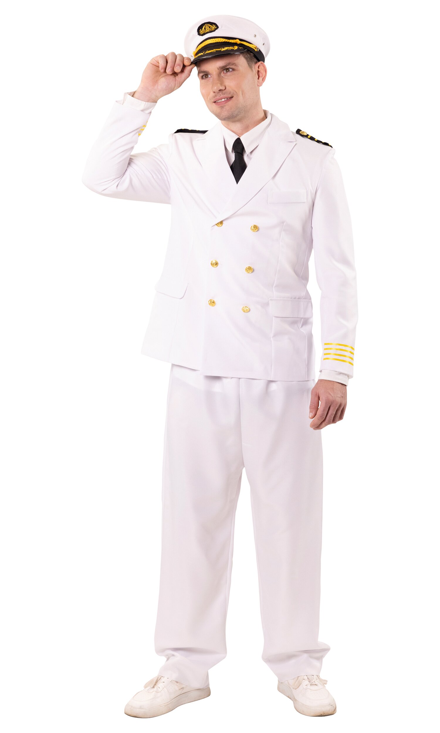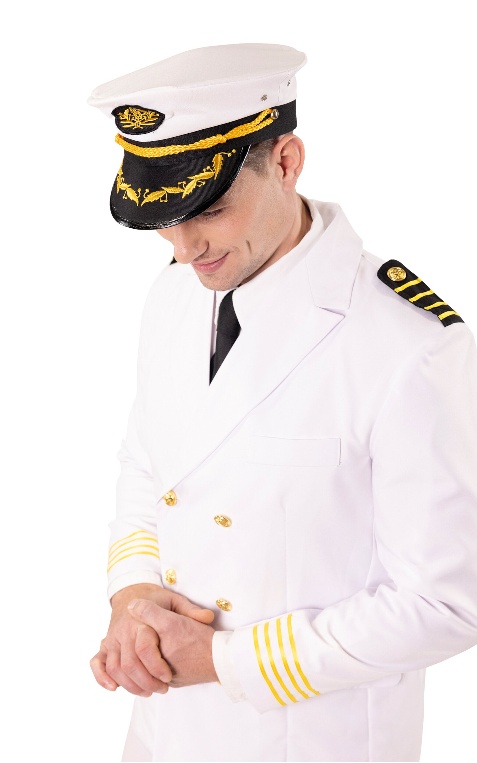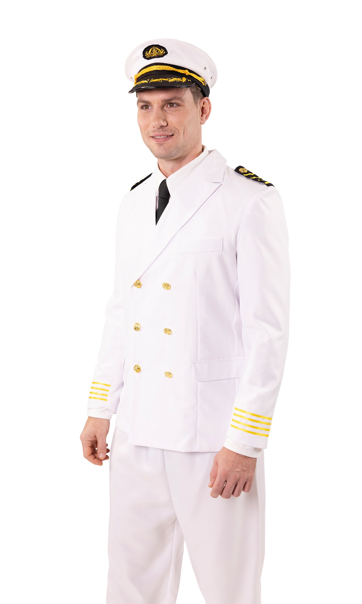 Weißes Kapitänsjackett mit den obligatorischen 4 Streifen auf Schulterklappen und Ärmeln, 3 Taschenlaschen sowie 6 doppelreihig angeordneten, goldenen Knöpfen. Das Jackett ist innen weiß gefüttert und hat einen Schlitz hinten.