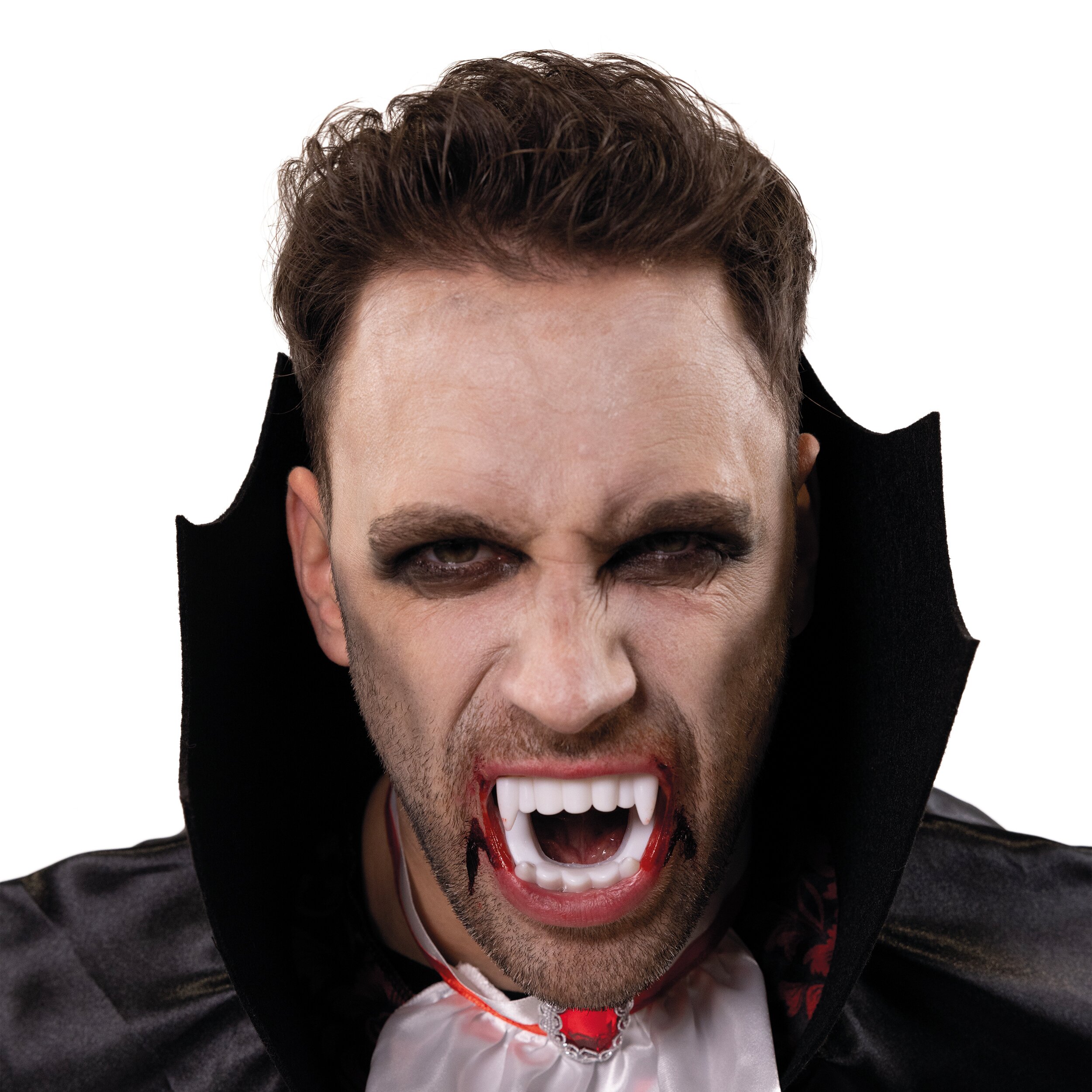 Ein weißes Plastikgebiss mit zusammenhängendem Ober- und Unterkiefer. Inklusive Gebißkleber.