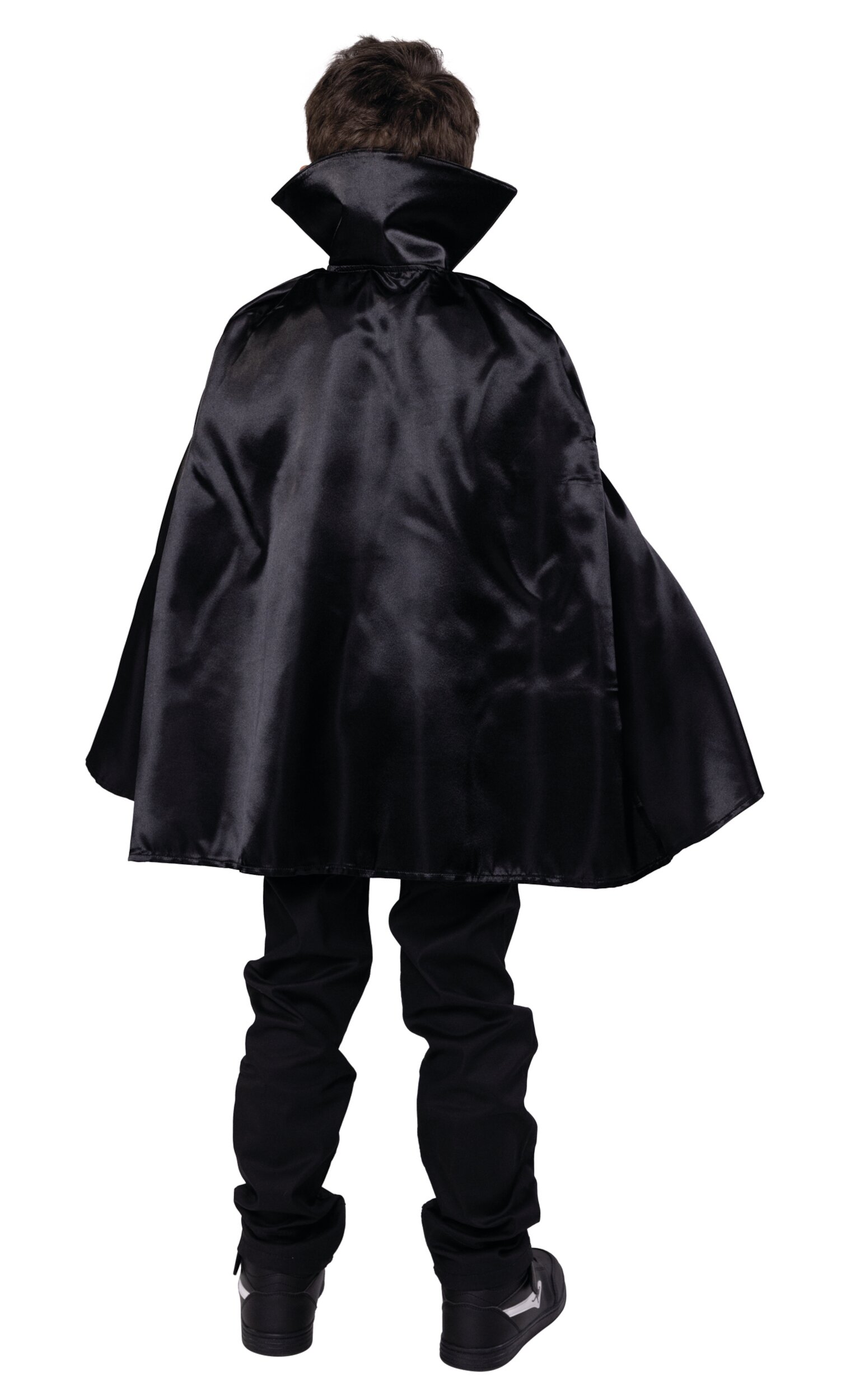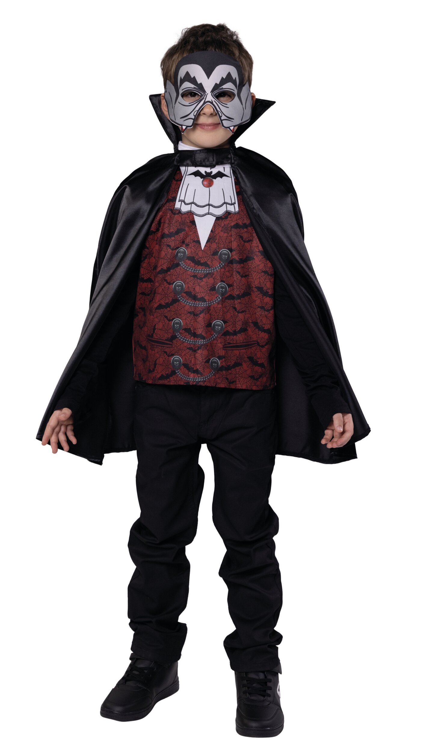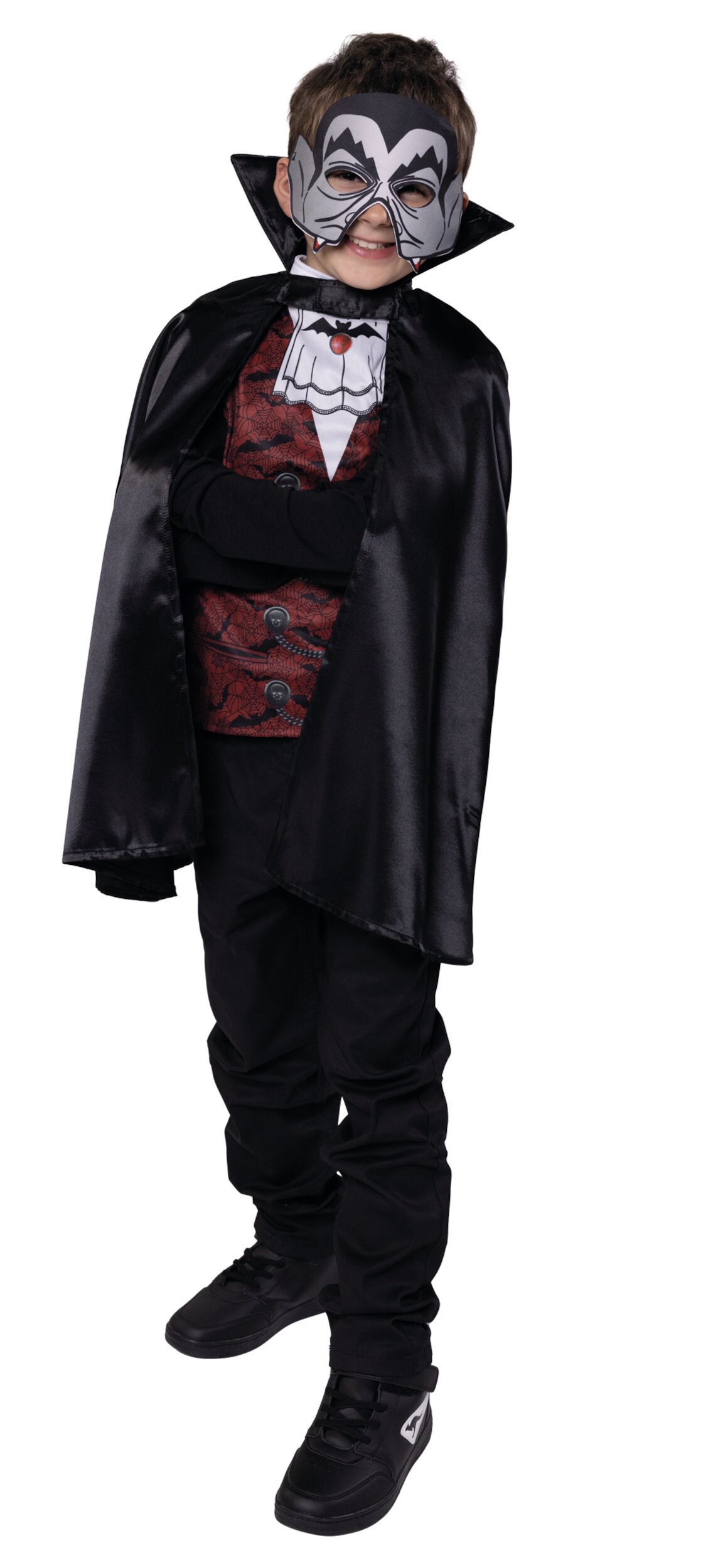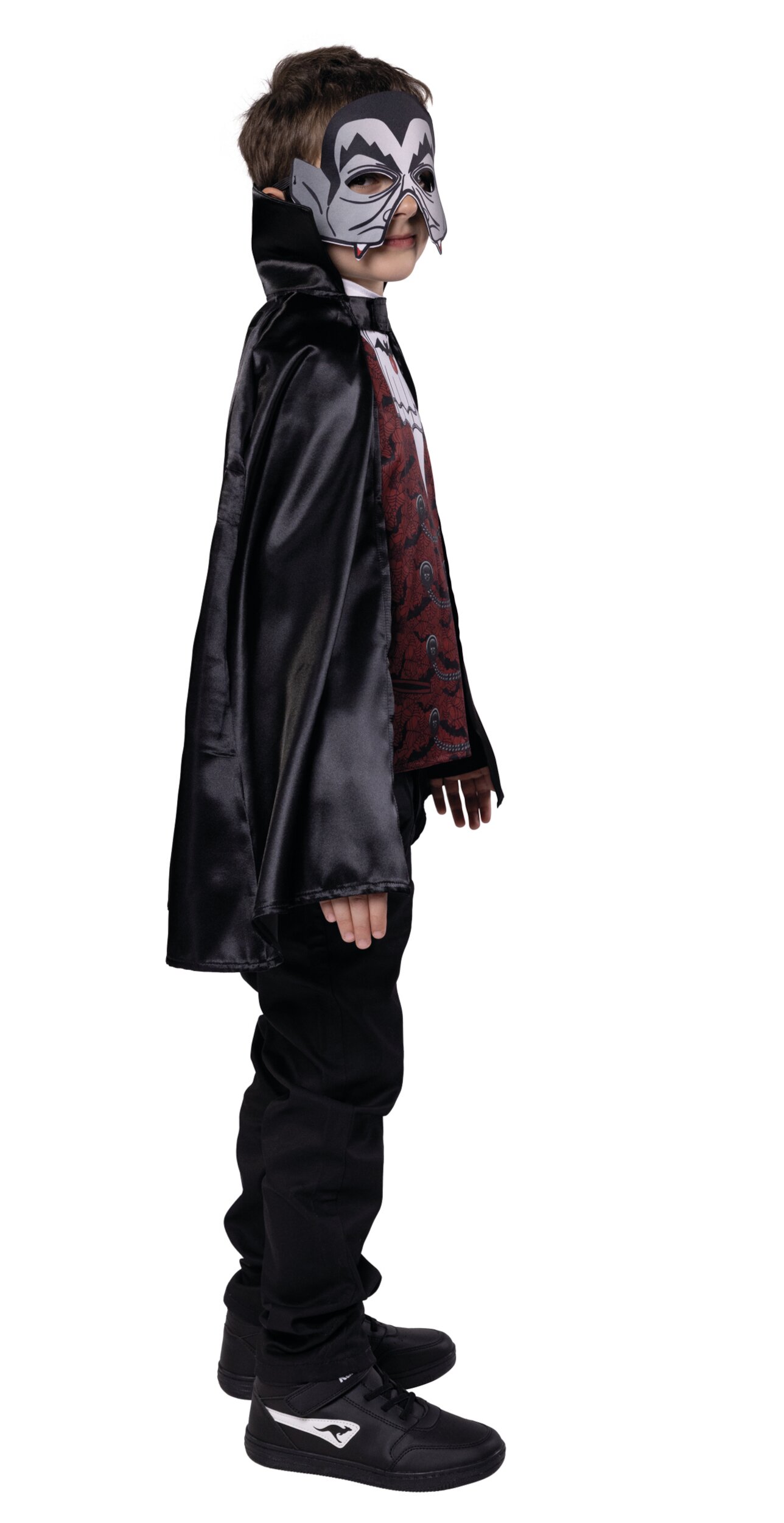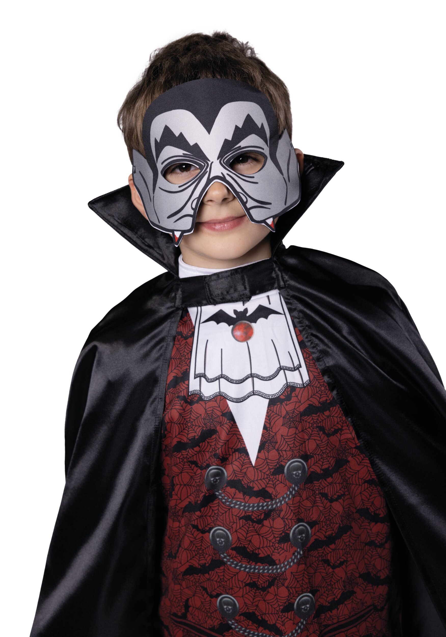 Dreiteiliges Vampir-Kostüm, bestehend aus schwarz-glänzendem Cape, ärmellosem Oberteil und Maske. Das weinrote Oberteil ist einer Weste nachempfunden mit aufgedruckten Spinnen, Spinnennetzen, Knöpfen, Taschen und Halstuch mit Fledermaus. Hinten ist es unirot. Im Lieferumfang enthalten ist eine flexible und weiche Maske, die mit einem Gummizug befestigt wird.