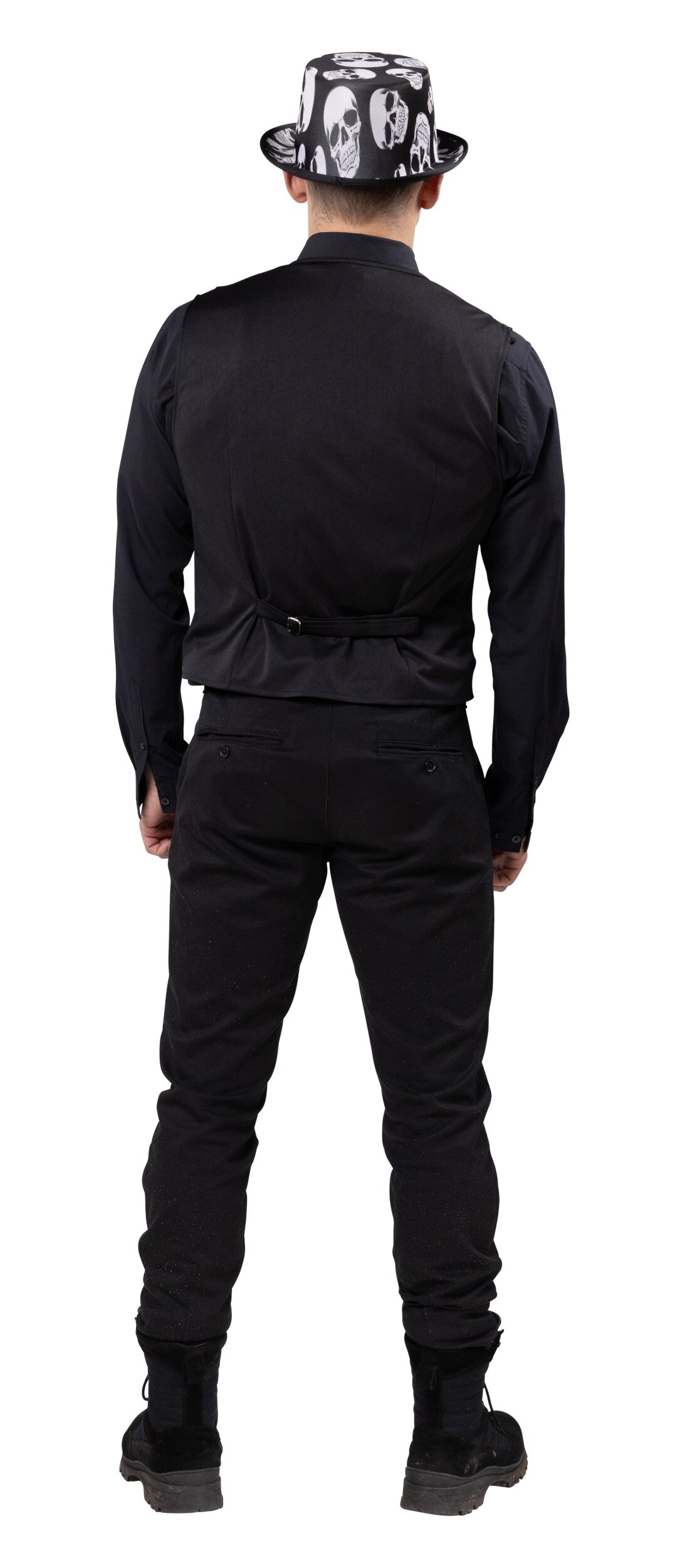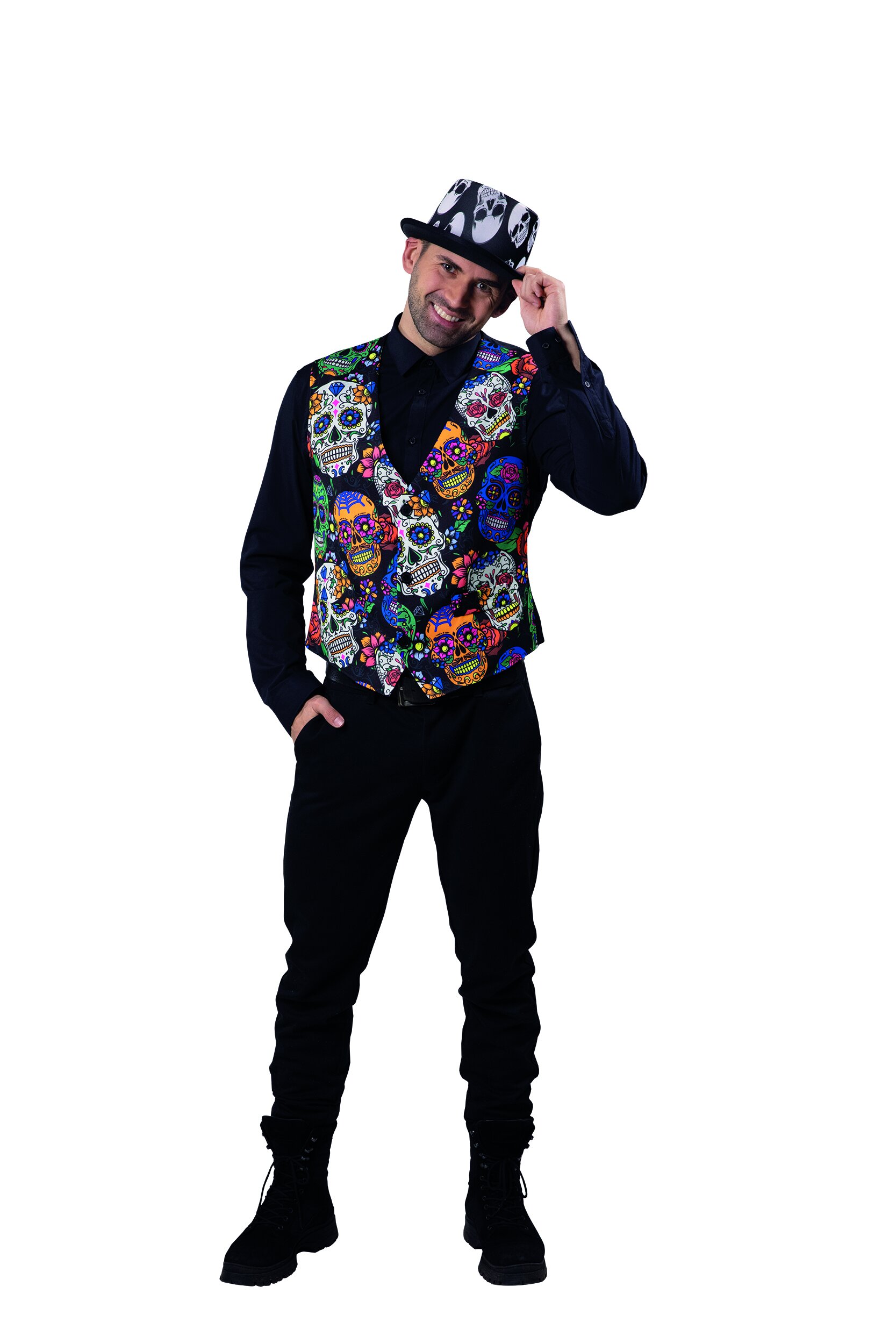 Klassische Herrenweste mit buntem Totenkopfdruck vorne. Die Weste ist hinten uni schwarz und hat einen verstellbaren Riegel. Sie wird mit 3 Knöpfen vorn geschlossen und hat aufgesetzte Taschenlaschen.