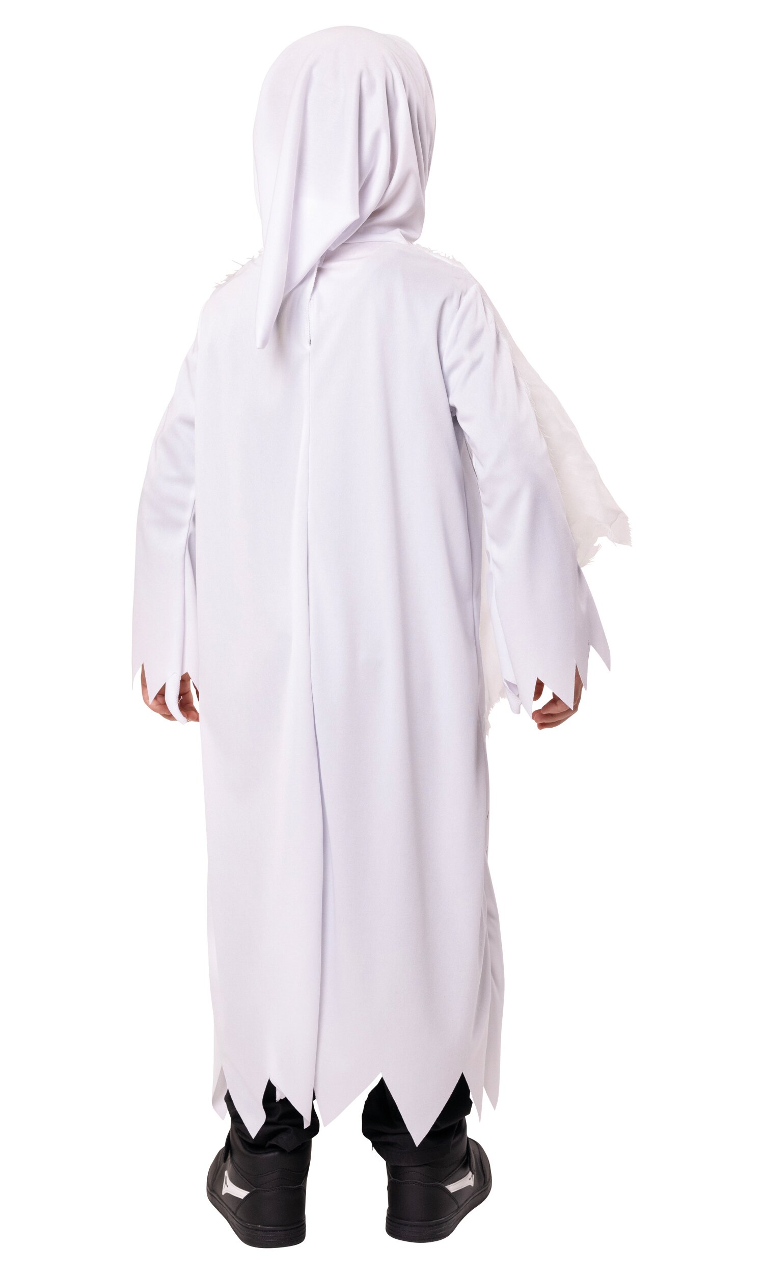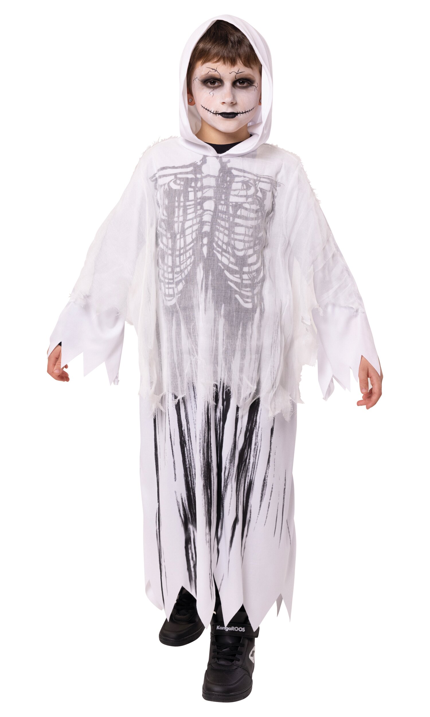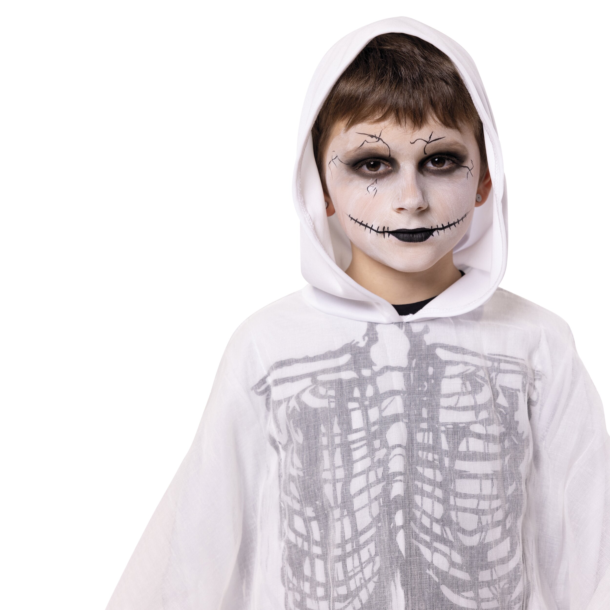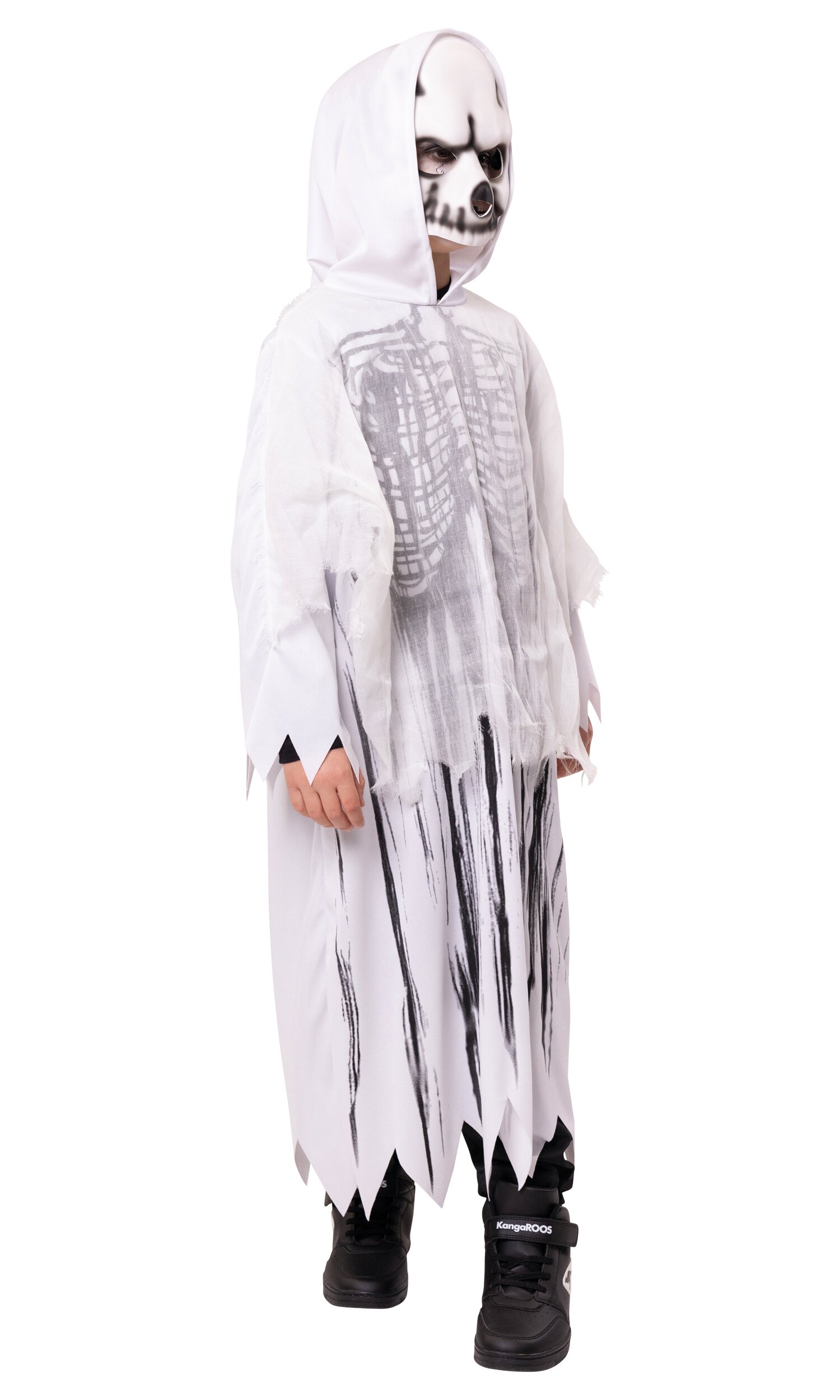 Langes, weißes Kapuzenkostüm für Kinder mit gezackten Abschlüssen an Ärmeln und Robe, auf die in schwarz ein Skelett-Torso aufgedruckt wurde. Vorn ist eine Lage durchsichtigen Gazestoffs aufgenäht, der dem Kostüm einen noch gruseligeren Look verleiht. Es ist hinten uni weiß und wird mit einem Klettpunkt im Nackenbereich geschlossen.