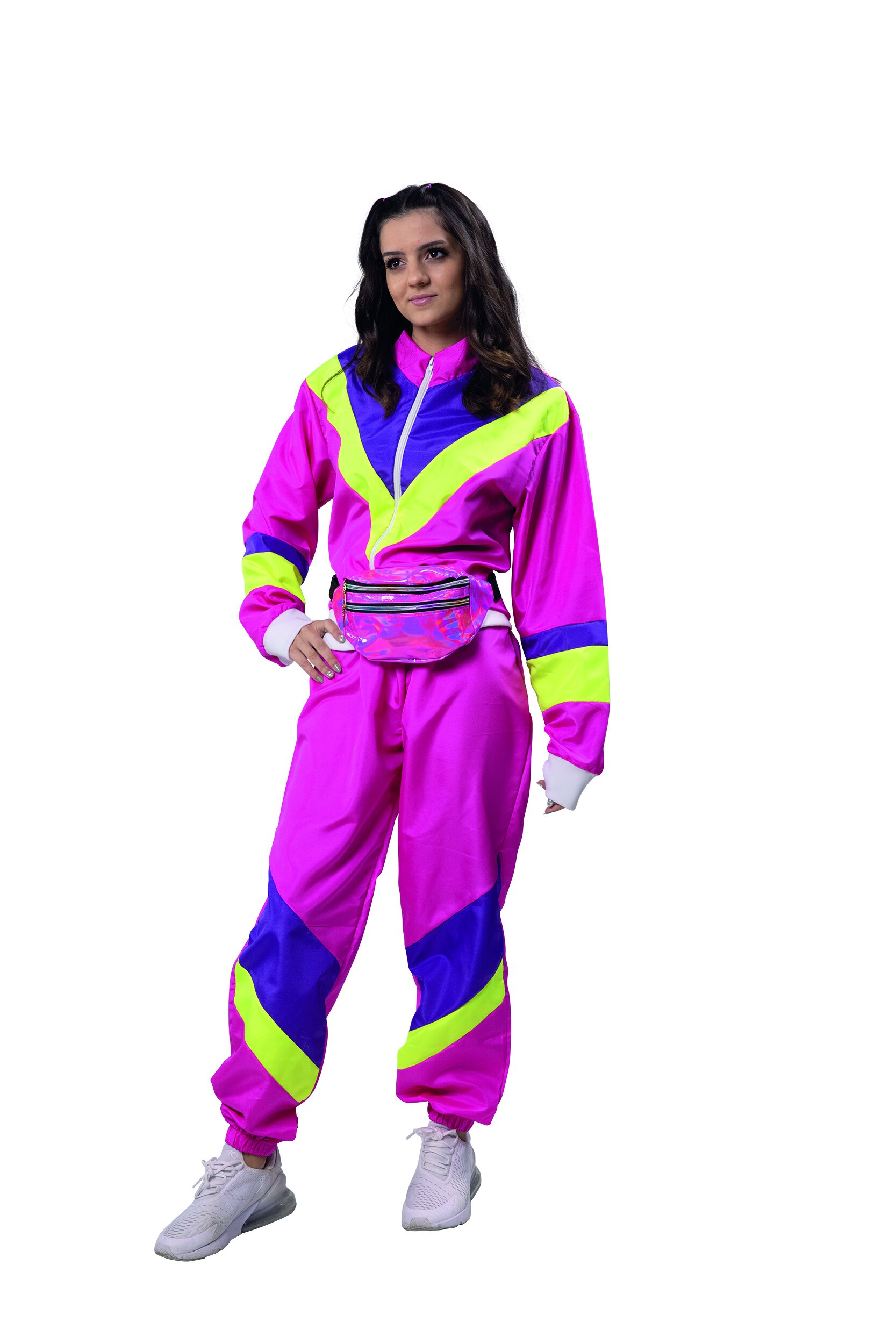 We love the 80s! Shimmering pink bum bag in 80s style. Goes perfectly with our tracksuits or a cool aerobics dress. With two zippers and black waist strap.