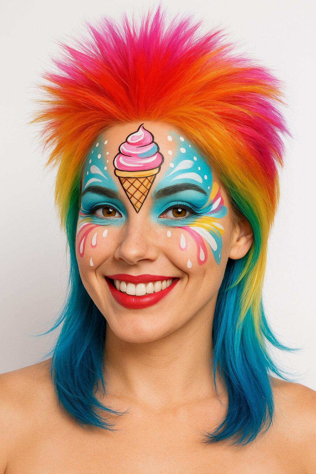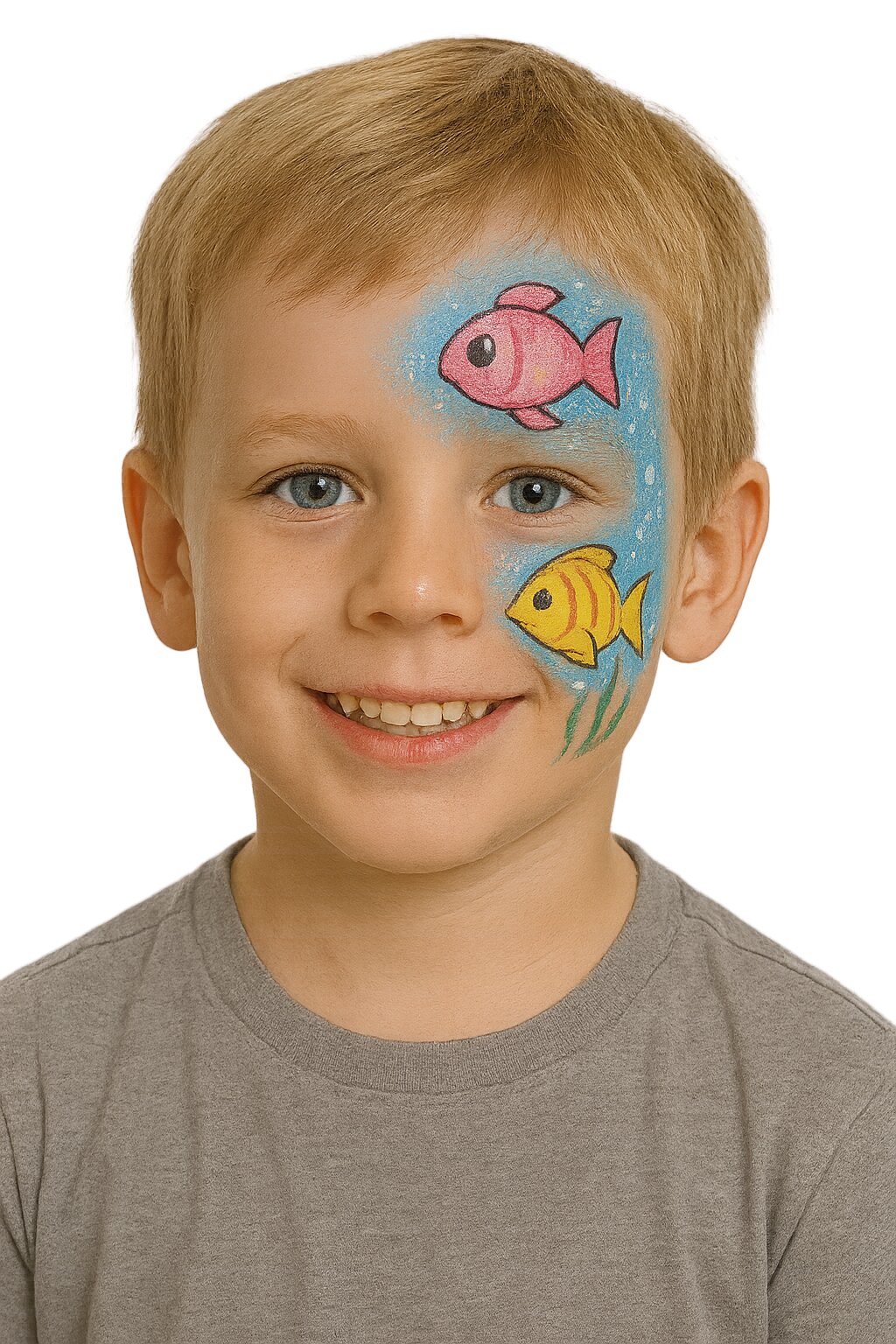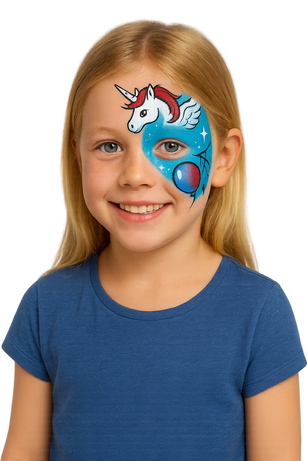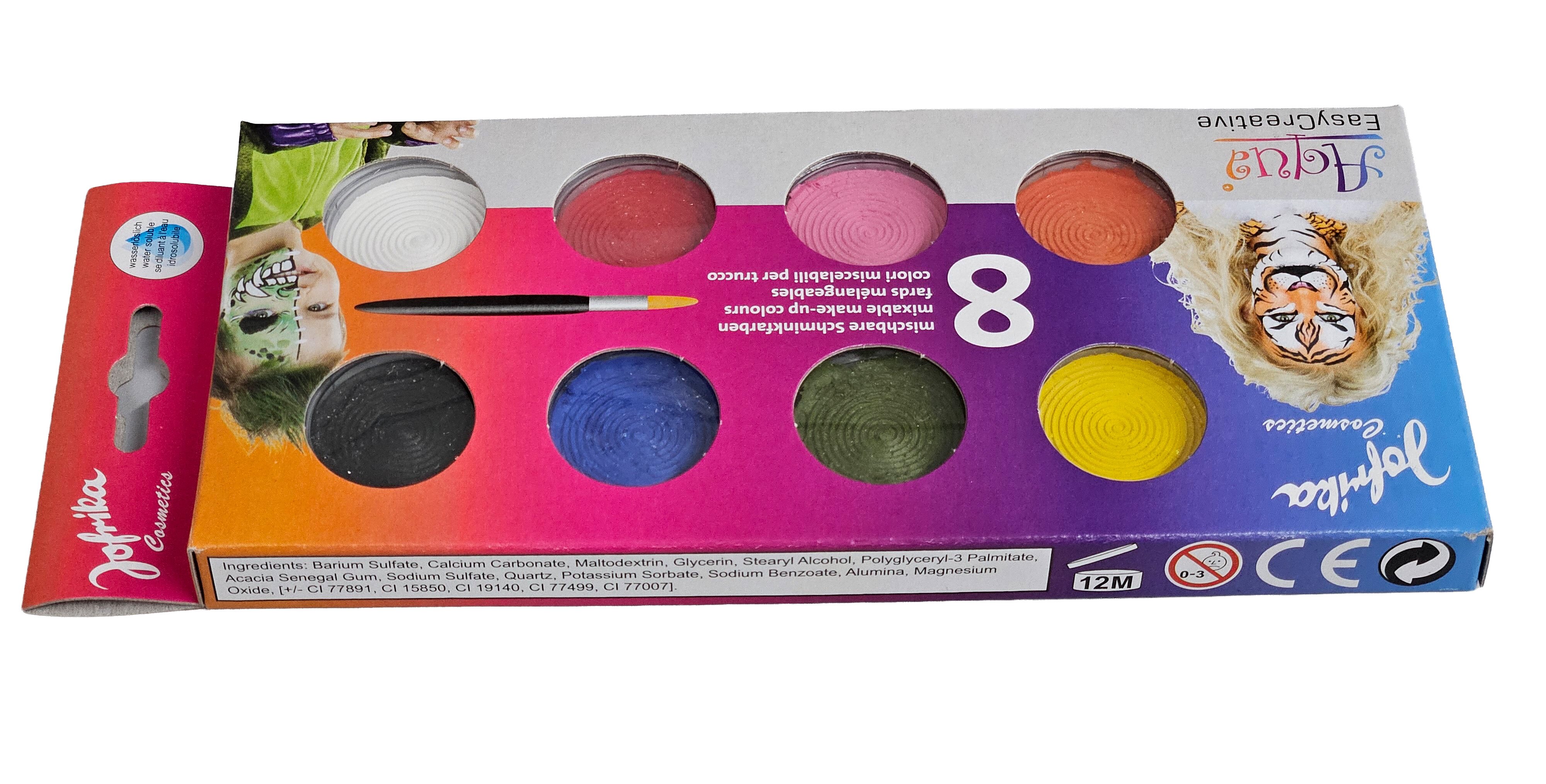 The Aqua Creative Set contains skin-friendly, highly pigmented, water-based makeup in the colors yellow, green, blue, black, orange, pink, red and white. The makeup is blended with a little bit of water and then applied using the enclosed brush. The different colors are suitable for mixing. Smudge-proof and non-greasy when dry. To remove use soap and water.
