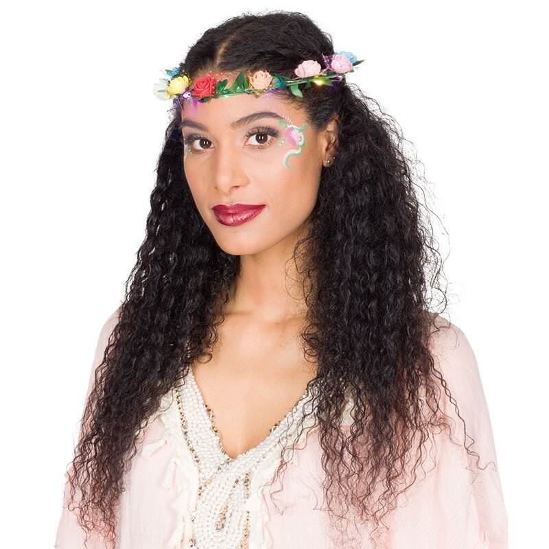 Hair-band that is adorned with fabric flowers. Small LED lights are incorporated in a clear plastic tube. Batteries are included.
