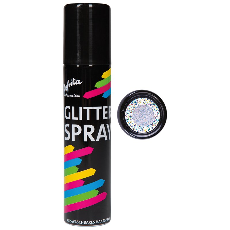 Silver glitter hair spray with a gloss. Washes out with shampoo and water.
