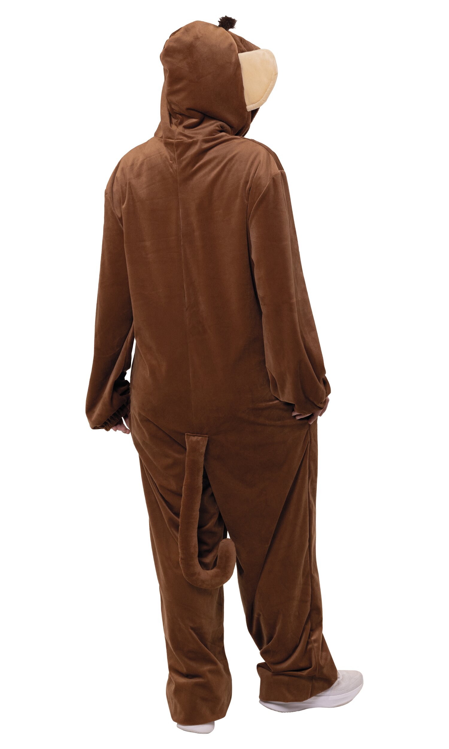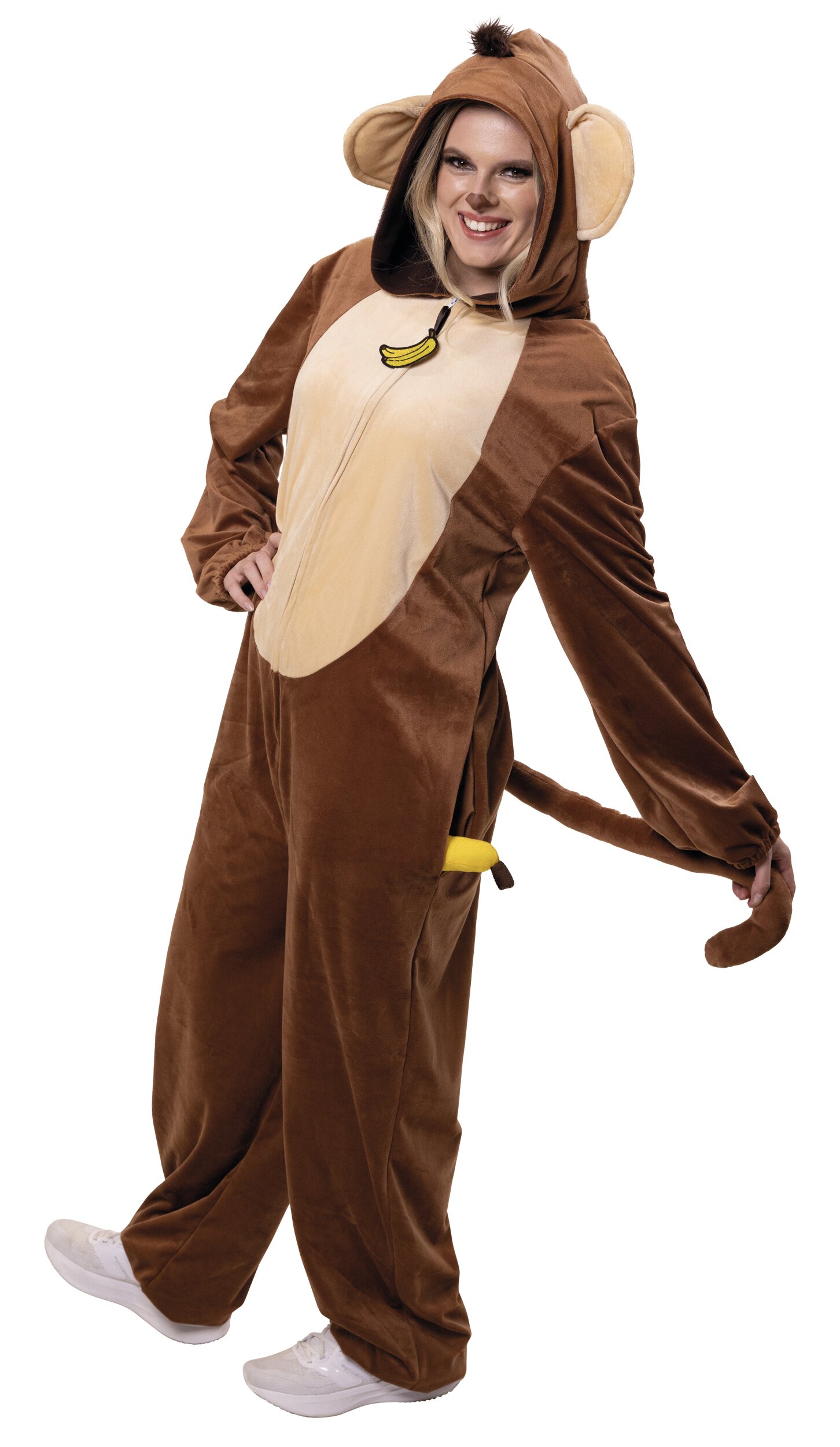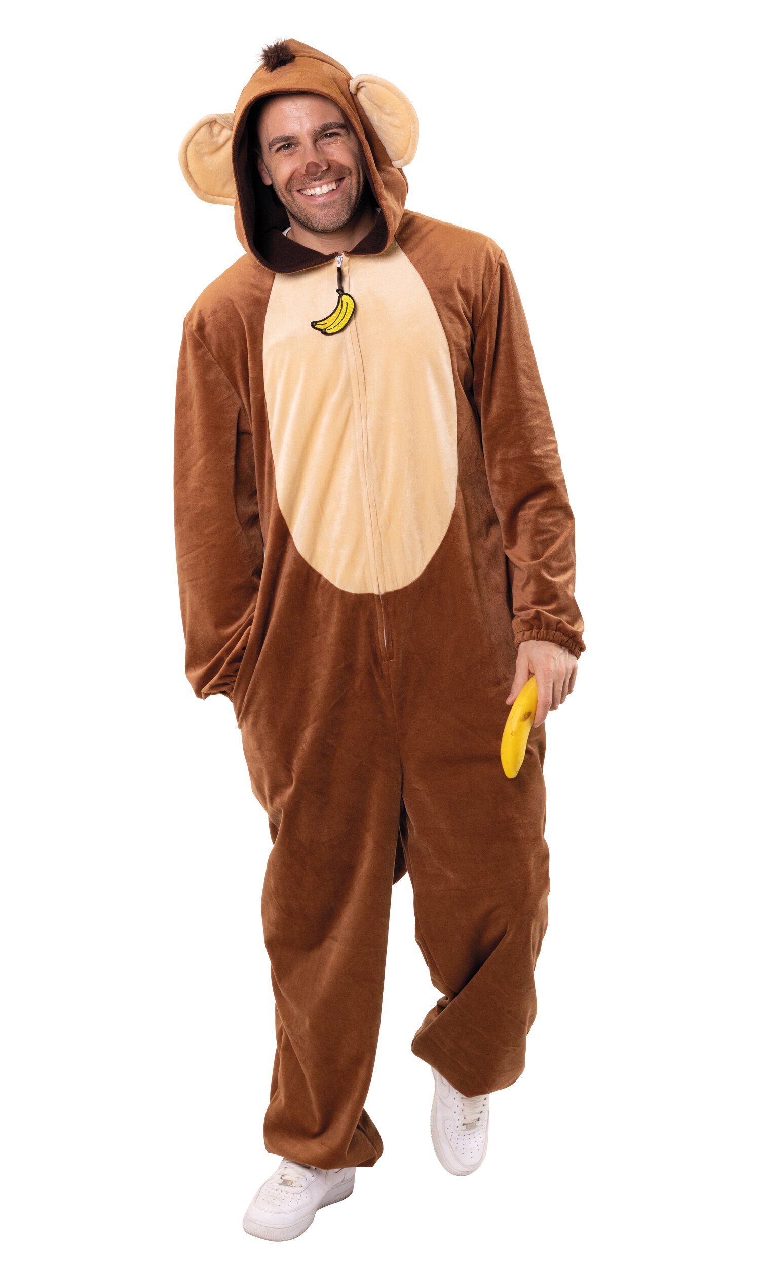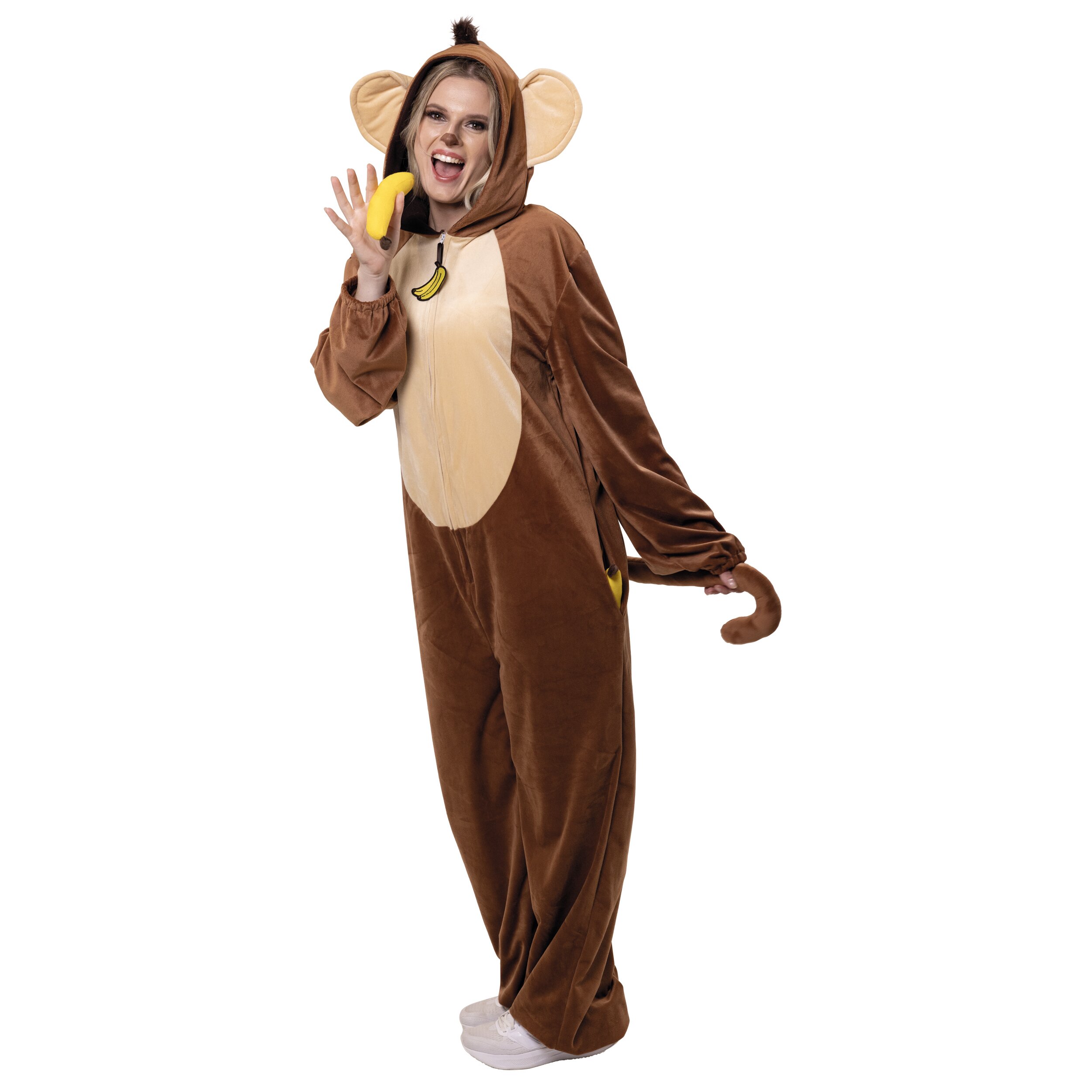 Mit dem Affenkostüm wird jede Party zur Dschungel-Show! Der braune Jumpsuit ist bequem zu tragen und leicht anzuziehen. Der Reißverschluss ist mit einem witzigen Bananen-Motiv verziert – ein extra lustiges Detail. Die Kapuze ist mit großen Ohren und kleinen Haarbüscheln ausgestattet und rundet den tierischen Look perfekt ab.