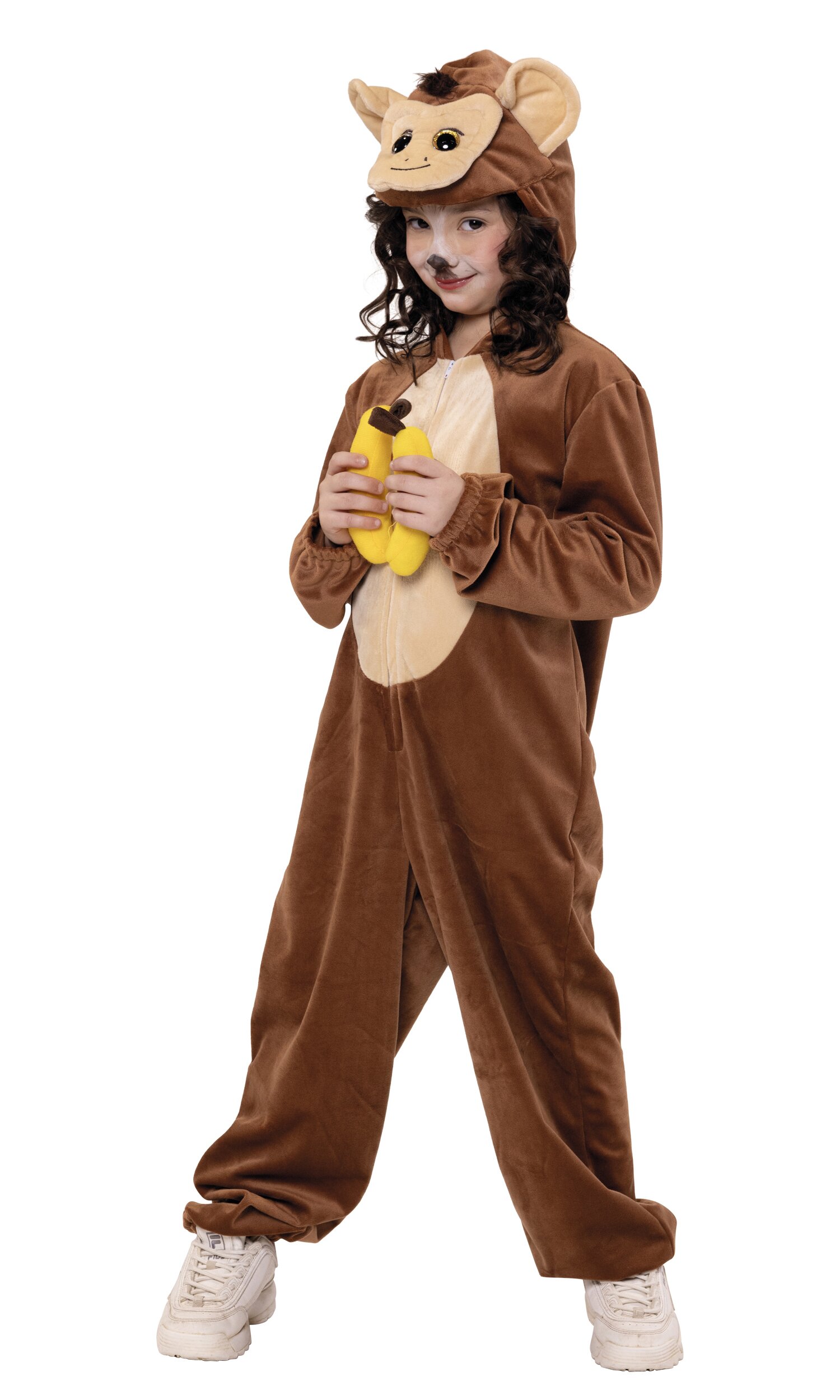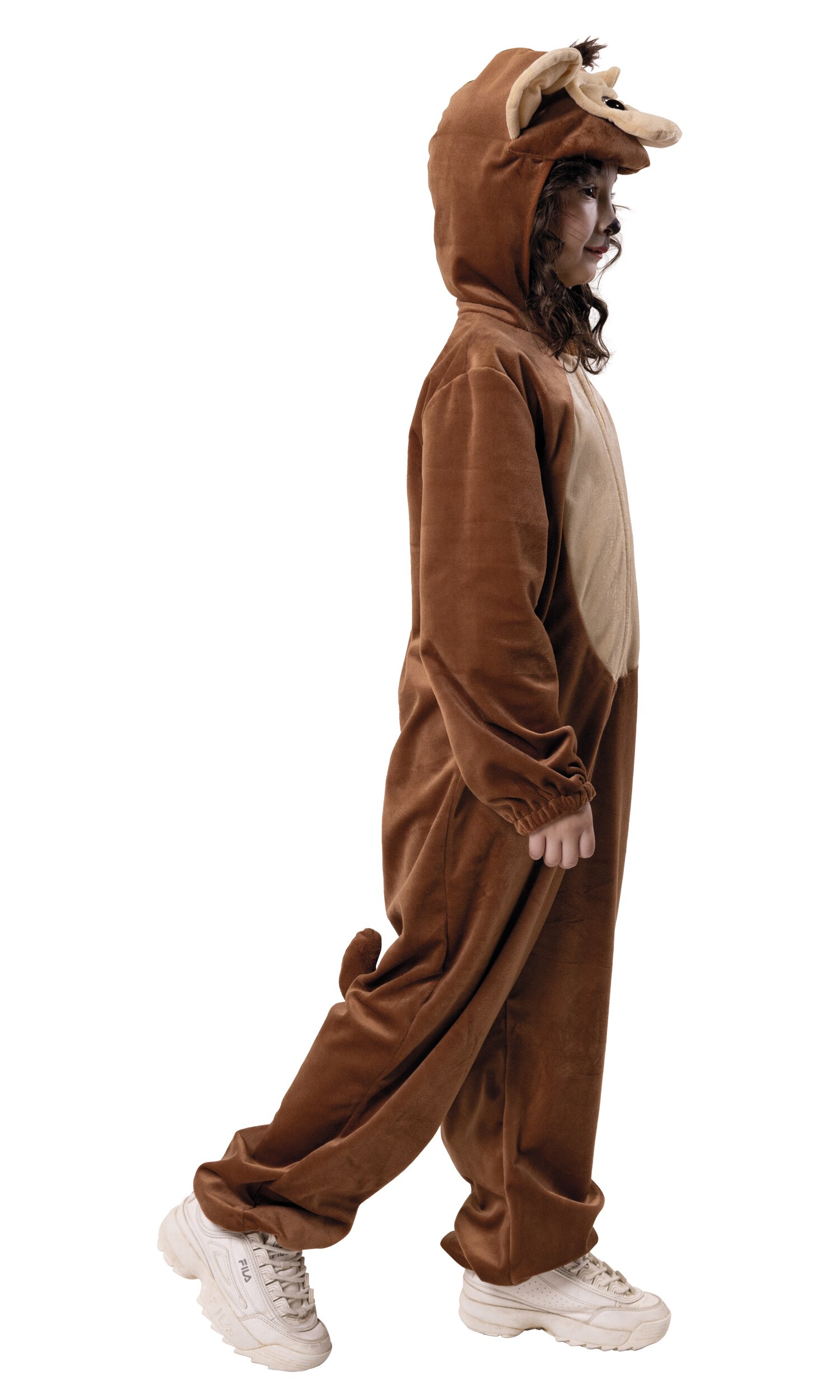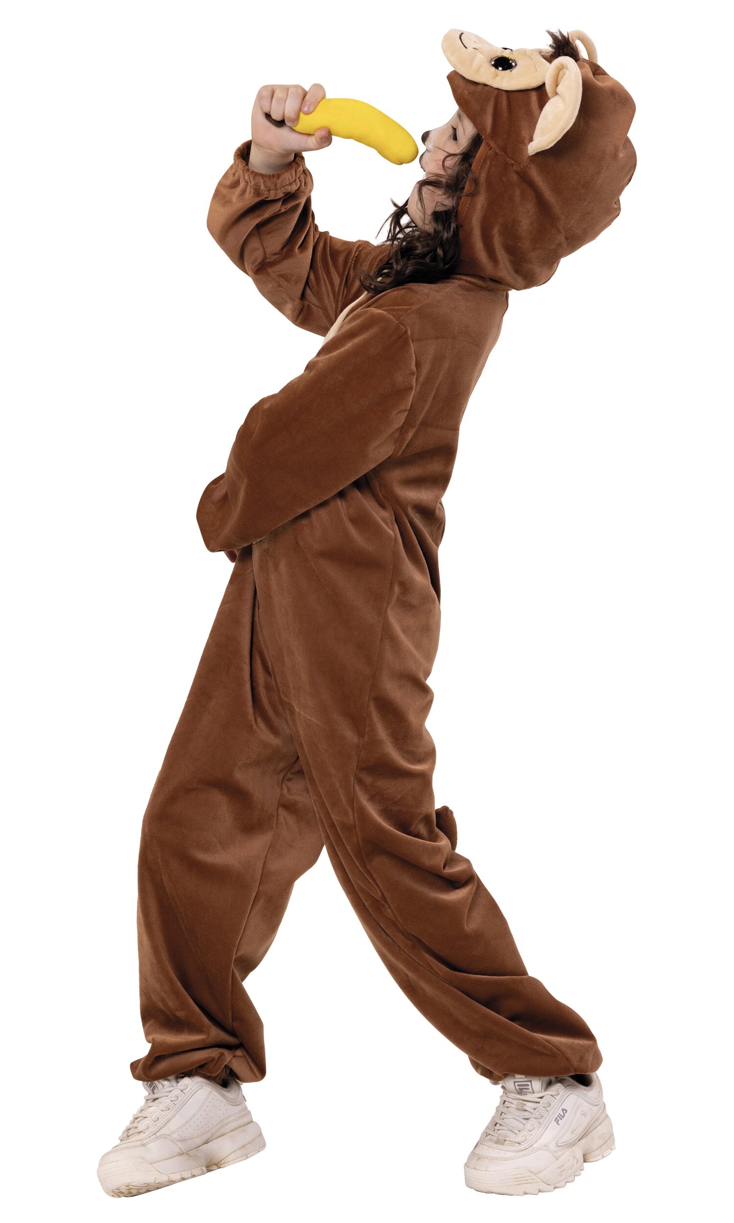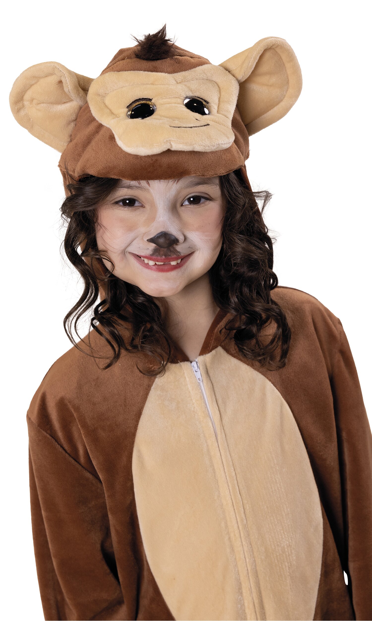 Cuddly hooded jumpsuit for children with monkey face. The jumpsuit is made of brown short-haired plush with a beige insert on the belly. It closes with a zipper at the front and has a little tail attached with Velcro at the back. The hood is decorated with a cute monkey face and ears. For adults, we have a matching monkey jumpsuit, “Monkey Coco Jumbo” #14145.