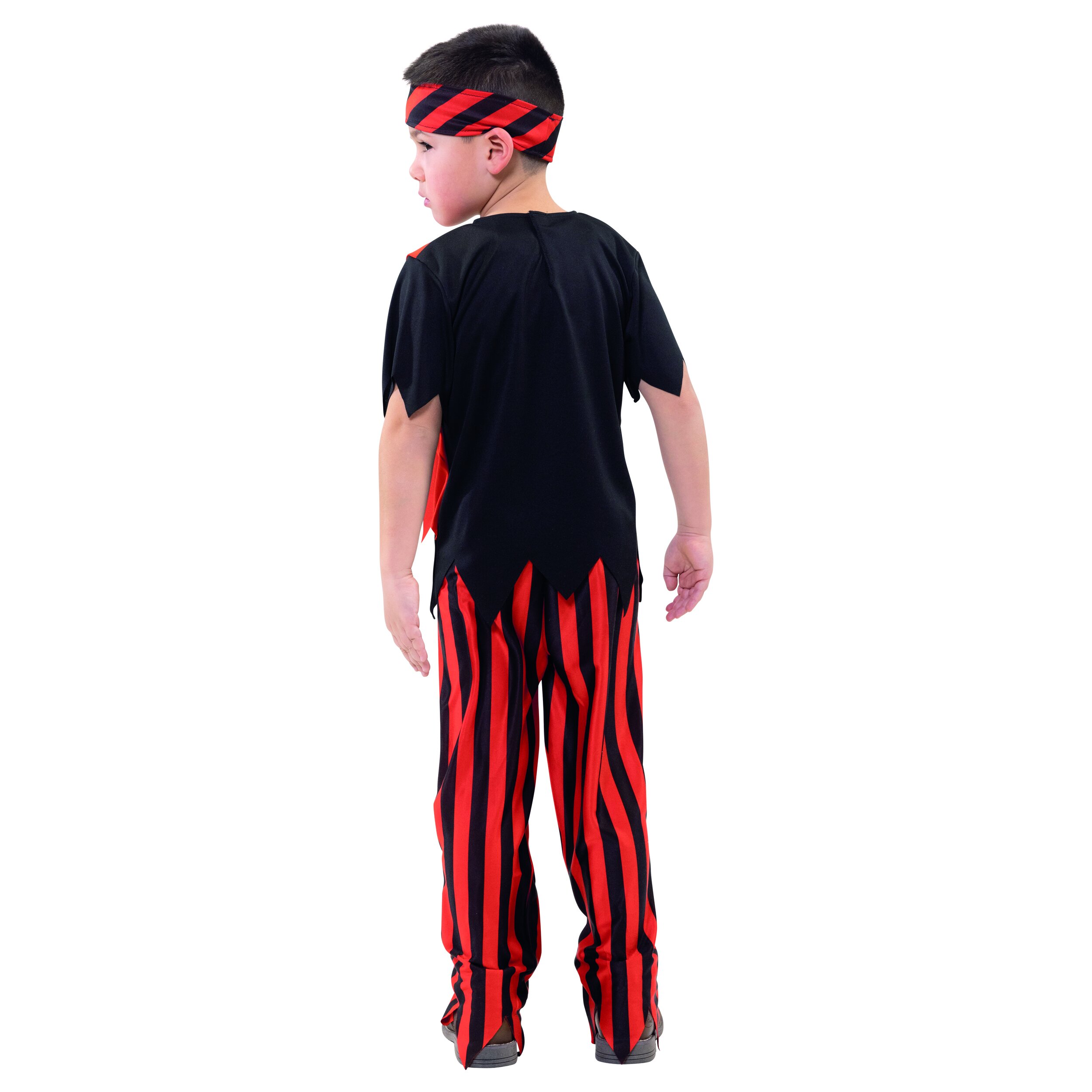 Three-piece pirate costume, consisting of a top, trousers and headband. The black top has short sleeves and red fabric stripes at the sides that suggest a vest with spikes. There is a printed belt in the middle and a typical skull print with crossed sabres. The back is plain black and there is a Velcro dot at the back of the neckline. The black and red striped trousers end in a jagged shape, just like the top. The headband is made from the same material as the trousers.
