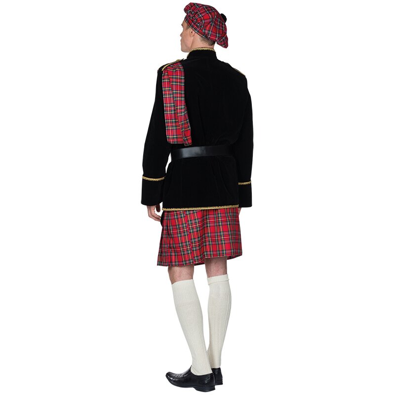 Scot's costume whose black velveteen jacket is adorned with golden trim and buttons. The skirt, the sash and the traditional bonnet have a red checkered tartan pattern. Includes a black belt with a golden buckle and a pouch (sporran) that is attached to the skirt.