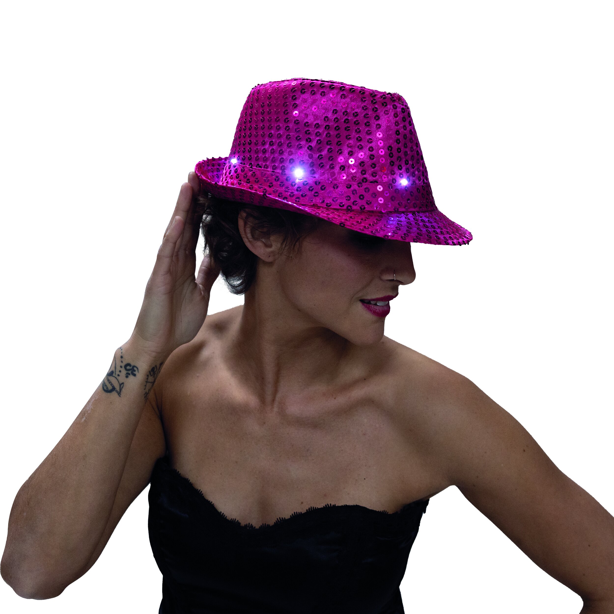 Pink fedora hat decorated with sequins and small flashing lights. Batteries are included.