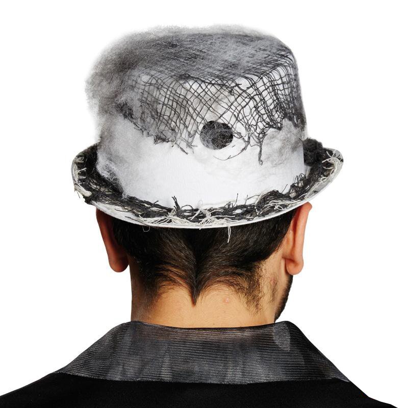 Dingy white top hat, that is adorned with black mesh fabric and spider ornaments.