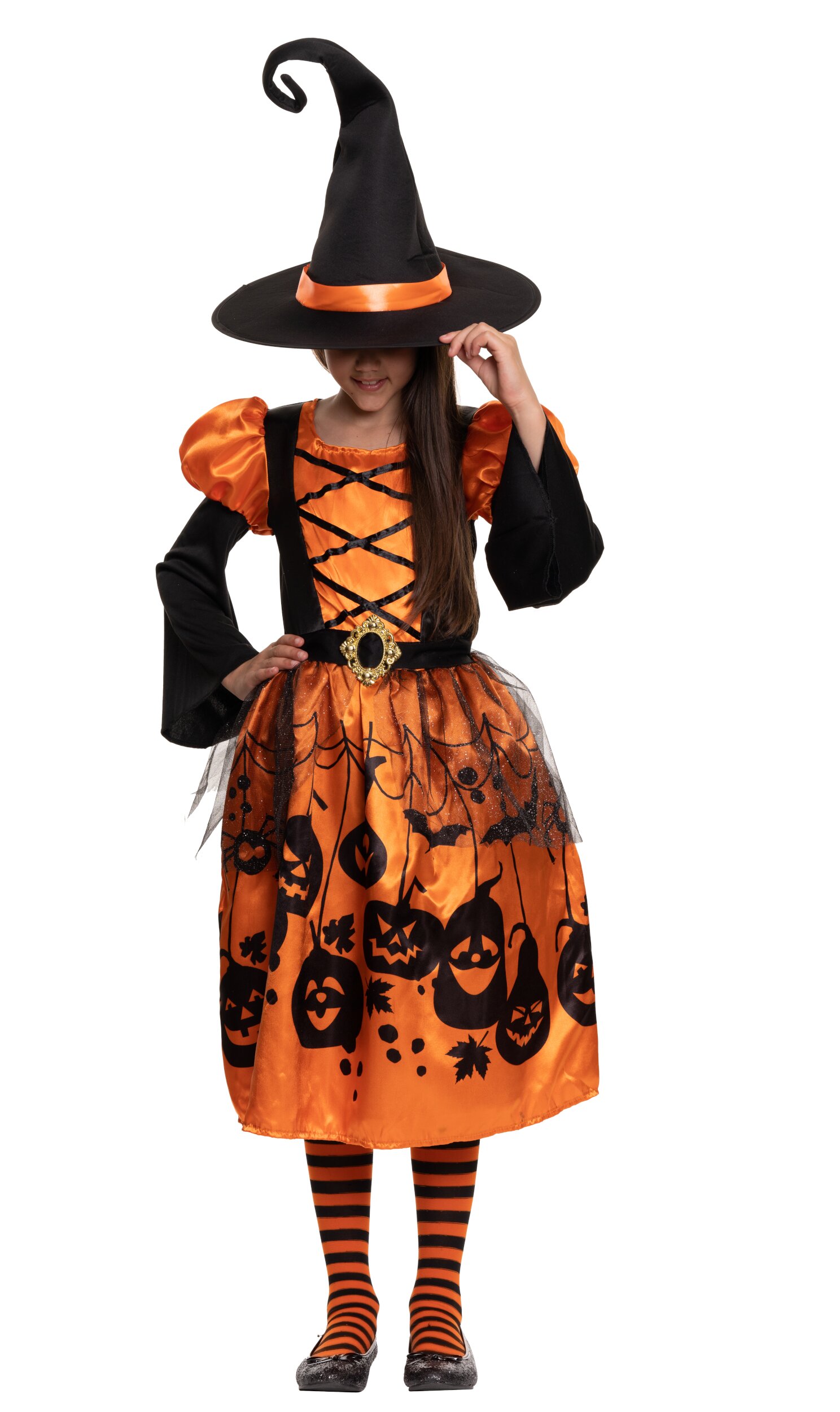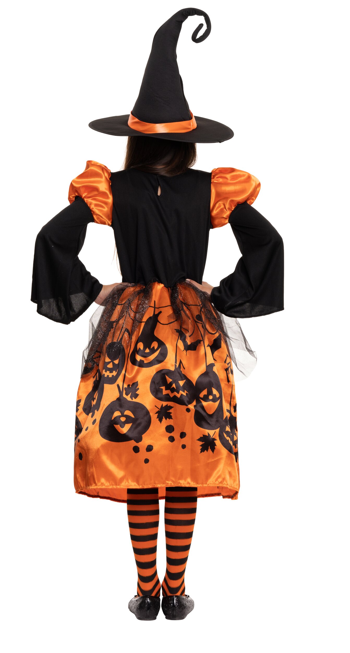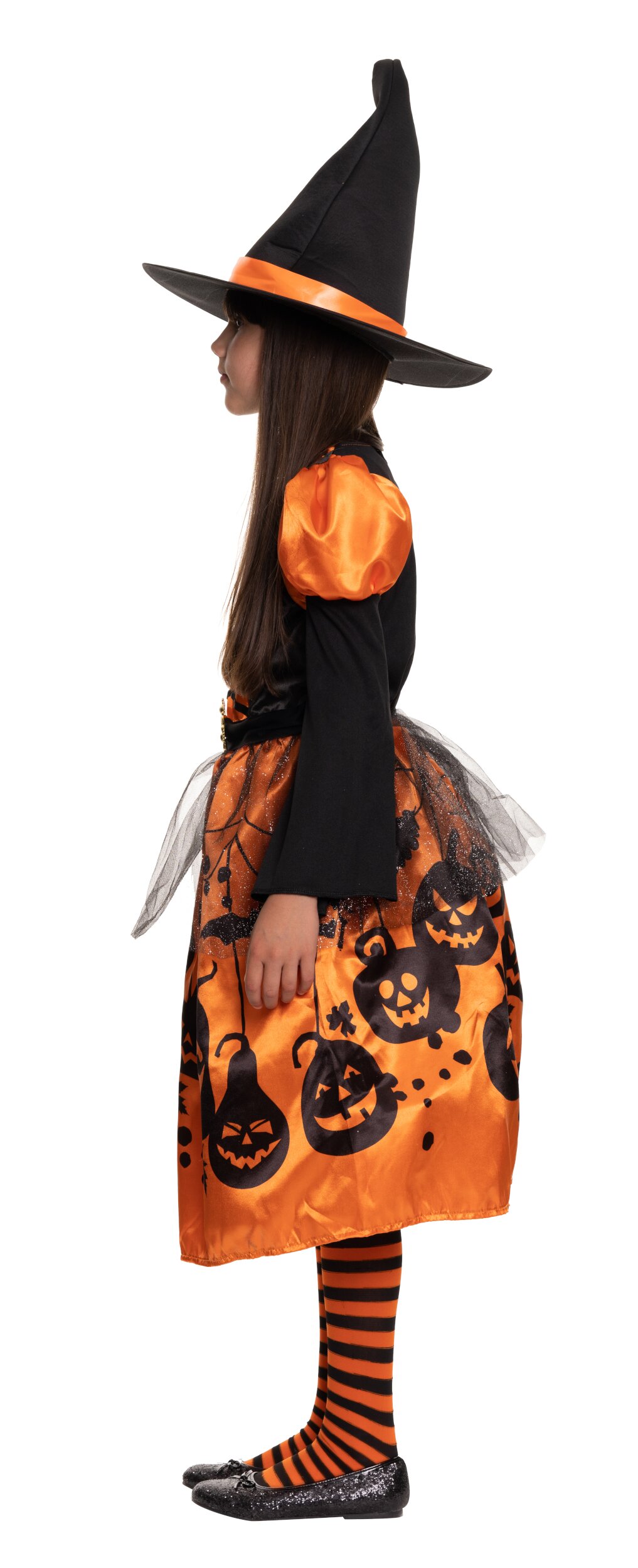Elaborately crafted witch dress in black and orange with shiny puff sleeves that turn into trumpet sleeves. The top is black and has an orange insert at the front with a hint of black lacing. The multi-layered skirt is orange and printed with Halloween motifs. There is a shorter layer of black tulle on top. A pointed witch's hat with an orange hatband is included.