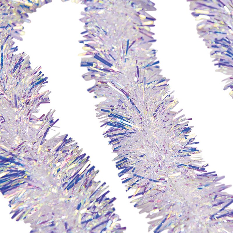 Approx. 1.80 m long, iridescent decorative garland made of tinsel strips that shimmers white, purple and blue.