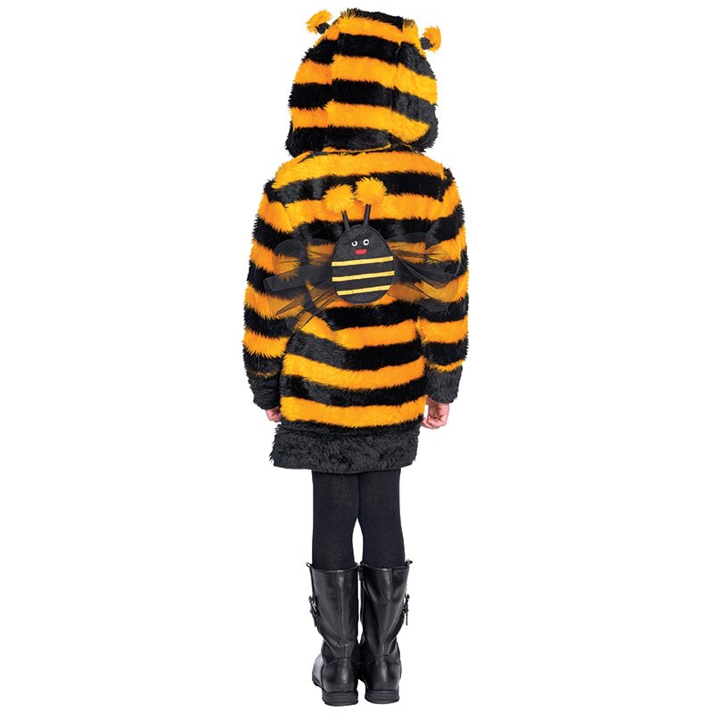 Hooded dress made of soft, yellow and black striped plush. Antennae with pom-poms are sewn onto the hood. The dress is trimmed with black fur on the hood, chest and hems. A removable bee figure with black tulle wings is attached to the back.
